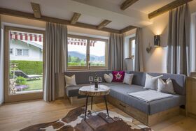 Die Terrasse und Liegewiese auf der Sonnenseite bieten Ihnen einen herrlichen Blick auf den Hartkaiser, Ruhe und Erholung in ihrem Urlaub – Liegestühle und Sitzmöglichkeiten sind selbstverständlich für Sie da.