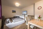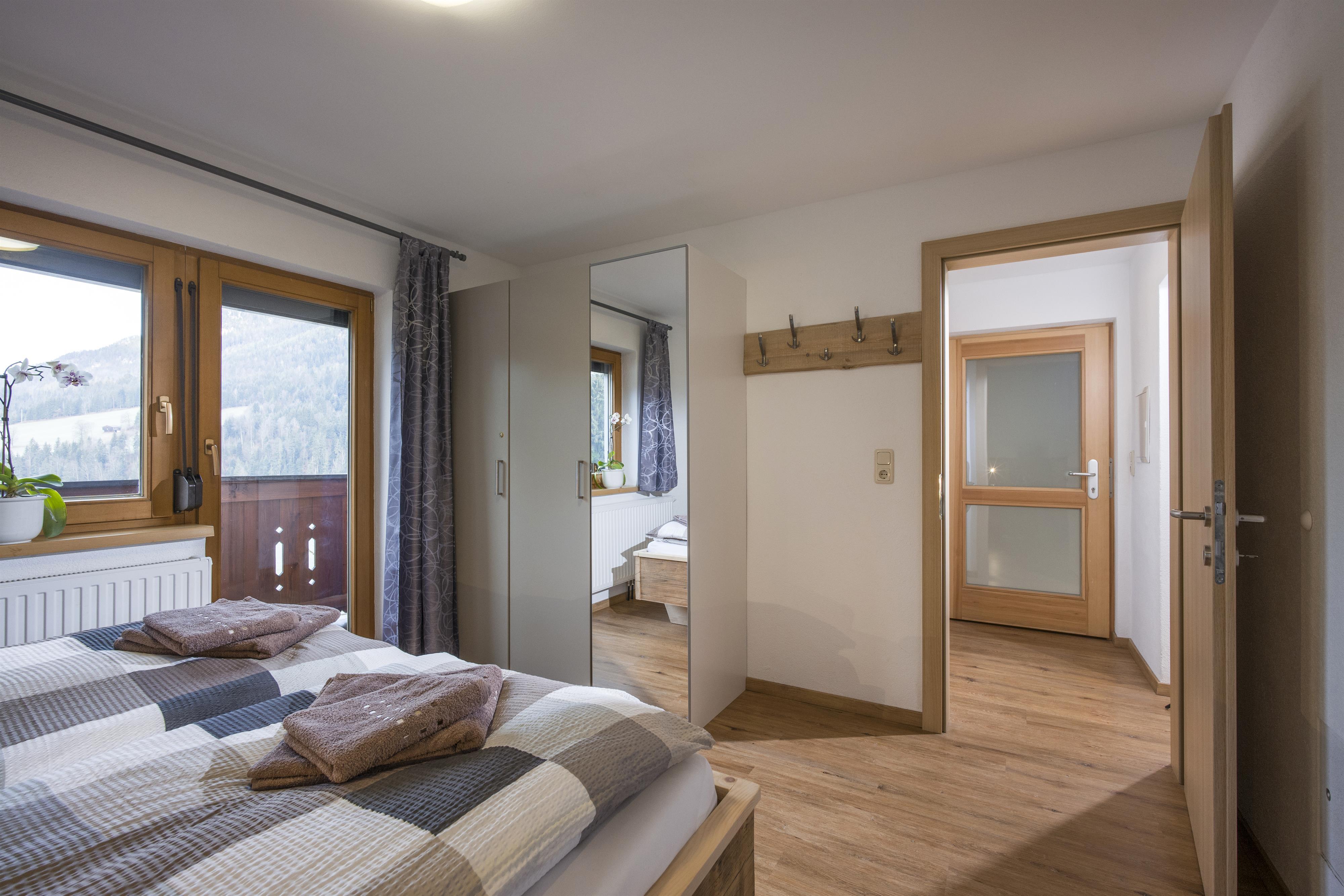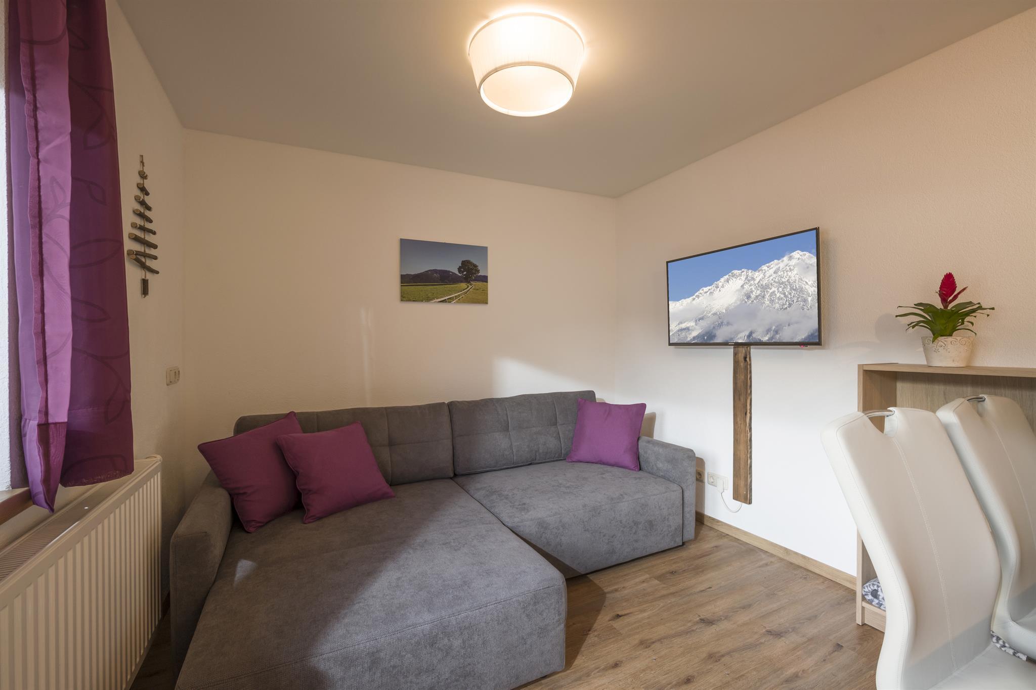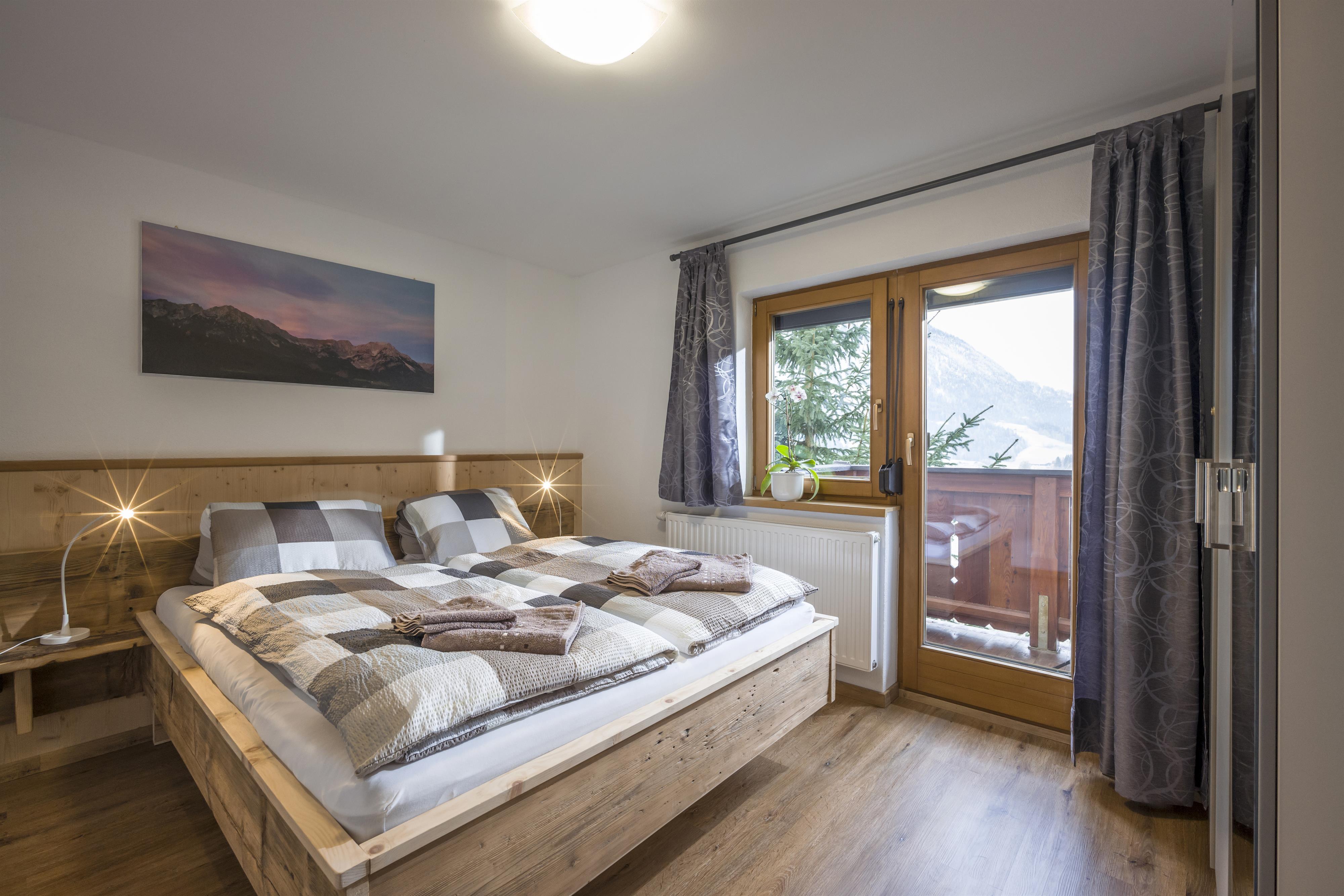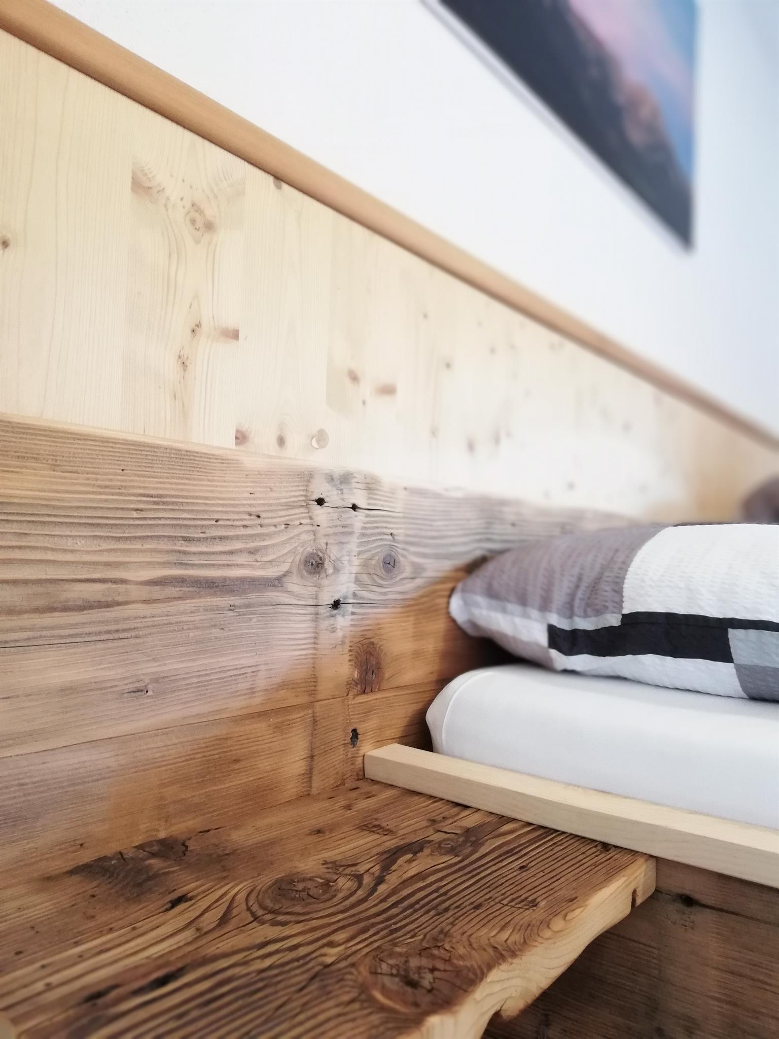Sehr modern und gemütlich eingerichtet, bieten wir ein Schlafzimmer mit selbstgemachten Altholzbett mit Zirbenumrandung, für einen erholsamen Schlaf. Die Kombination mit Schlafcouch und Wohnküche bietet genug Platz zum genießen.