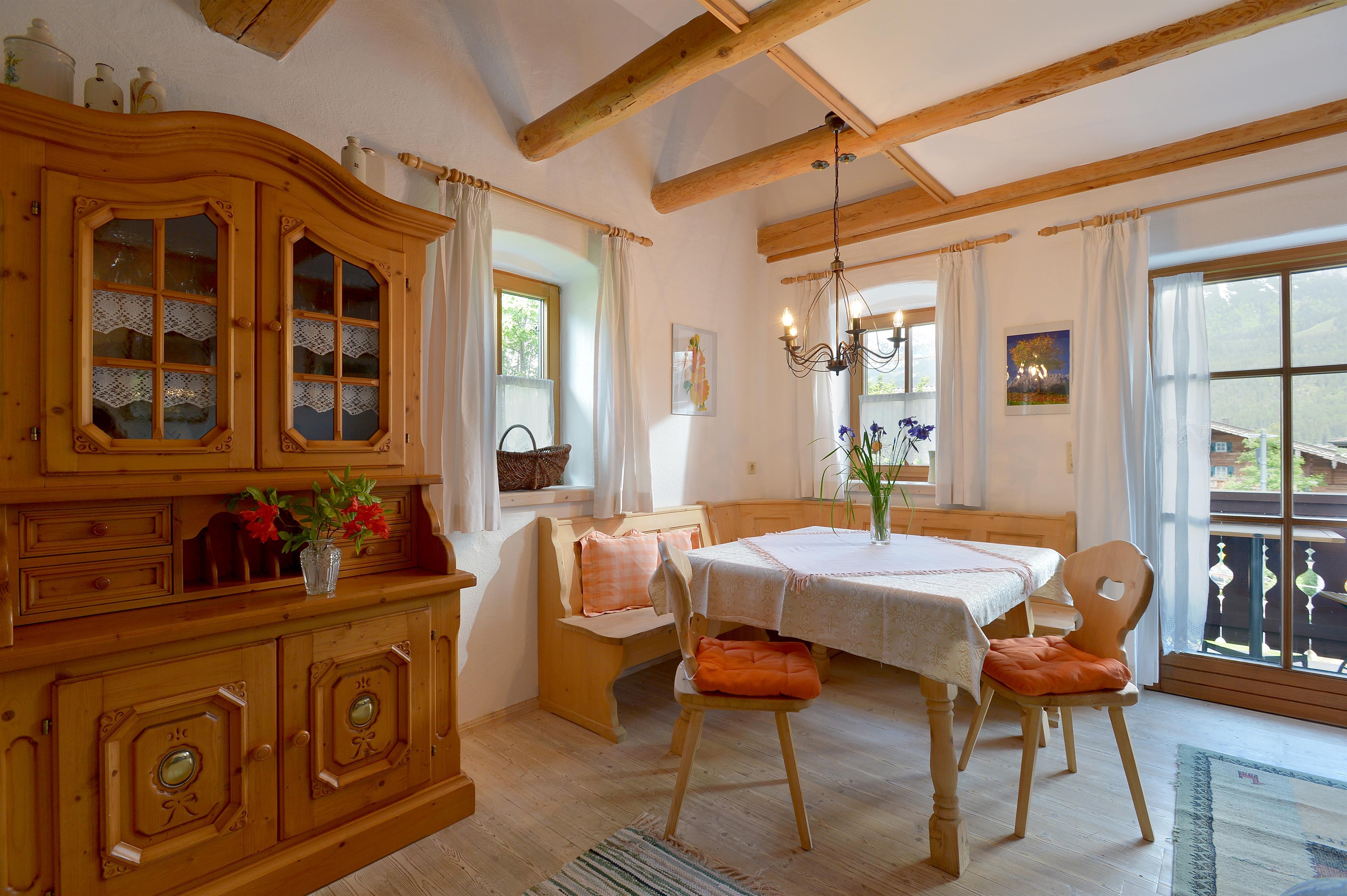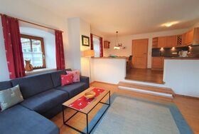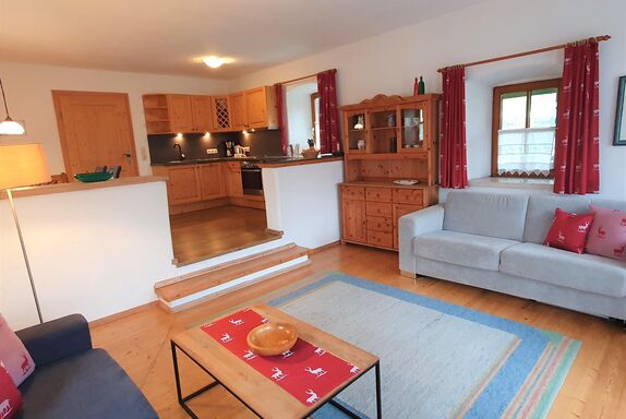 Das ebenerdige Appartement verfügt über einen offenen Wohnbereich mit gemütlicher Wohnlandschaft, großer Essecke und Tiroler Landhausküche.