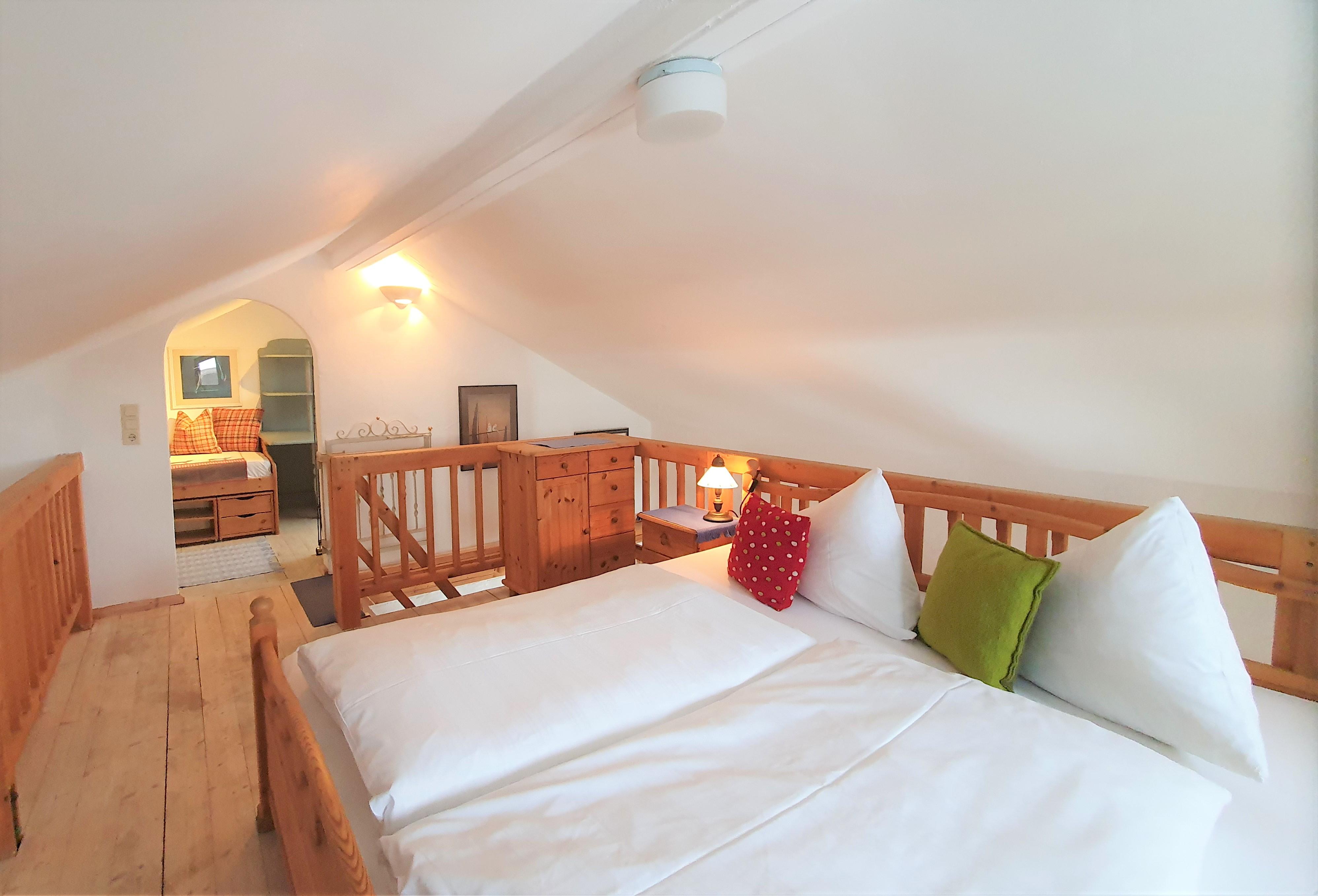 In der „Goldmelisse“ steht Ihnen ein Schlafzimmer mit Doppelbett und einem ausziehbaren Einzelbett zur Verfügung. Sollten Sie mit mehreren Personen anreisen, gibt es eine hochwertige ausziehbare Schlafcouch im Wohnbereich.