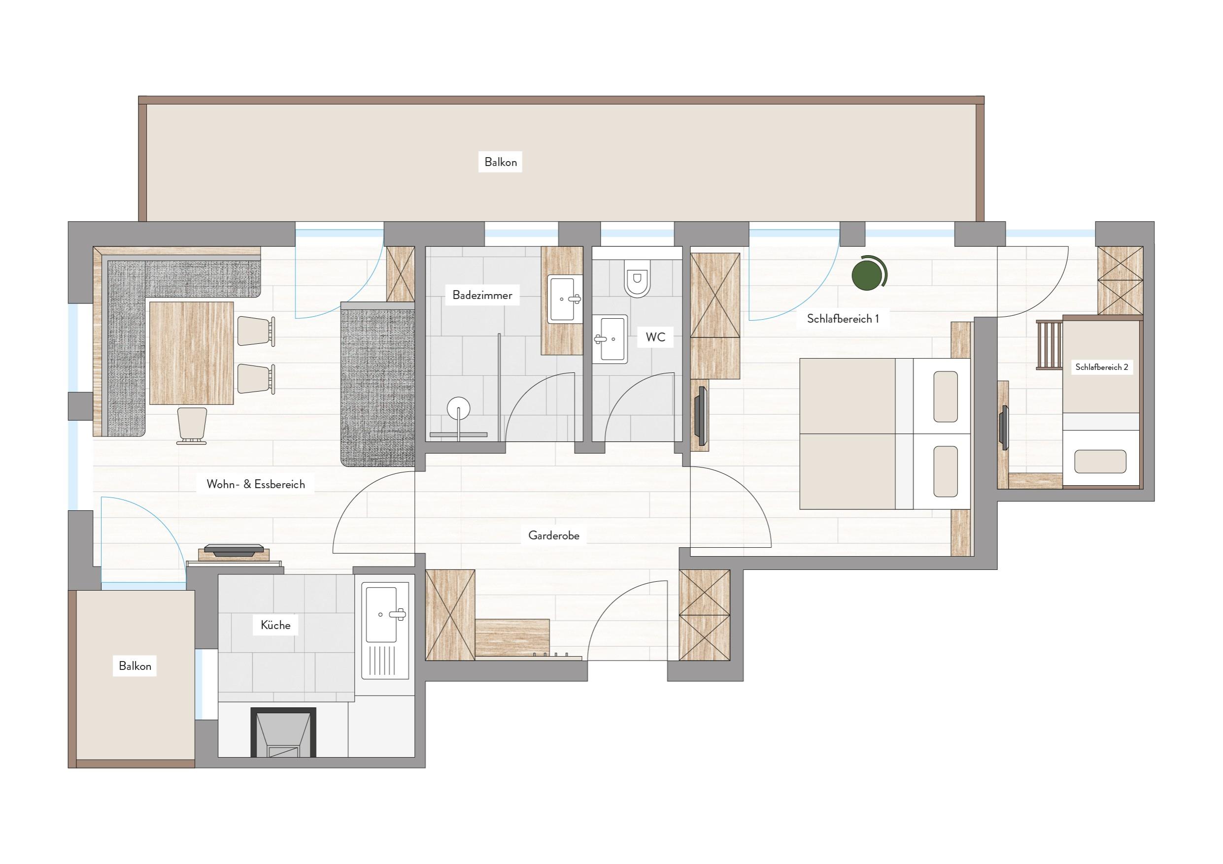 Unser komfortables und großzügiges ausgestattetes Appartement (ca. 54m² für 2-5 Pers.) verfügt über 2 Schlafzimmer (1x Etagenbett) + 1 Wohnschlafraum Einzelcouch, vollausgestattete Küche, 1 Bad mit Dusche plus zusätzliches separates WC, 3x Kabel-TV, W-LAN, Telefon, Vorraum und Balkon.