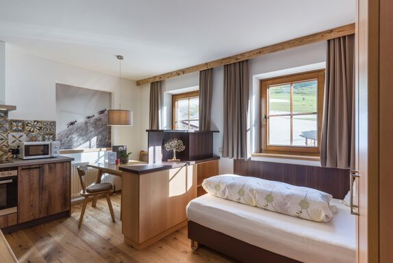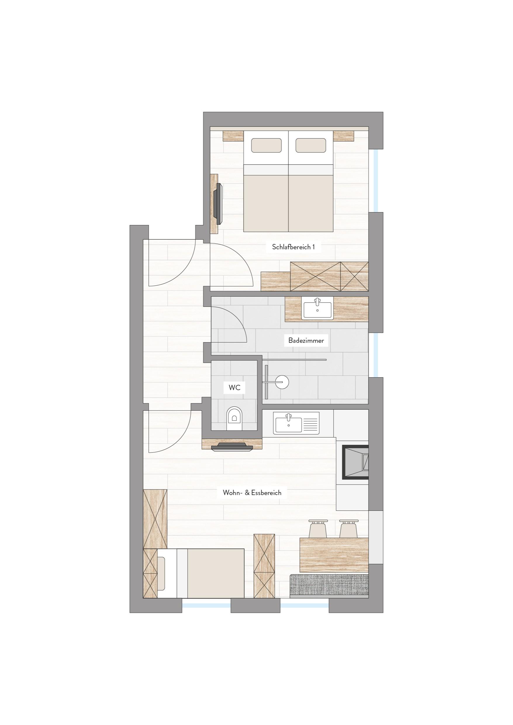 Unser komfortables und großzügiges ausgestattetes Appartement (ca. 39m² für 2-3 Pers.) verfügt über 1 Schlafzimmer + 1 Wohnschlafraum mit Jugendschlafcouch, vollausgestattete Küche, 1 Bad mit Dusche plus zusätzliches separates WC, 2x Kabel-TV, W-LAN, Telefon, Vorraum, ohne Balkon.