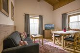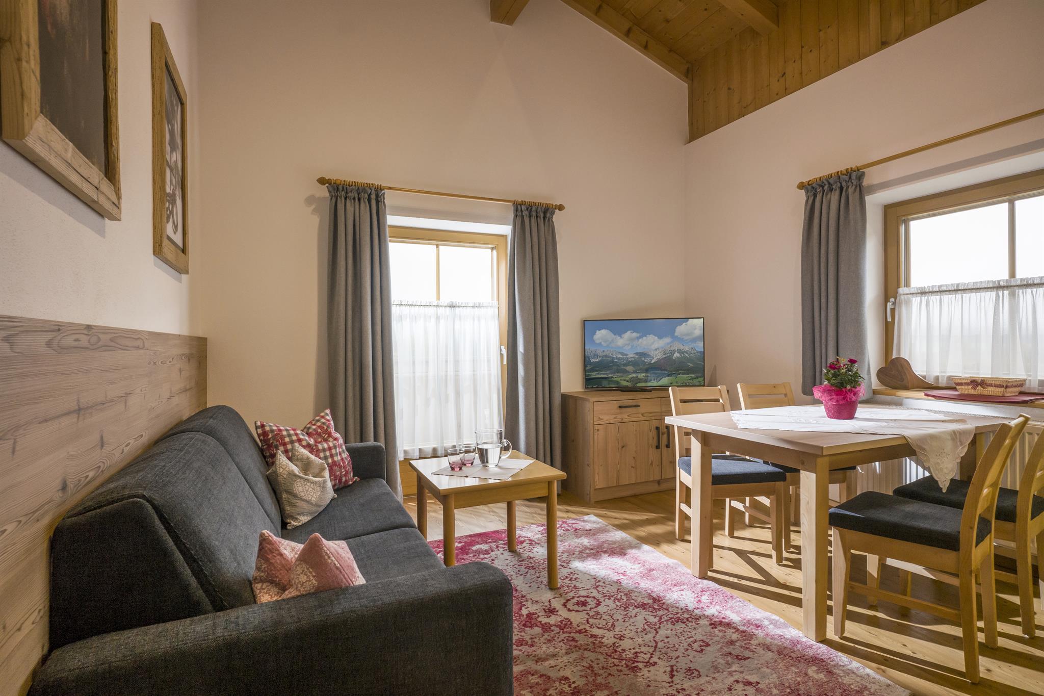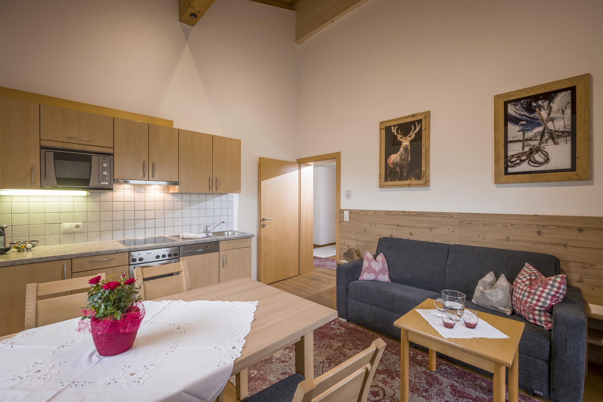 Wohnküche mit Essecke, Mikrowelle, E-Herd, Backofen, Spülmaschine, Kabel-Flat-TV, Radio, CD-Player, Telefon, W-Lan-Internet, Safe, Doppelbettcouch. Ein Schlafzimmer mit Dusche/WC, zweites Schlafzimmer mit Schreibtisch. Bad/WC: Das Appartement verfügt über ein zweites Bad und ein separates WC Ein Balkon auf der Nordseite mit herrlichem Blick zum Wilden Kaiser und auf den Golfplatz, ein Balkon auf der Südseite Für jedes Appartement steht ein Garagenplatz zur Verfügung Skikeller mit Schuhheizung