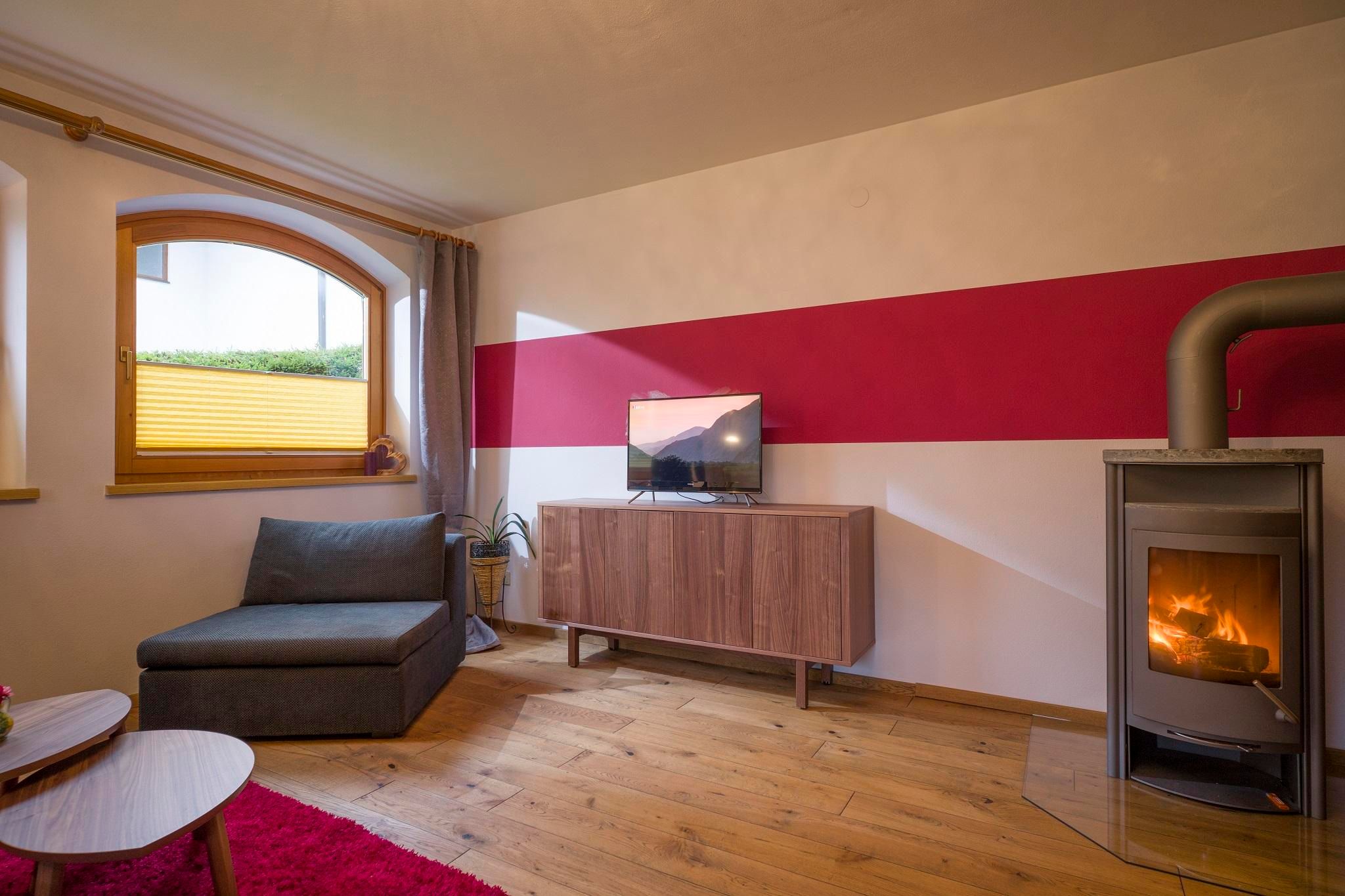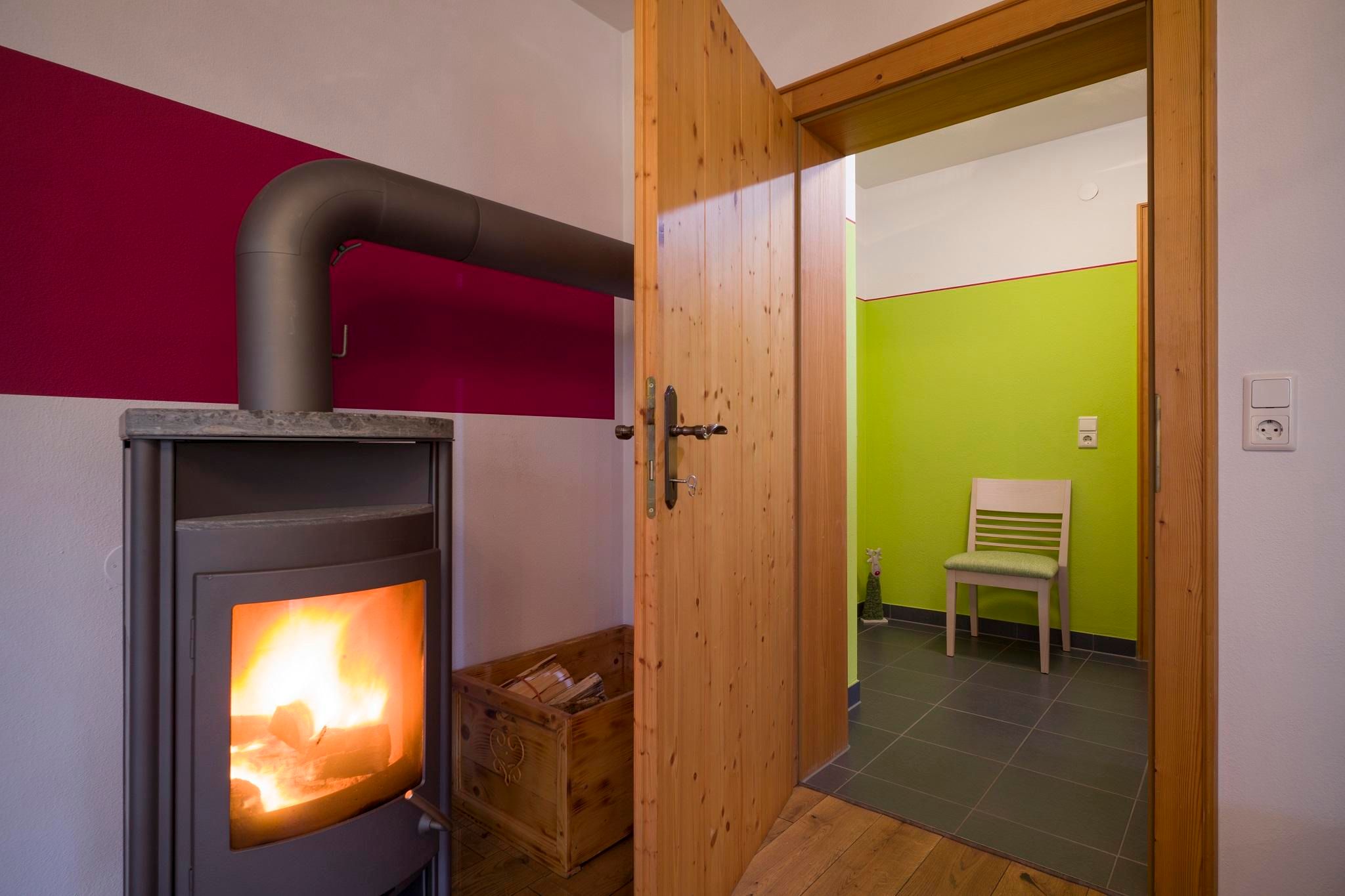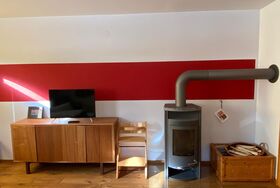 Weitläufige 70m² Ferienwohnung ausgestattet mit hochwertigen Holzboden, komplett ausgestattete Küche, Wohnzimmer mit Schlafcouch (f. 2 Personen) und kuscheligen Holzofen zum Einheizen (1 Korb Brennholz pro Aufenthalt inklusive), neuem Bad inkl. Badewanne, Bidet und Fußbodenheizung. Fön. Handtücher werden alle 2 Tage erneuert. Großzügige Terrasse mit Blick auf die umliegenden Berge.