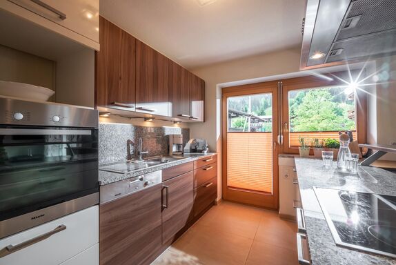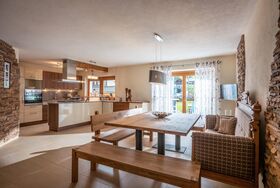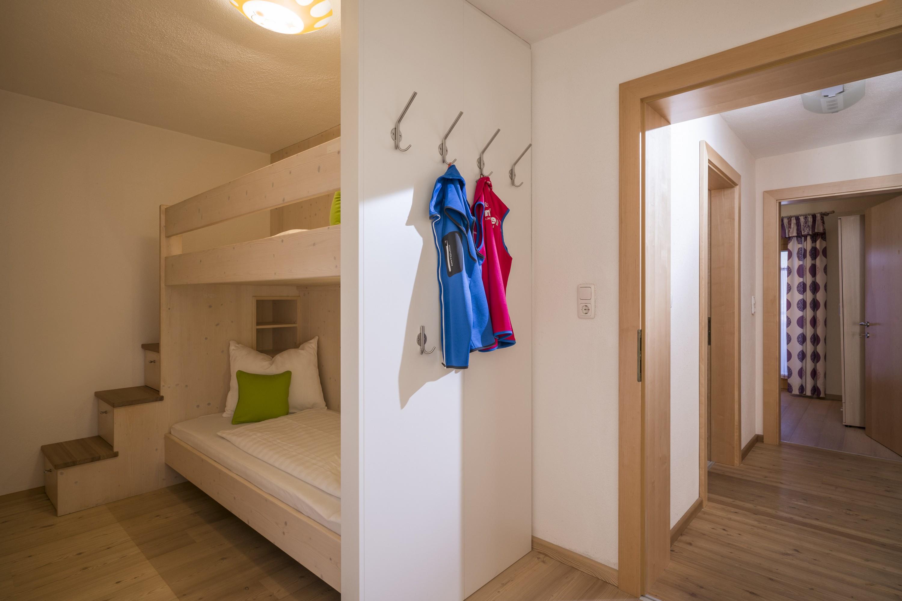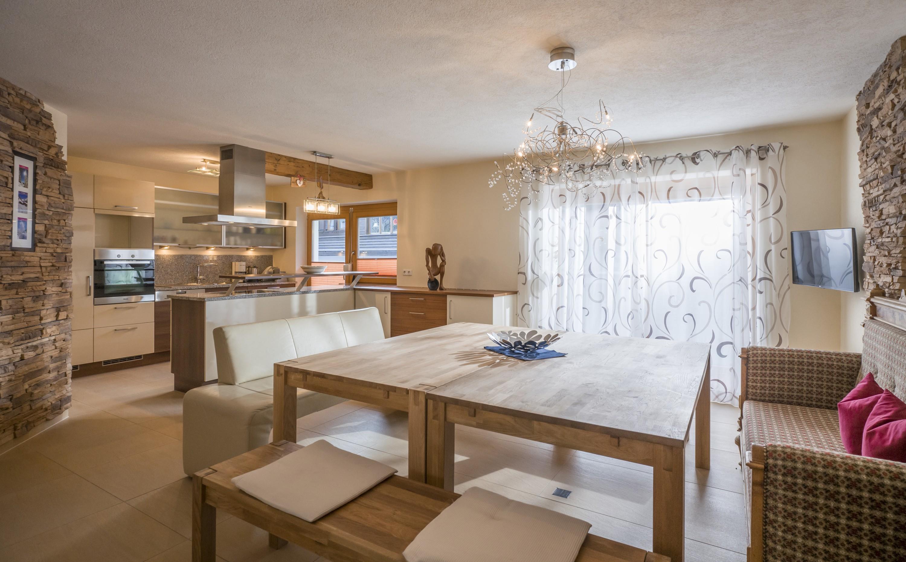 Großer Wohnraum mit offener Küche, 3 separate Schlafzimmer jeweils mit Doppelbetten, im Familienzimmer zusätzlich 1 Stockbett, 1 Badezimmer mit Dusche, Badewanne und WC, 1 separate Dusche, 1 extra WC, 2 Terrassen Süd-/Nordseitig