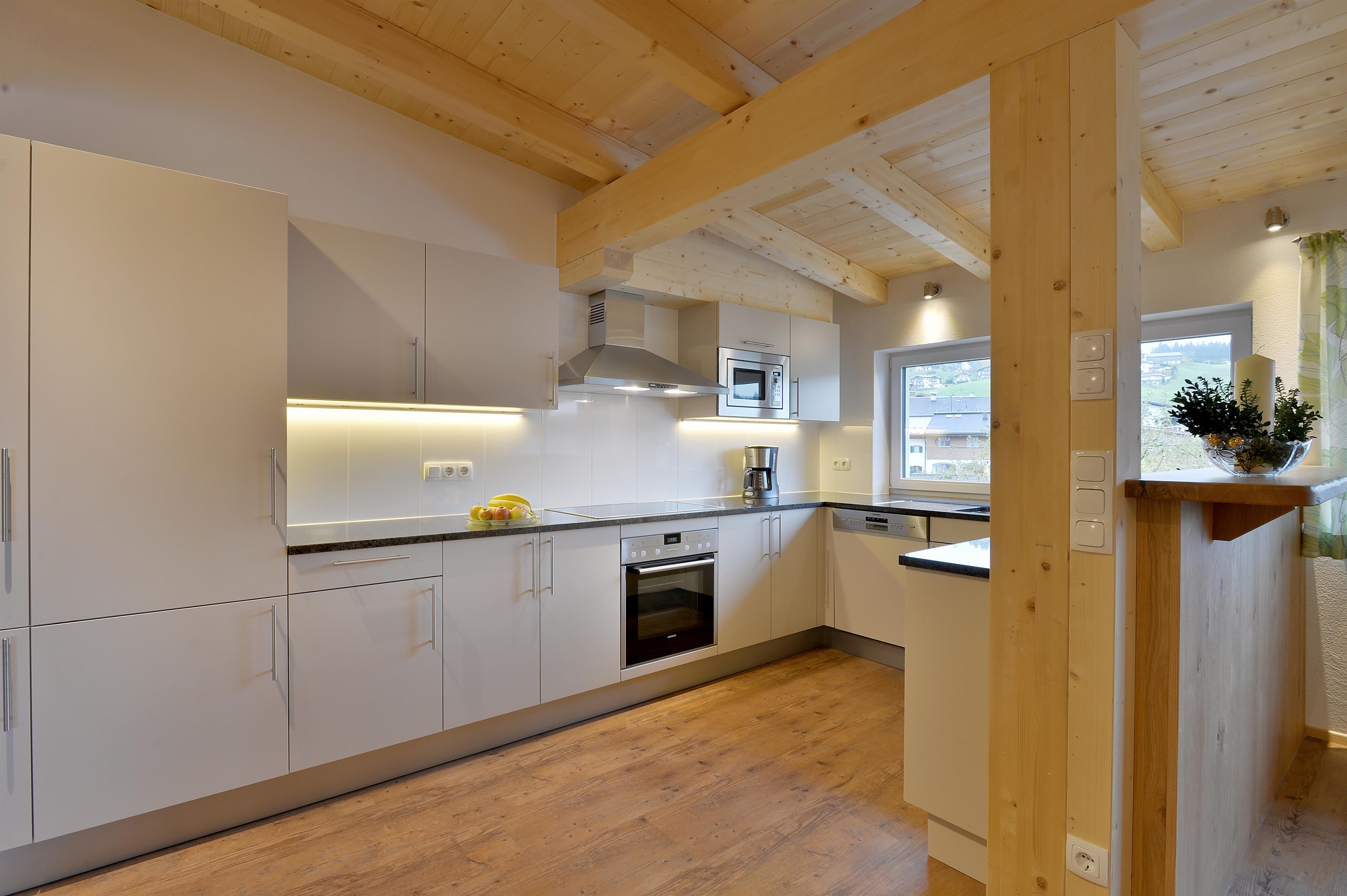 Ausstattung: Herd mit Cerankochfeld, Backofen, Mikrowelle, Spülmaschine, Kühlschrank mit Gefrierteil, Kaffeemaschine und Wasserkocher.