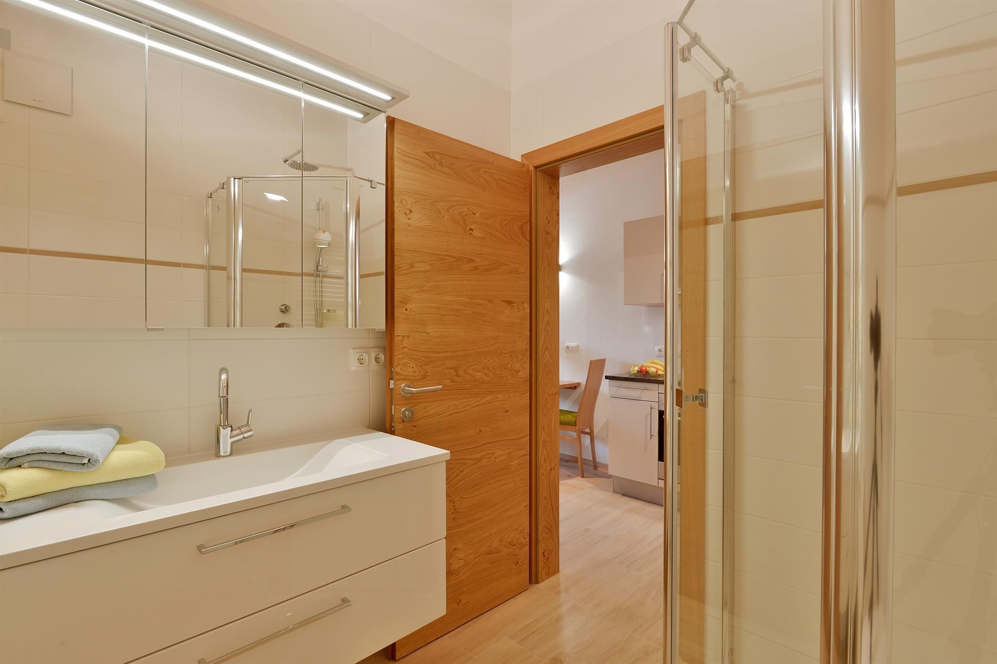 Der Wohnbereich wird durch eine Schiebetür in den modernen Küchenbereich getrennt.
