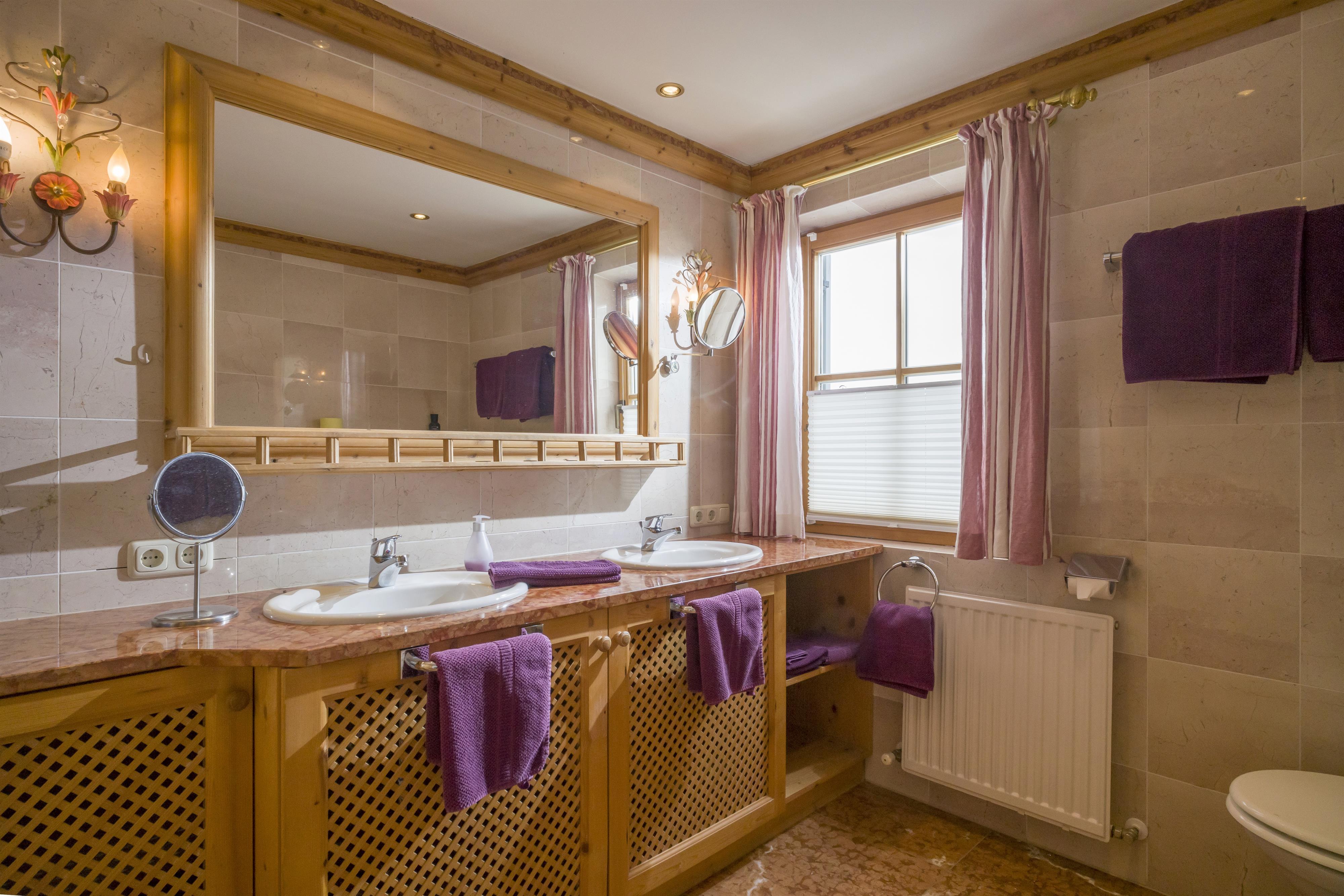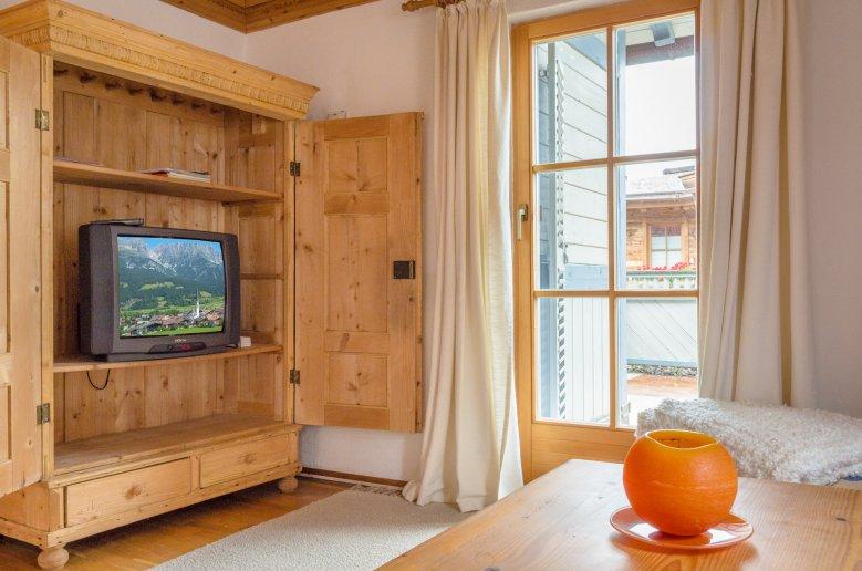Das großzügige Appartement ist gemütlich eingerichtet mit drei Schlafzimmer (zwei Schlafzimmer haben einen Fernseher), eine kleine Küche mit kompletter Ausstattung, ein Wohnraum mit Esstisch. Es befinden sich 2 Bäder im Appartement. Ein Bad ist mit Badewanne, WC und Bidet ausgestattet - das zweite Bad verfügt über eine Dusche, Wc und Bidet. Sehr geschätzt von unseren Gästen wird die Fußbodenheizung in den Bädern, sowie drei Toilletten. Zum Wohlfühlen trägt die Terrasse mit Blick zum Wilden Kaiser bei. Weiters gibt es zwei Balkone mit Blick zum Dorf sowie einen Abstellraum.