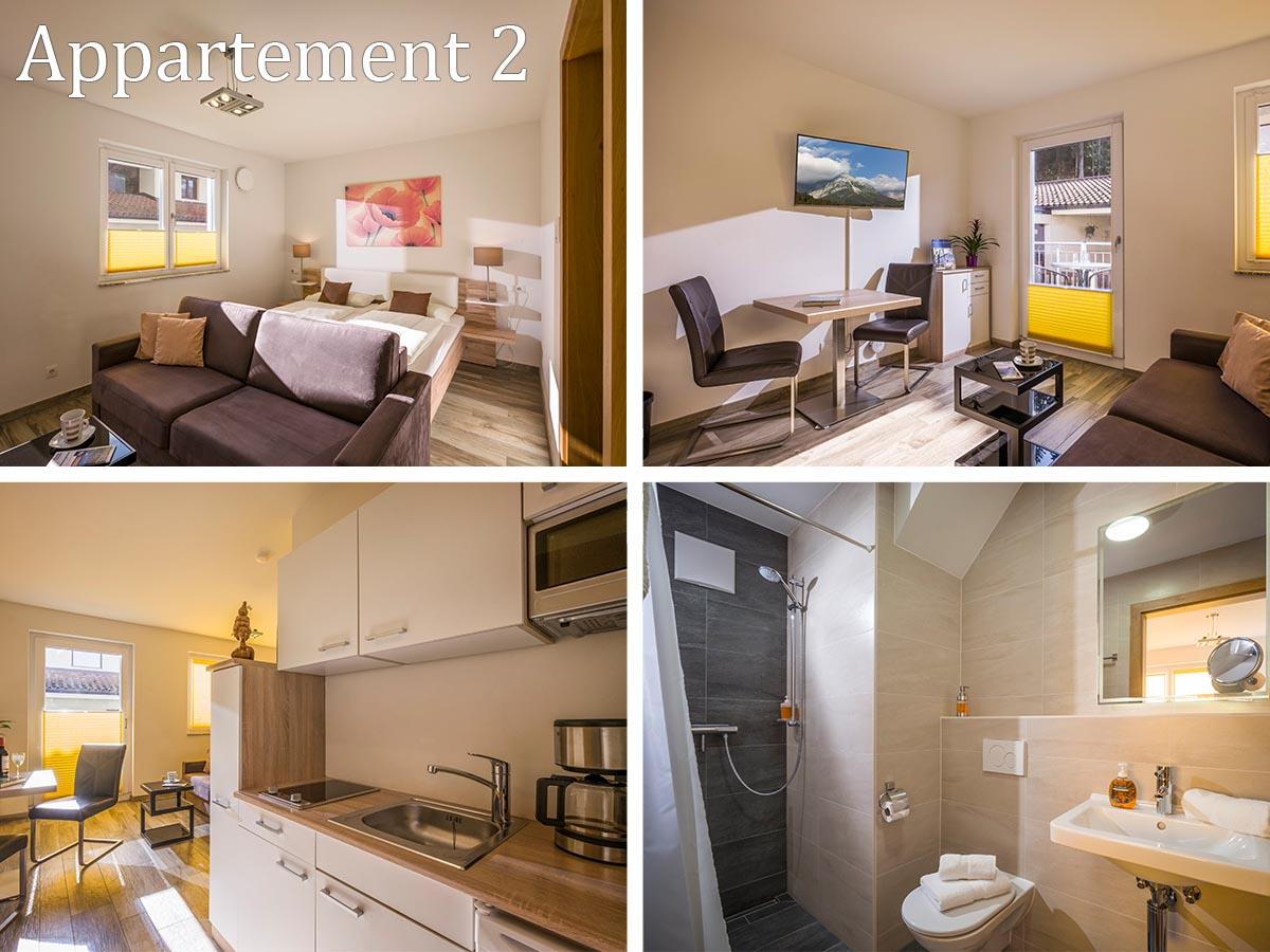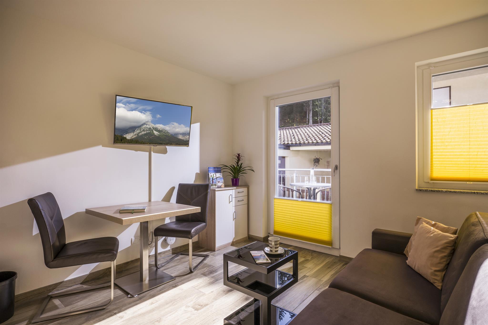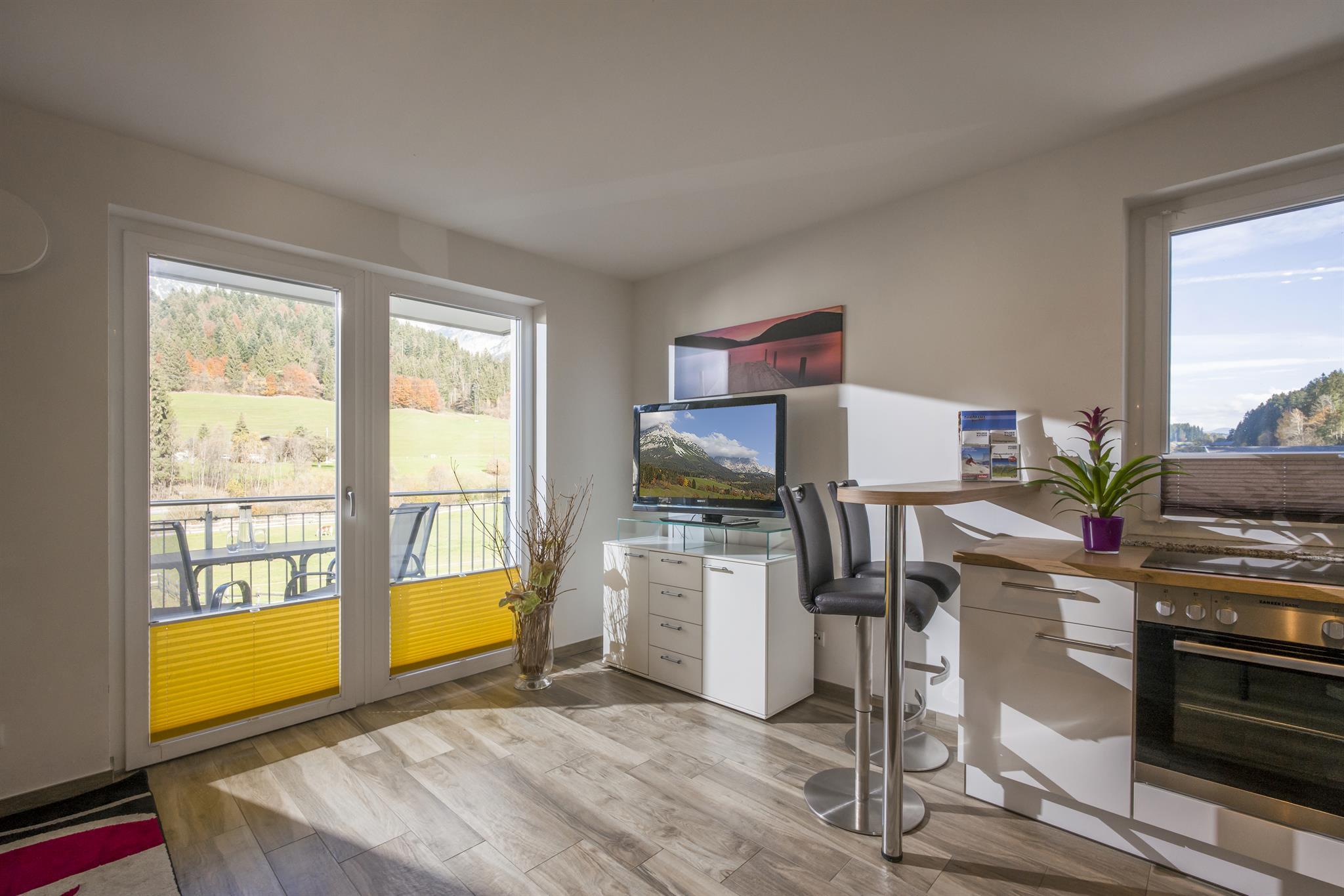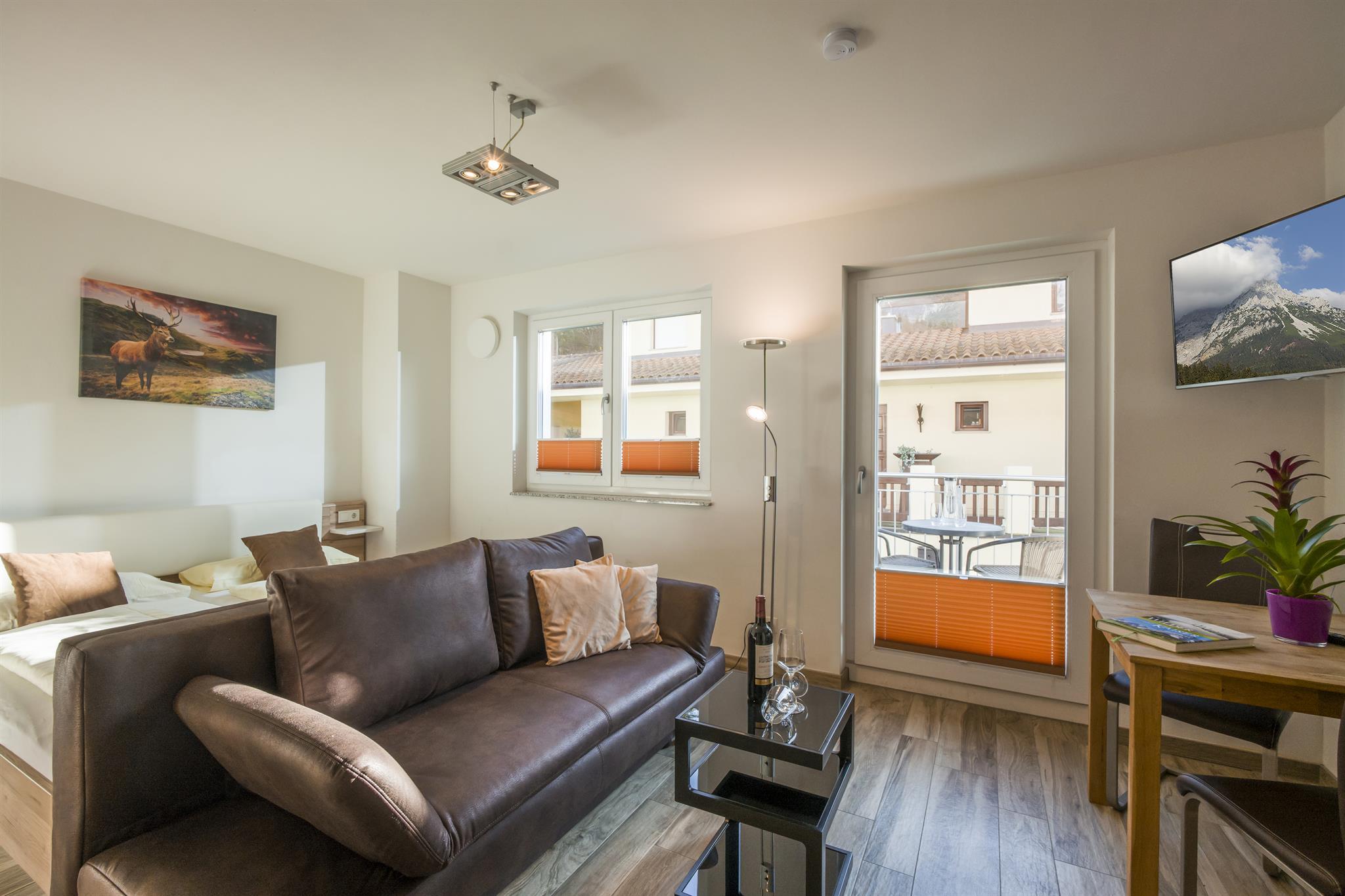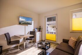 Ruhiges Studio-Appartement mit kombiniertem Wohn-/Schlafraum, Balkon sowie Badezimmer mit Dusche/WC. Das Appartement verfügt über eine gut ausgestattete Küchenzeile mit Kochfeld, Mikrowelle und Kühlschrank sowie Ess- und Kochgeschirr. Es bietet ein komfortables Doppelbett und eine Doppelschlafcouch. Ideal für 2 Personen; die Doppelschlafcouch kann zusätzliche Gäste beherbergen, engt jedoch das Apartment etwas ein. Eingeschränkter Blick auf die nahe Skipiste. Bettwäsche und Handtücher vorhanden.