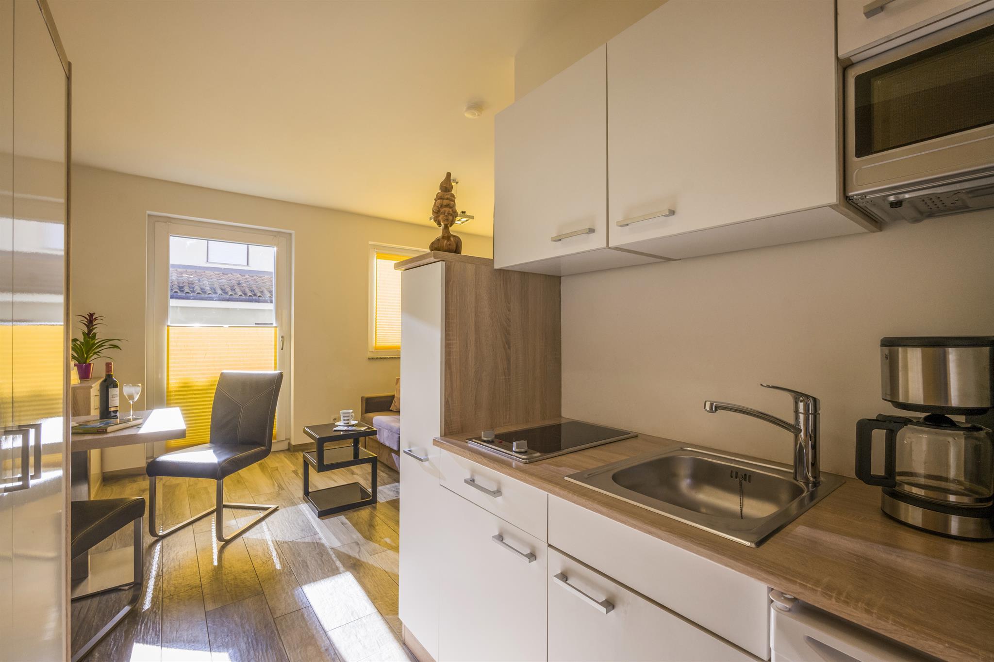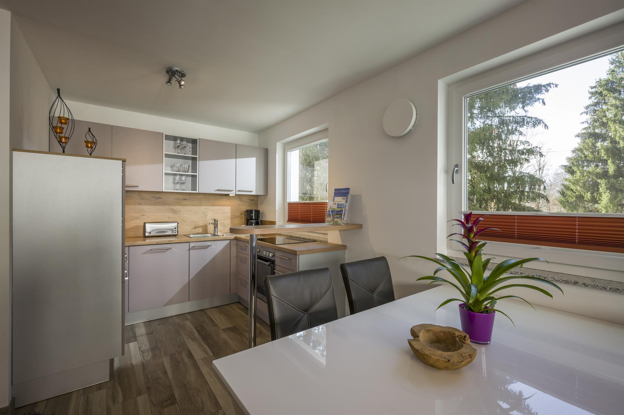 Die Ferienwohnungen sind modern eingerichtet mit Fliesenböden im Holzdekor, Fußbodenheizung und komfortabler Wohnraumlüftung. Die Einrichtung ist hochwertig und aufeinander abgestimmt. Alle Einheiten verfügen über voll ausgestattete Küchen mit Essgeschirr und Küchenutensilien.