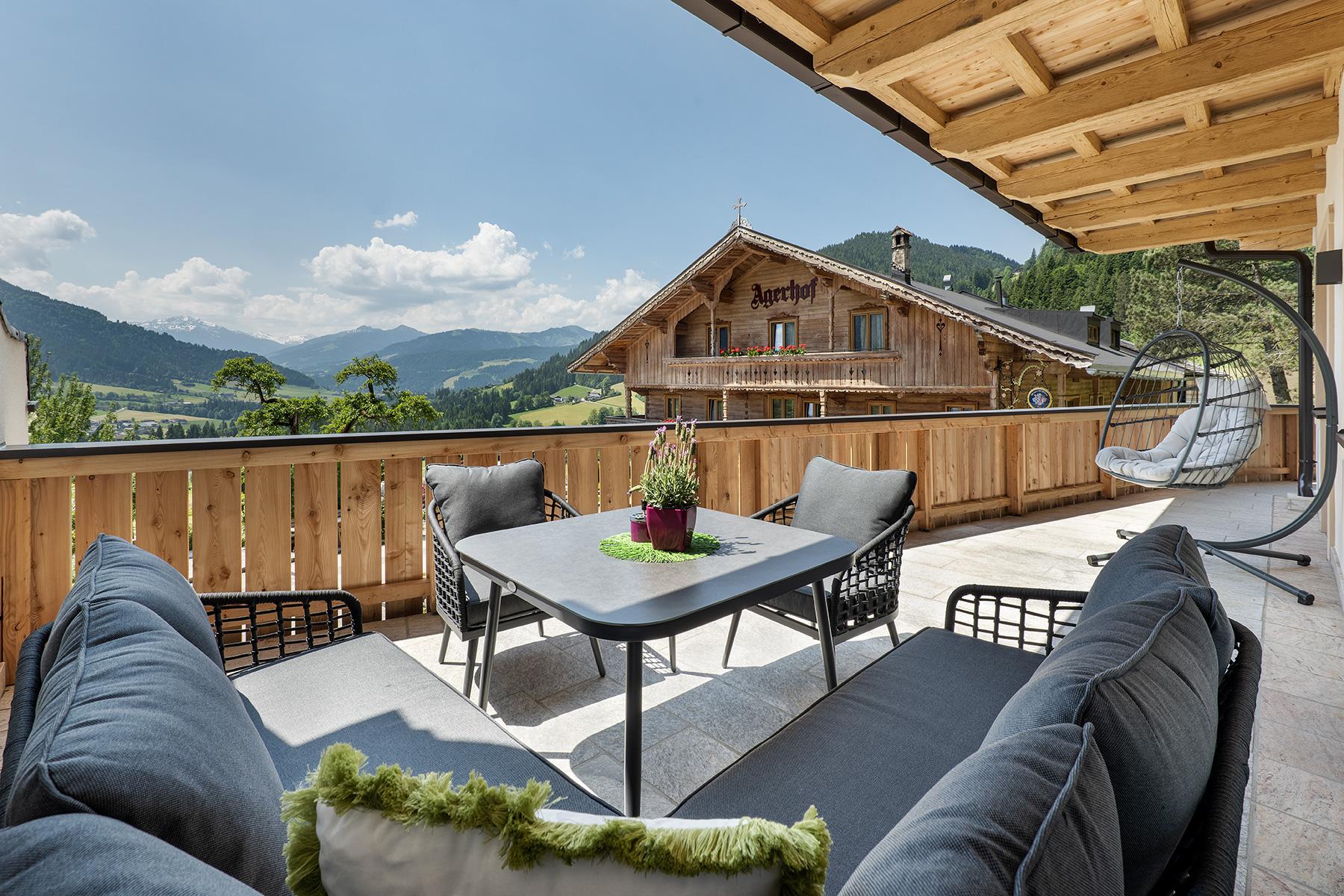 Von Ihrem eigenen Sonnenbalkon genießen Sie den traumhaften Blick auf Tirols Aussichtsberg - die Hohe Salve und den bezaubernden Schlösslgarten. Hier können Sie entspannen und die Seele baumeln lassen, während Sie die Schönheit der Kitzbüheler Alpen in vollen Zügen genießen.