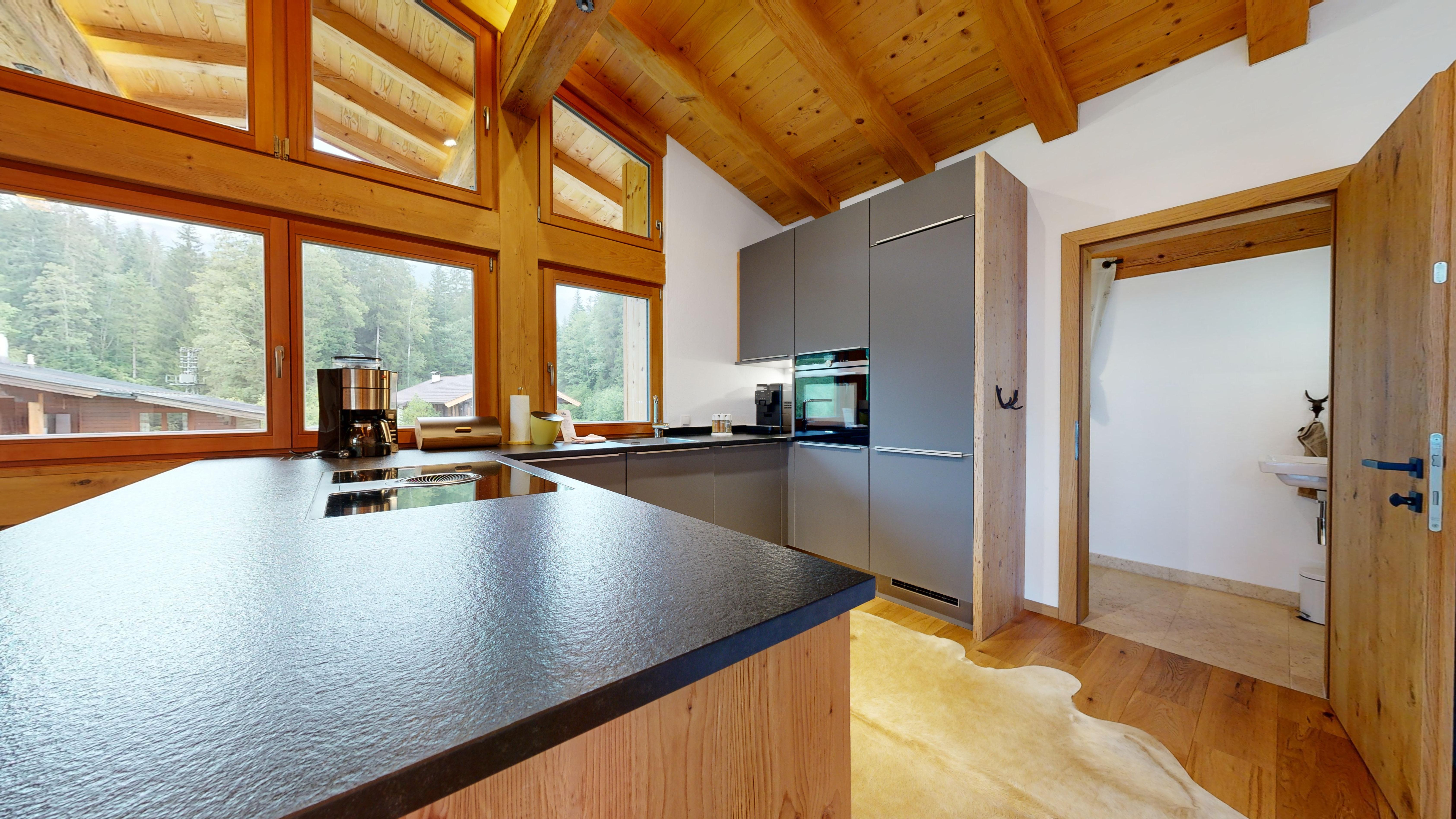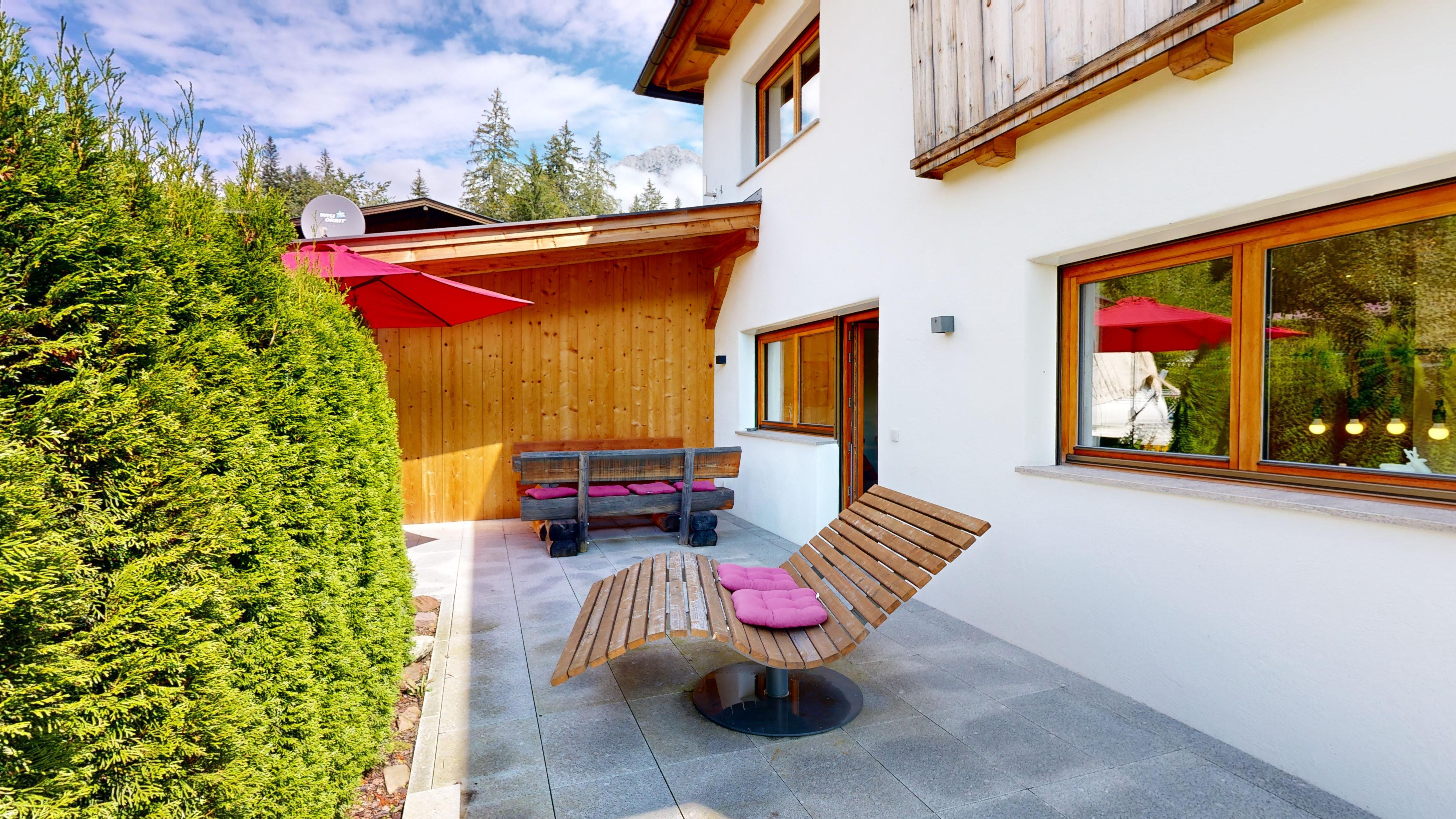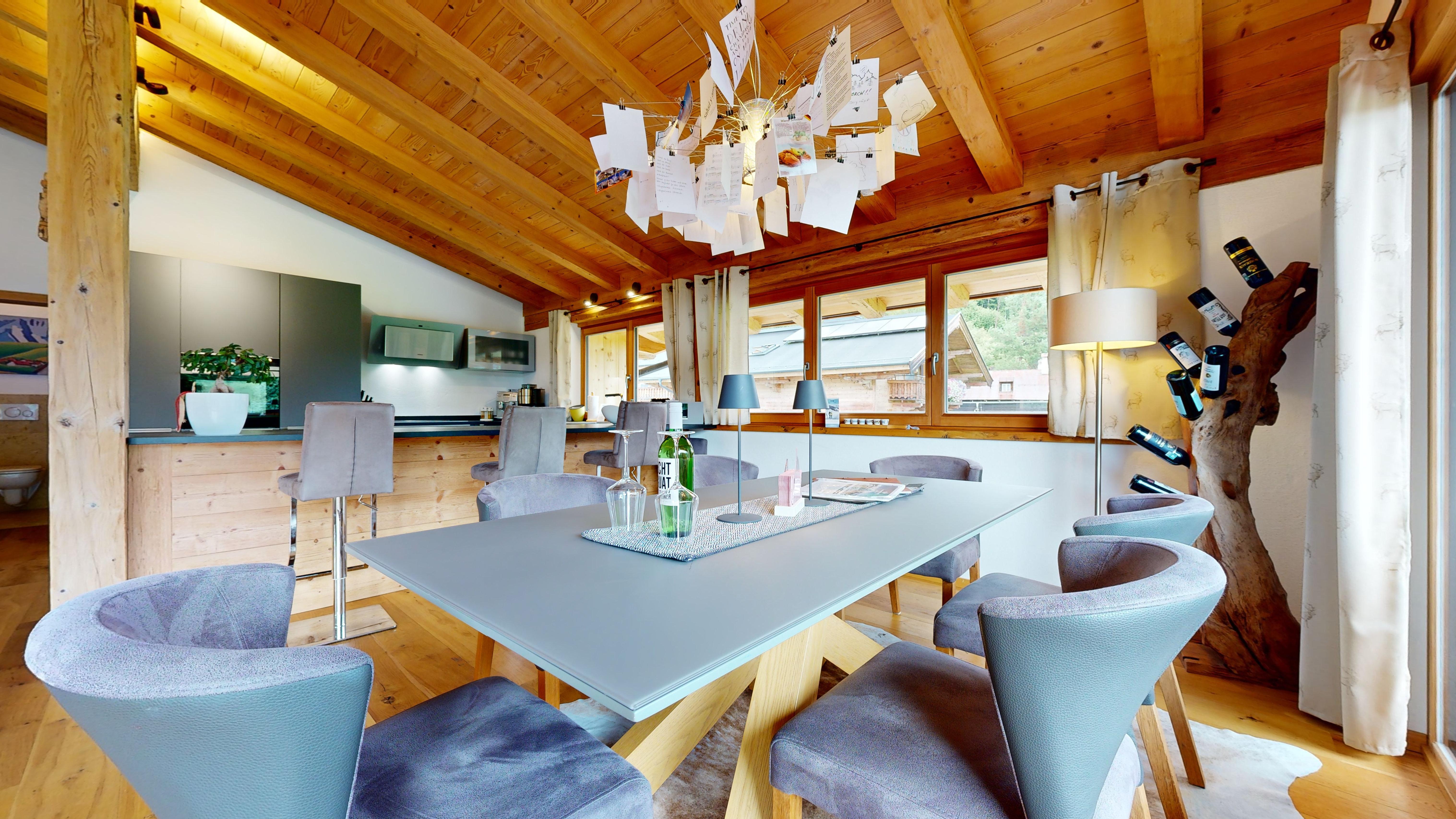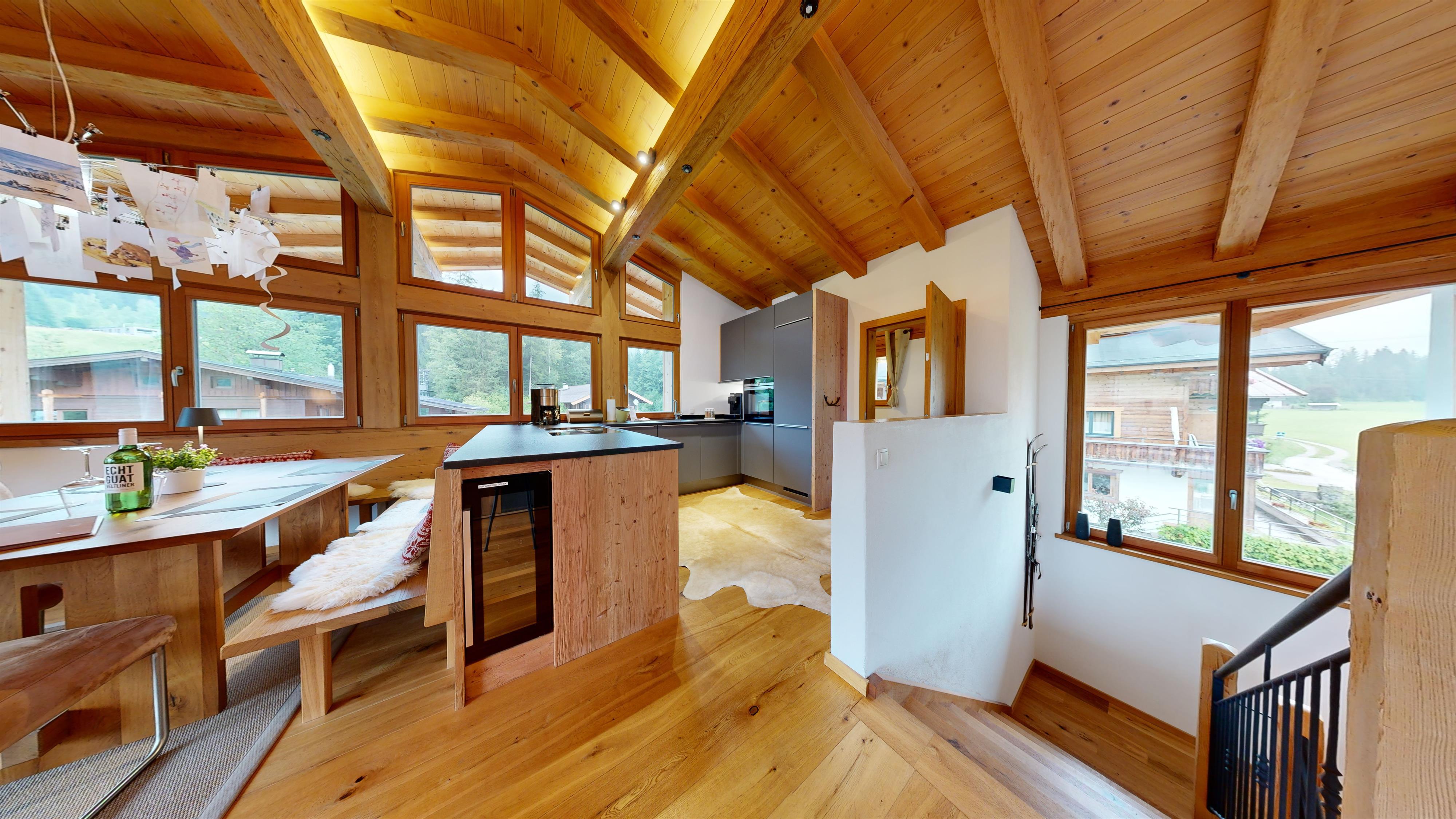 Hochwertig, aber gleichzeitig gemütlich eingerichtet kann man hier entspannen, relaxen in der Infra-Rot Sauna, sonnenbaden auf dem Balkon oder mit Freunden und Familie im geräumigen Wohn-Ess-Bereich den Tag ausklingen lassen. Wir haben das Haus selbst gebaut und auf Luxus wertgelegt. Die Böden sind mit Vollholz-Eichendielen ausgelegt, die Küchen mit Granitplatten ausgestattet und die Infra-Rot Saunen mit Zirbenholz ebenso wie die Betten extra vom Schreiner angefertigt.
