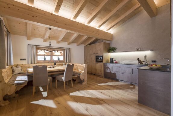 Unsere vollausgestattete Küche ist mit hochwertigen Elektrogeräten von Miele und Bora ausgestattet. Das haubenlose Abluftsystem von Bora bietet höchsten Kochkomfort. Das Induktionskochfeld sorgt dafür, dass Sie blitzschnell Ihre Speisen zubereitet haben und sich schneller wieder der eigentlichen Aufgabe Ihres Aufenthalts widmen können – sich in unserem Appartement und der Tiroler Bergwelt zu erholen und mit Familie oder Freunden eine schöne Zeit zu verbringen. Die große Eckbank lädt dazu herzlich ein. Hier können Sie den Abend mit ein paar Spielen ausklingen lassen.