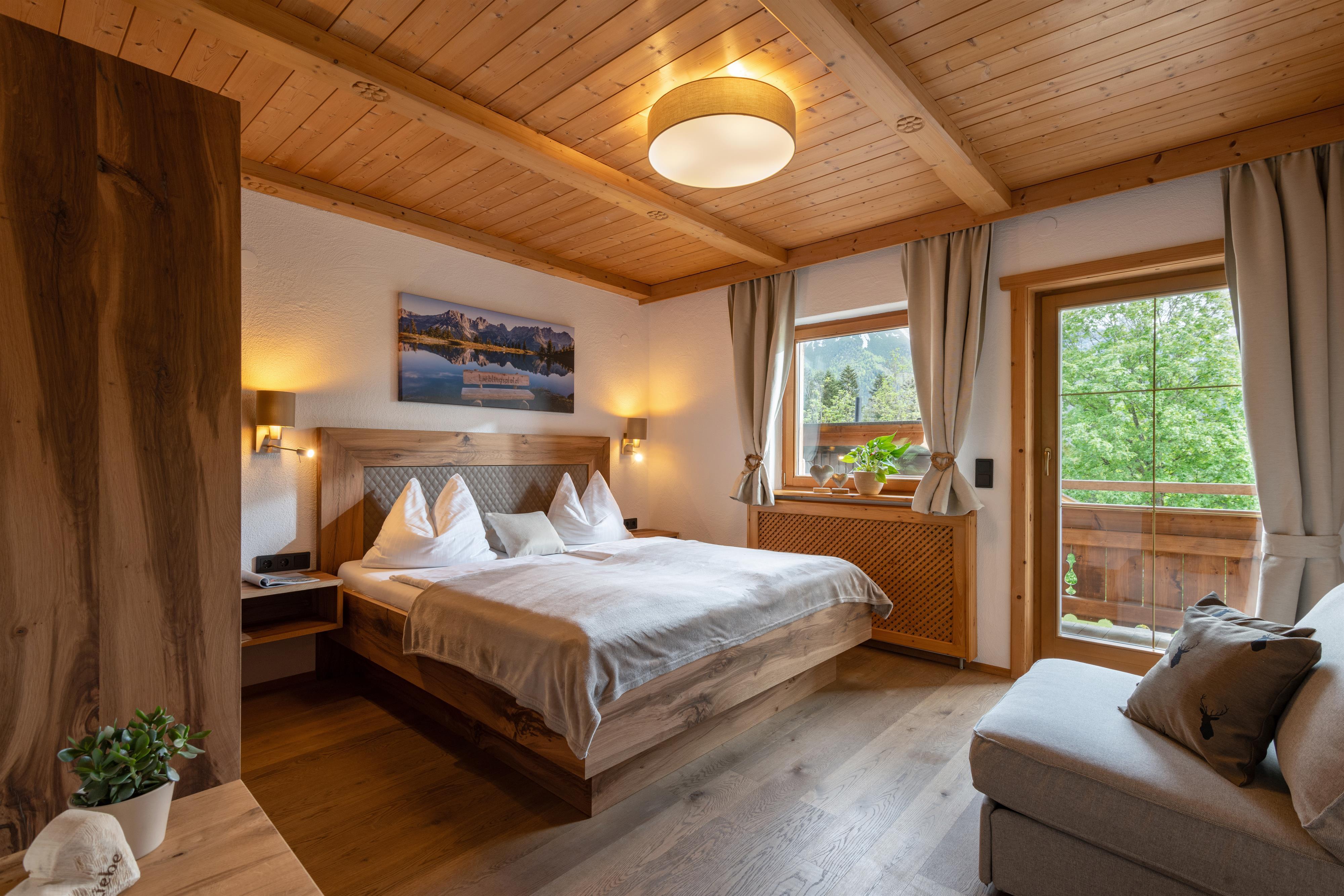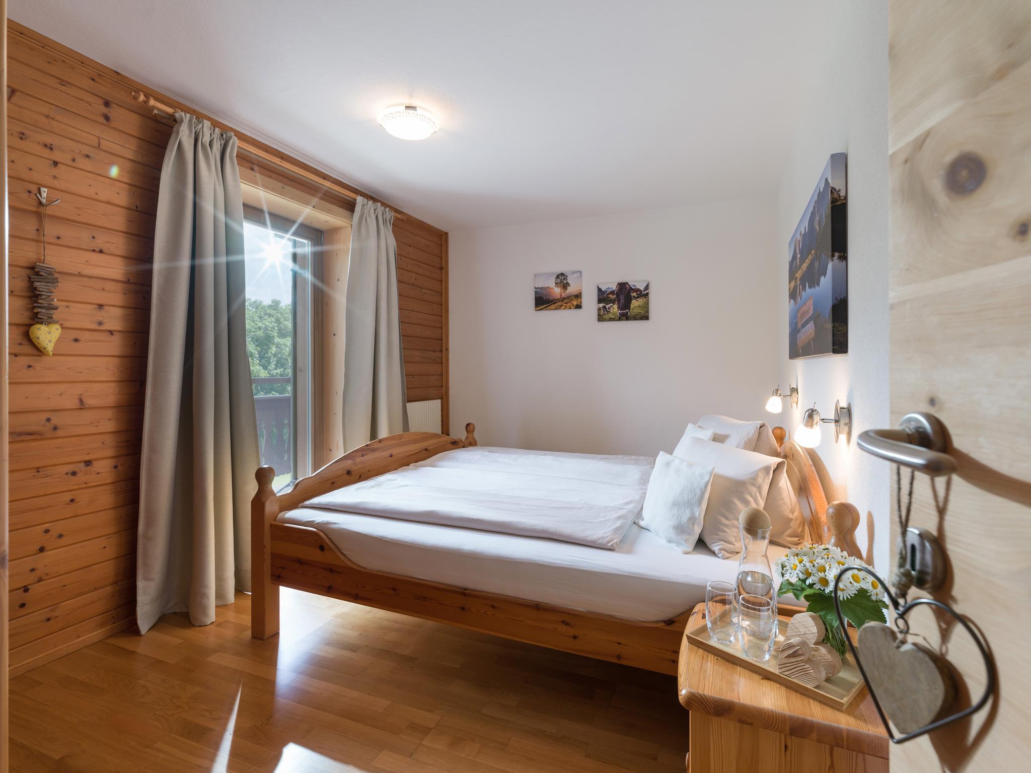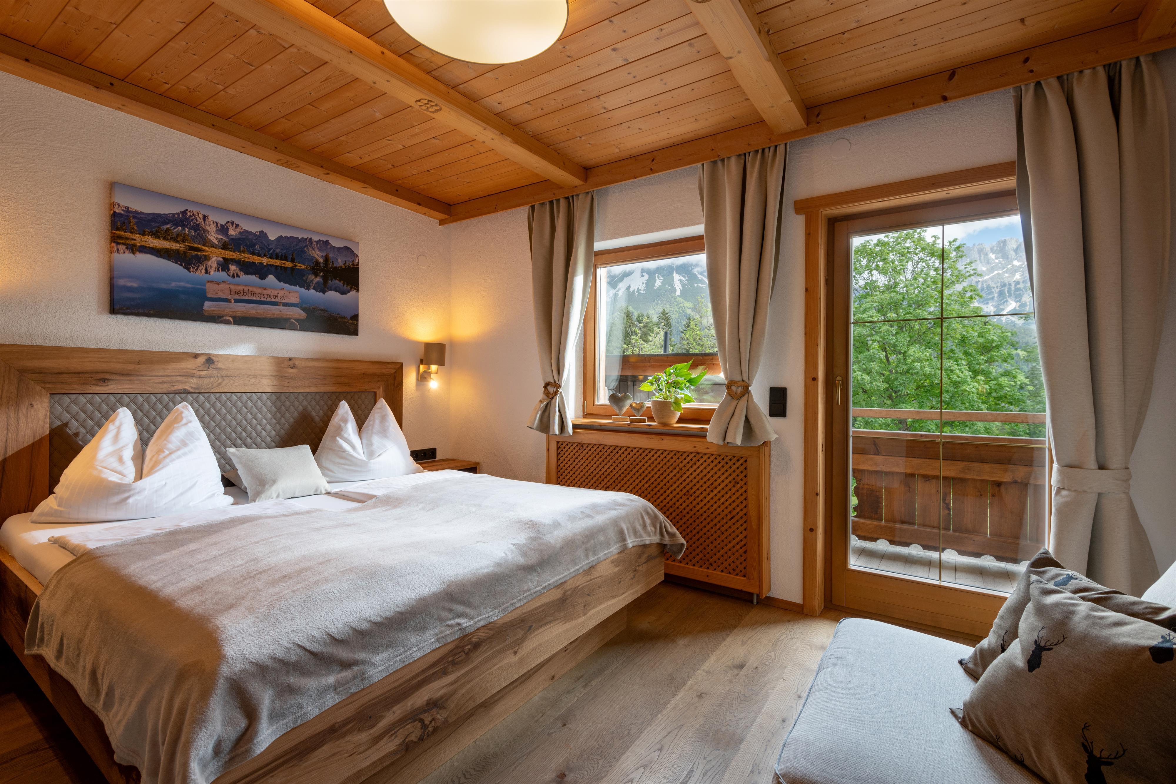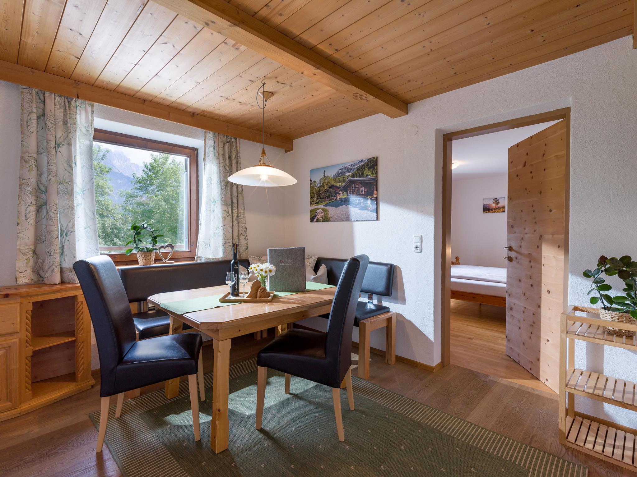 Wir bieten Ihnen ein gemütliches Appartement für 2-5 Personen mit eigenem Eingang und DIREKTEM Blick zum Wilden Kaiser. 2 getrennte Schlafräume, alle Türen, wurden aus „Zirbenholz“ Hand gefertigt! Das Appartement im ländlichen Stil verfügt über einen durchgehenden Balkon, komplett eingerichtete Küche, Geschirrspüler, gemütlicher Wohnraum, Flat-TV, Sat-TV, W-Lan, Dusche mit separatem WC. Brötchenservice.