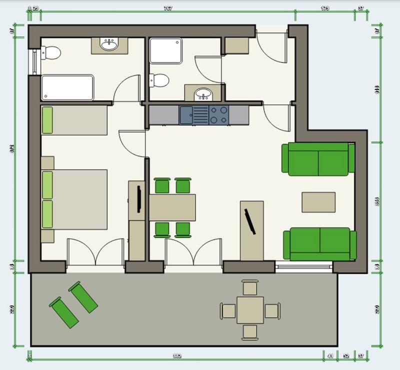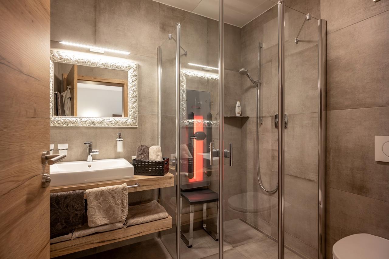 Die Garten-Suite Top 2, für 2-5 Personen, bietet Ihnen ein geräumiges Badezimmer mit 2x getrennter DU/WC und integrierter Infrarotkabine.