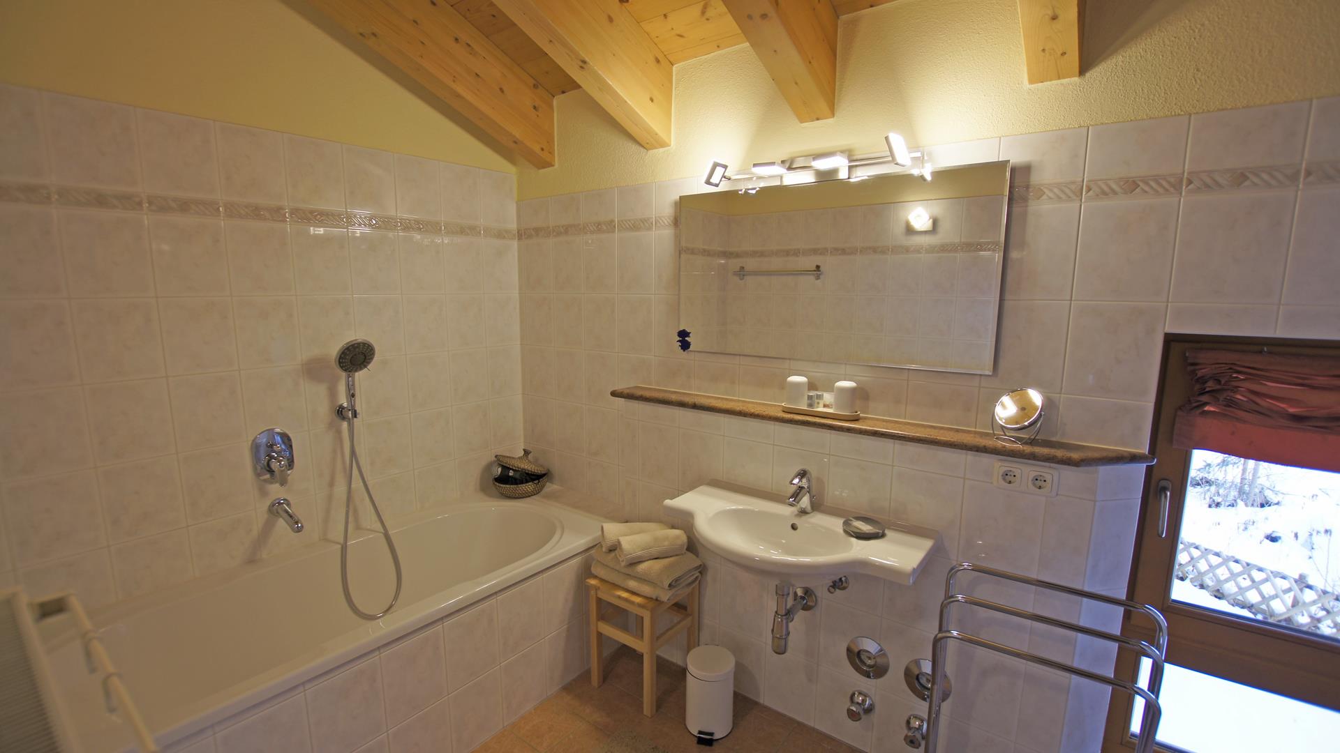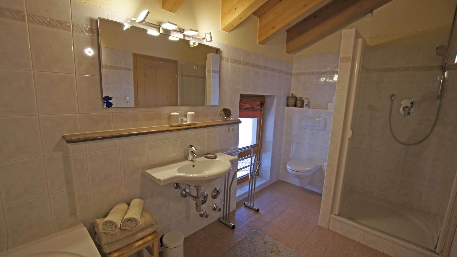 Komfortables Bad mit Badewanne, Dusche und WC, separates Gäste-WC.