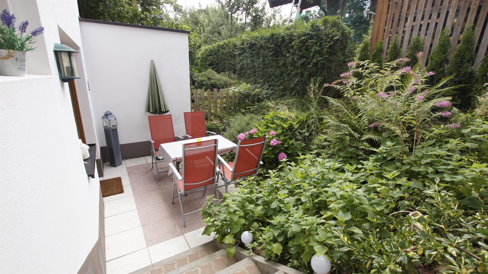 Eigener (kontaktloser) Eingang und private Süd-Loggia mit Gartenmöbeln.