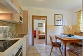 Küche mit Esstisch für 4 Personen, Wohnschlafraum mit einem Doppelbett und zusätzlichem Schlafsofa, DU/WC, kleine Südterrasse
