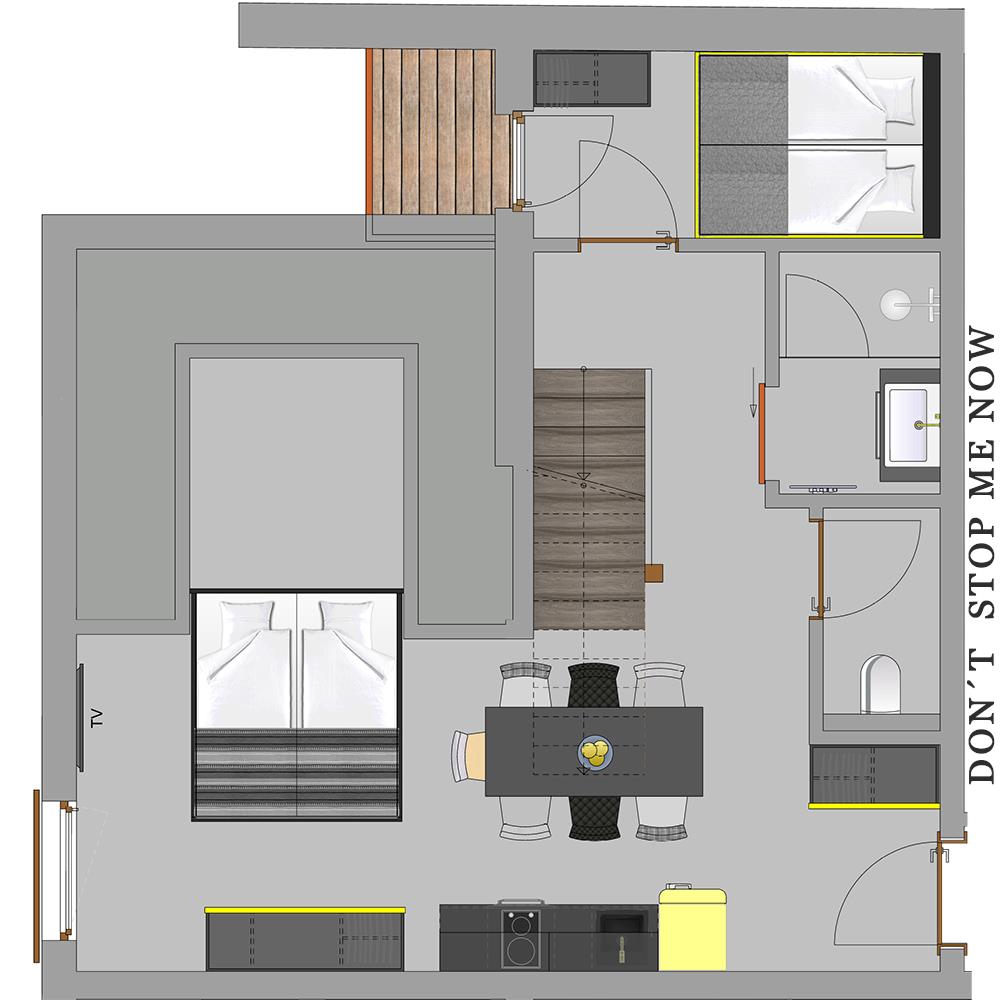 Ganz nach Freddie´s Geschmack, wurde dieses Apartment 60 m² im doppelstöckigen Loftstyle 2. Stock & 3. Stock mit Blick Richtung Westen eingerichtet. I want it all – das könnt ihr haben! Dieses Apartment verfügt über 3 Schlafzimmer, zwei Balkone, einen großzügigen Wohn-, Küchenbereich, Bad (3,5 m²), WC (2 m²) und ist mit a kind of magic eingerichtet!