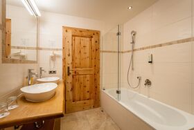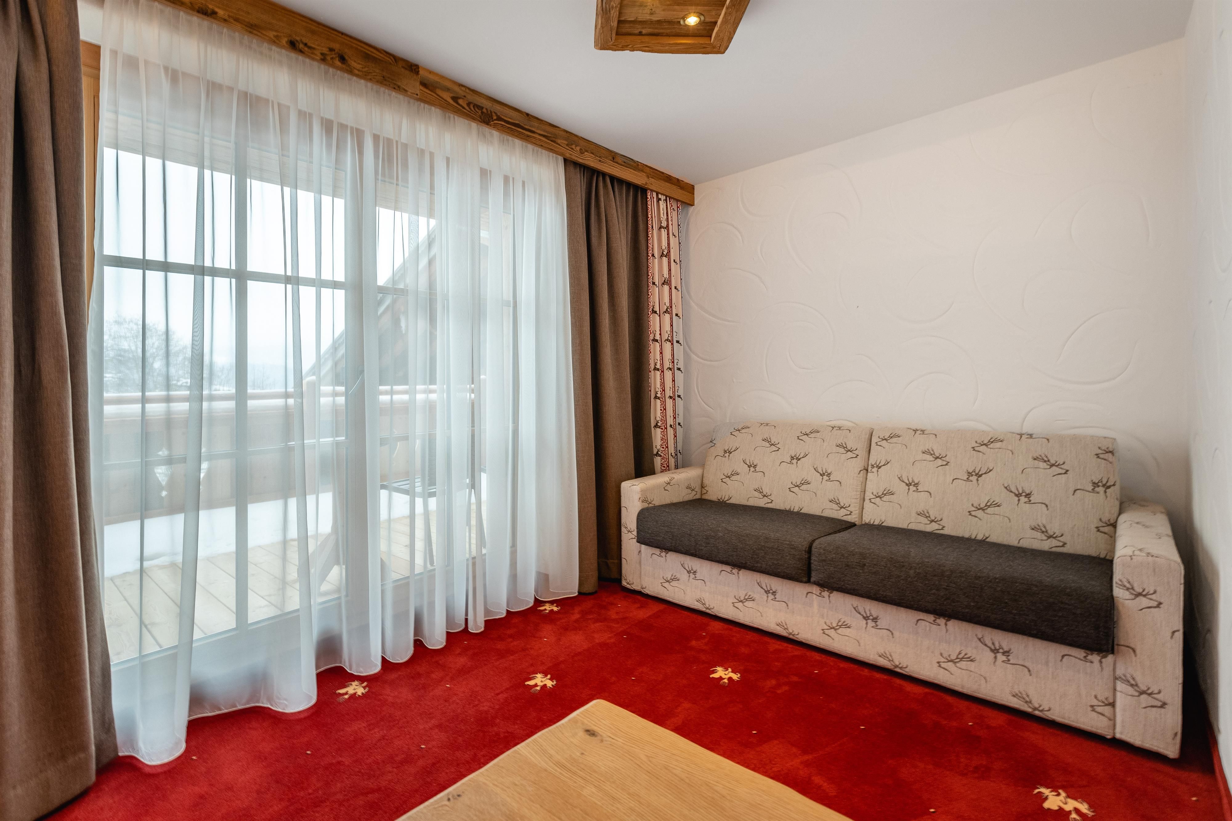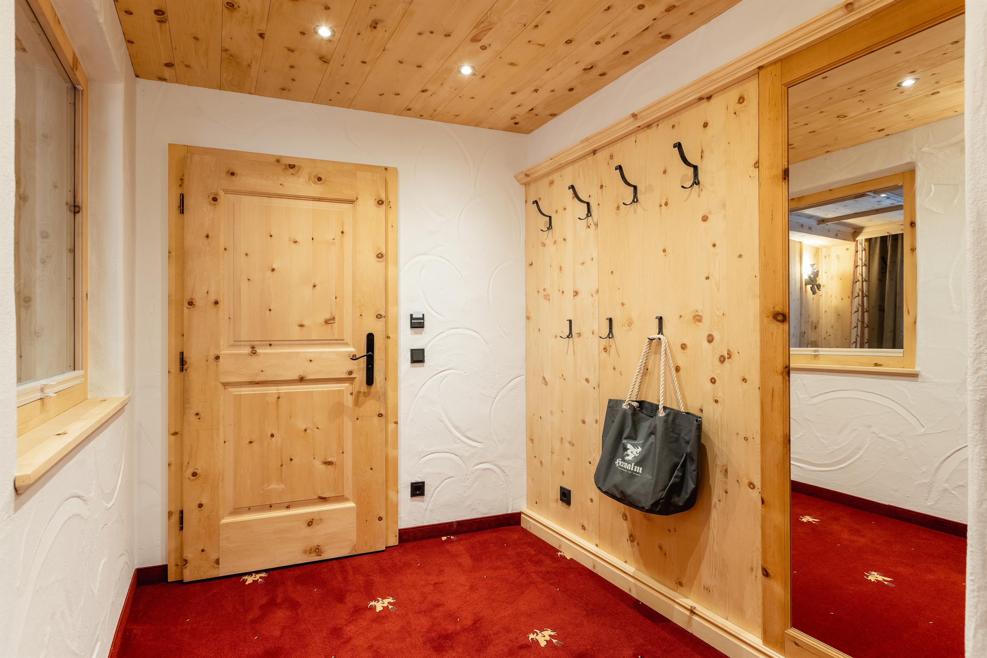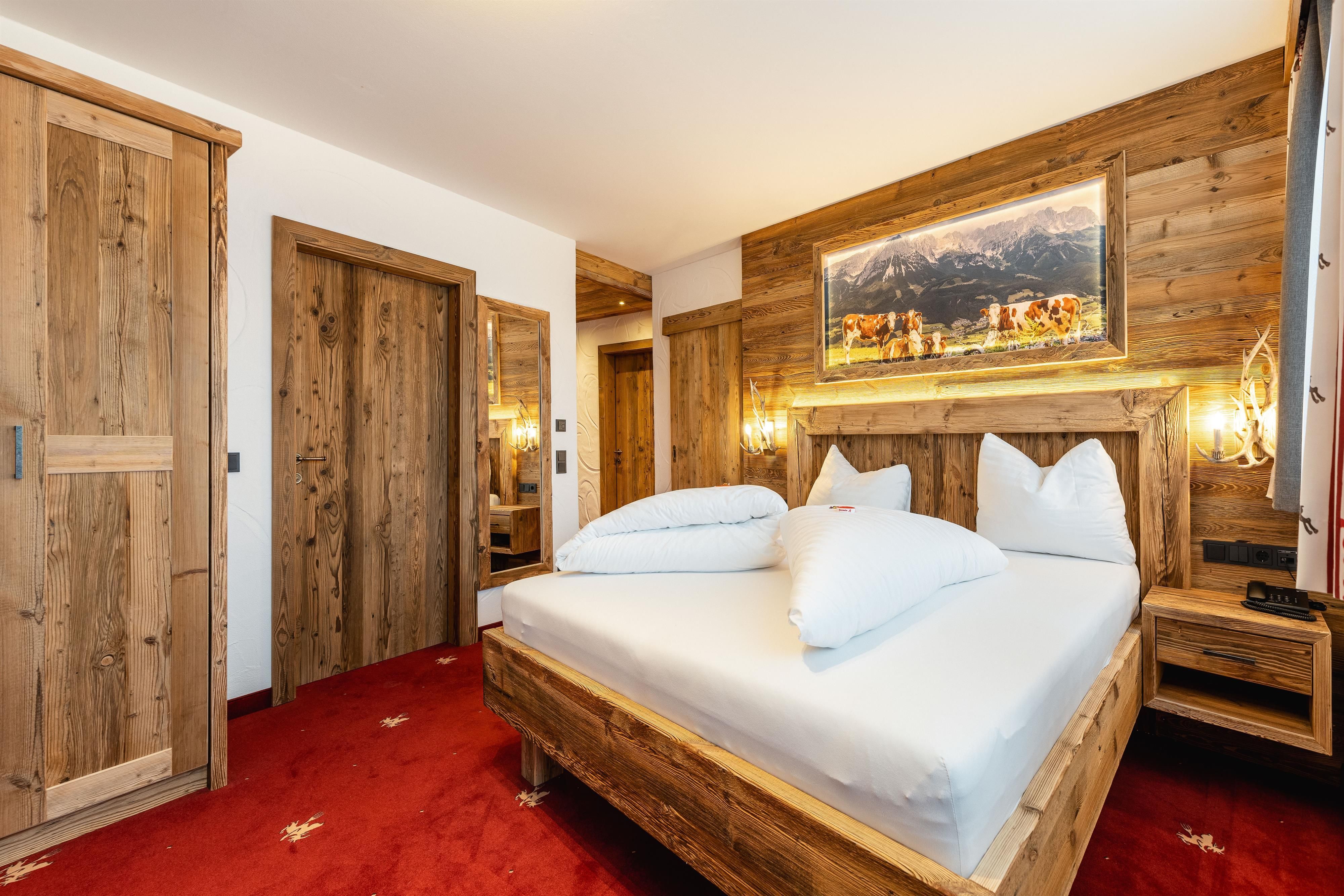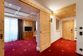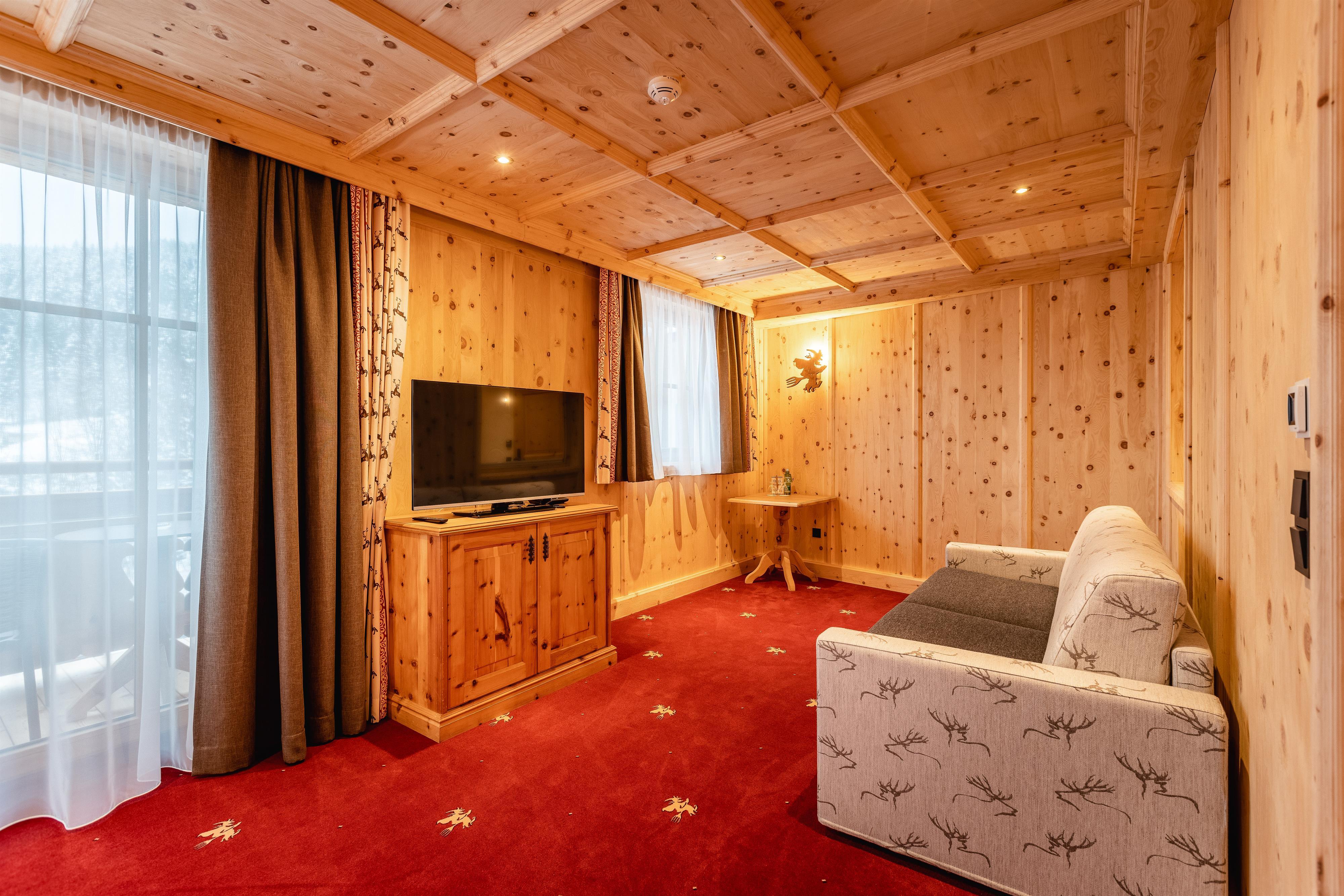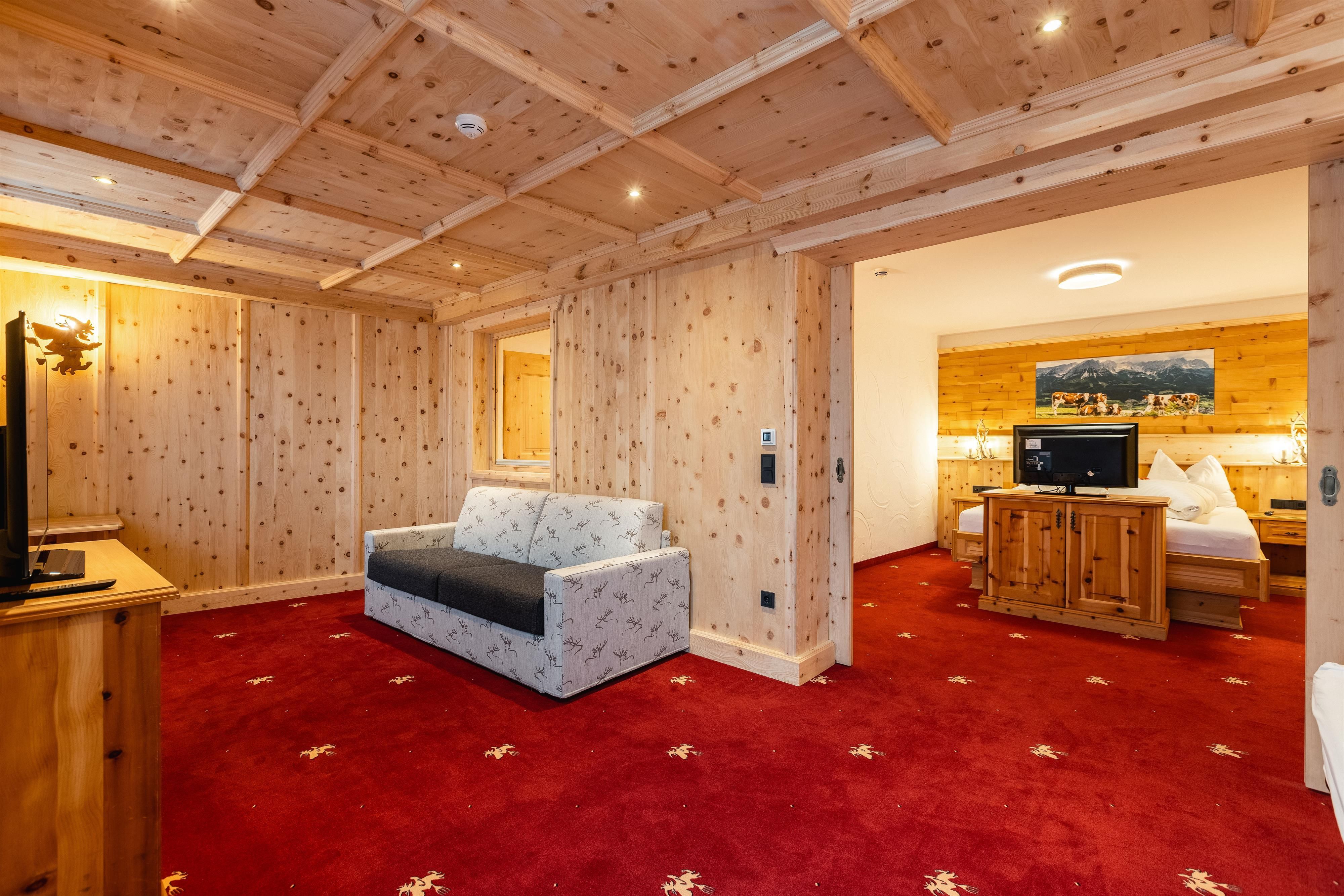 FAMILIENSUITE HEXENZIRBE neues rustikales ZIRBEN-Familienzimmer mit ca. 36 m², Kindeschlafbereich mit Schiebetür abtrennbar, Stockbett für die Kinder, Badezimmer mit Dusche und WC, Haarfön, Zimmersafe, 2 x TV, Telefon ausgestattet mit Teppichboden und Holzboden