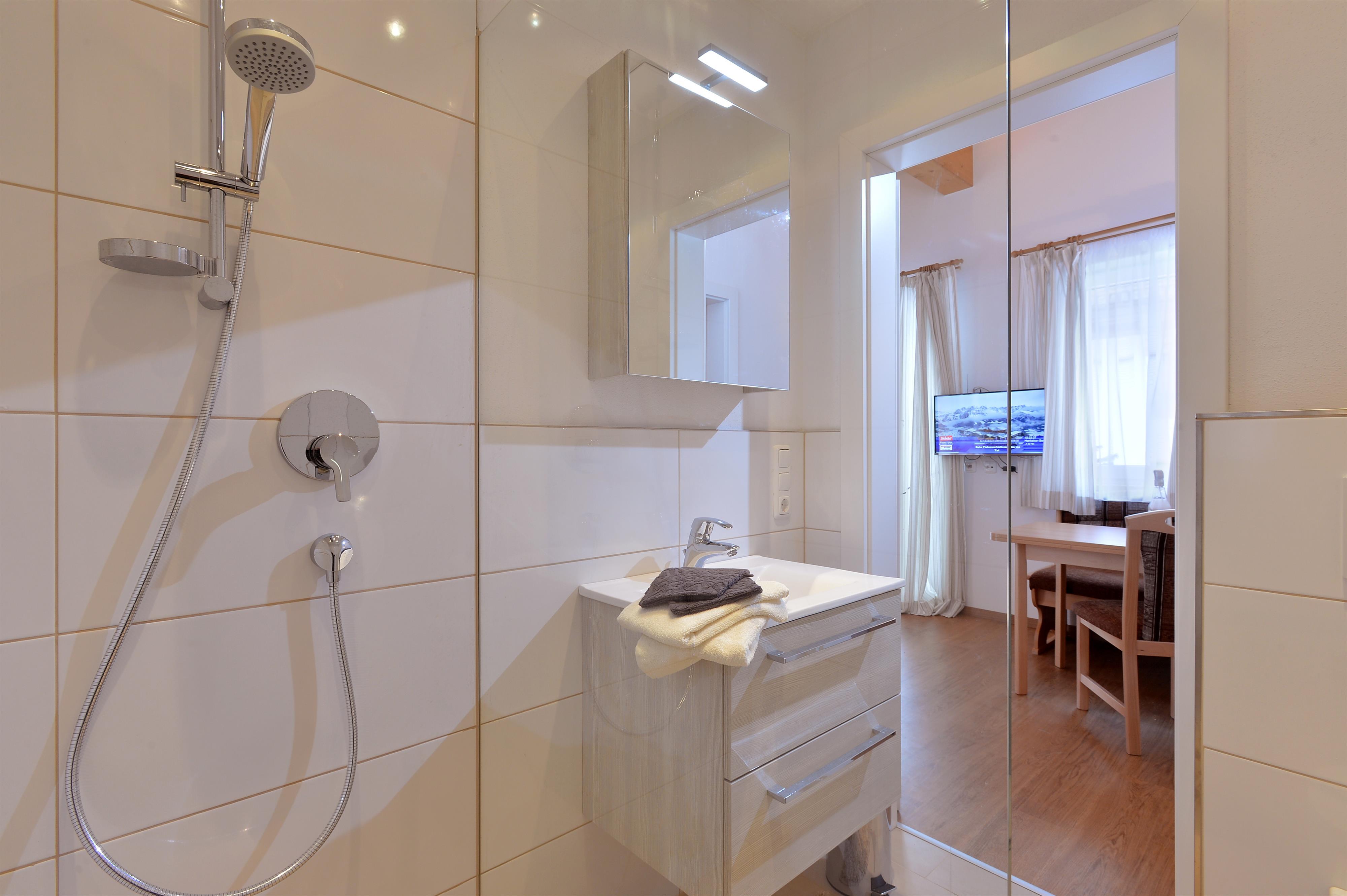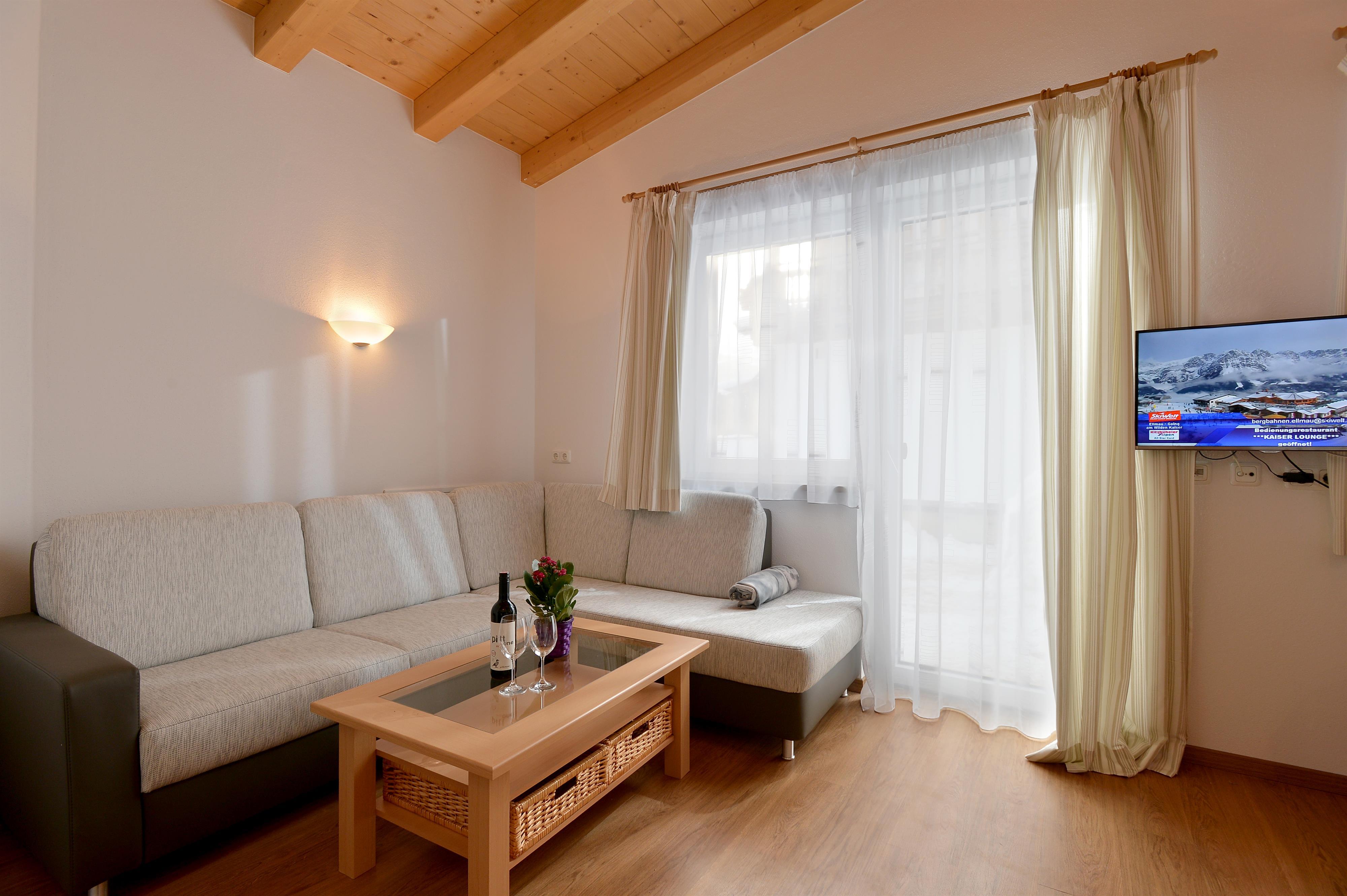 Unser ebenerdiges Appartement bietet Ihnen auf 50m² eine komplett ausgestattete Kochnische, eine gemütliche Eckbank, , Bad mit Dusche sowie 2 getrennte Schlafräume. Unserer schöner Sichtdachstuhl macht das Appartement erst richtig gemütlich. Die großzügige, südseitig gelegene Terrasse lädt zum Verweilen und Entspannen ein. Vom Balkon aus können Sie zusätzlich die beeindruckende Kulisse des Wilden Kaisers genießen.