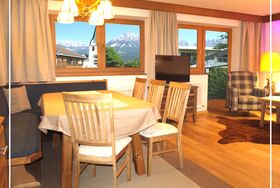 mit drei separaten Schlafzimmern, mit zwei Bäder mit Dusche/WC/ein WC separat, großer Wohn- und Essraum mit Eckbank, Sofalandschaft, großer Fernseher, kostenloses W-Lan und Terrasse mit Blick zum Wilden Kaiser,