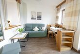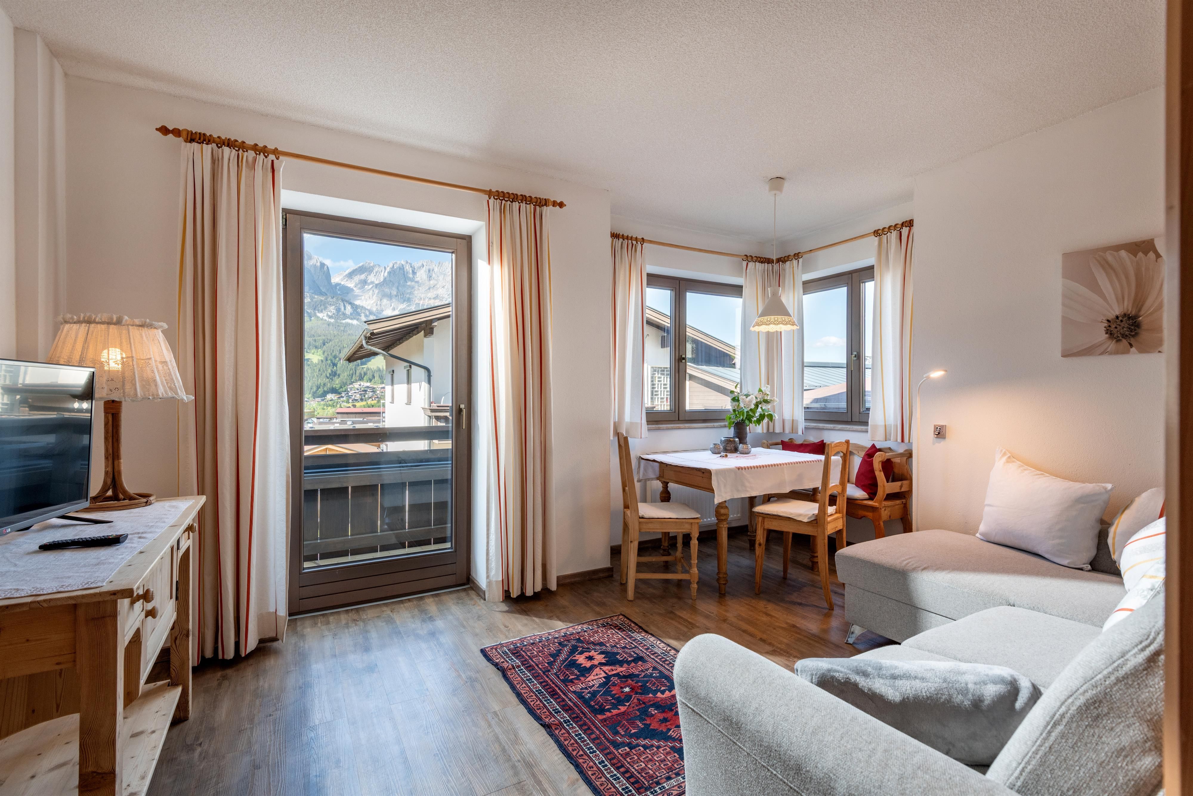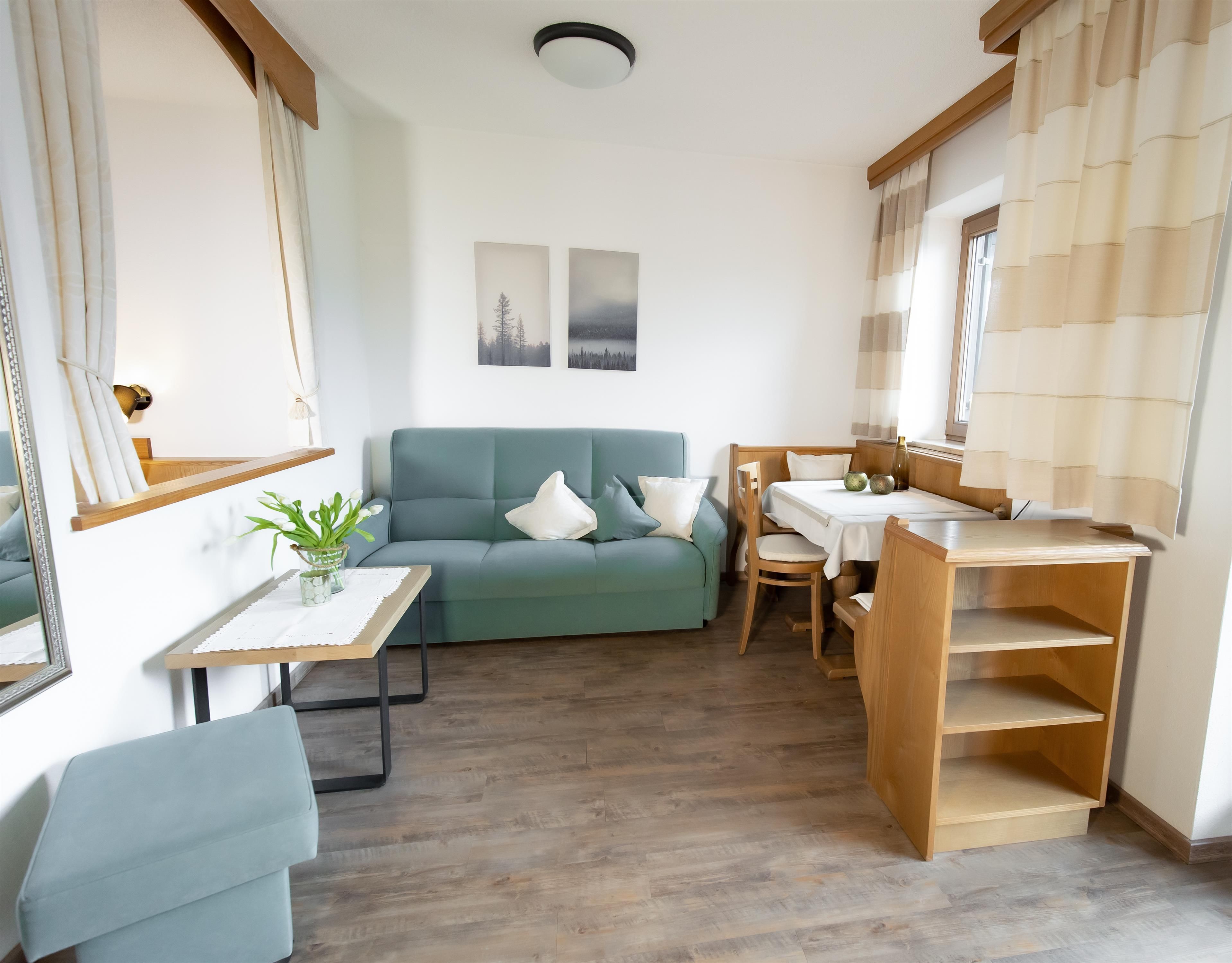 App. Typ I: Dieses Appartement hat ca.40m², einen Wohnschlafraum abgetrennt durch eine Trennwand, Küche mit Geschirrspüler, Wasserkocher, Toaster, Kaffeemaschine... Badezimmer mit Dusche, teilweise separates WC, gemütliche Sitzecke mit Dorfblick, Nordbalkon mit Blick zum Wilden Kaiser.