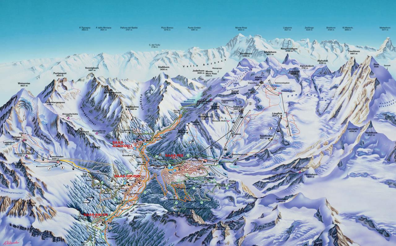 Die Wohnung befindet sich an sehr sonniger und ruhiger Aussichtslage nähe Wasserfall beim Dorfeingang. Die lokalen Bergbahnen sind in 5 Min zu Fuss erreichbar. Bushaltestelle ist nur 50 Meter entfernt. Saas-Fee ist in 10 und Saas-Grund in 5 Autominuten entfernt.
