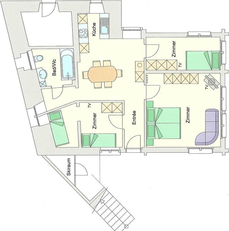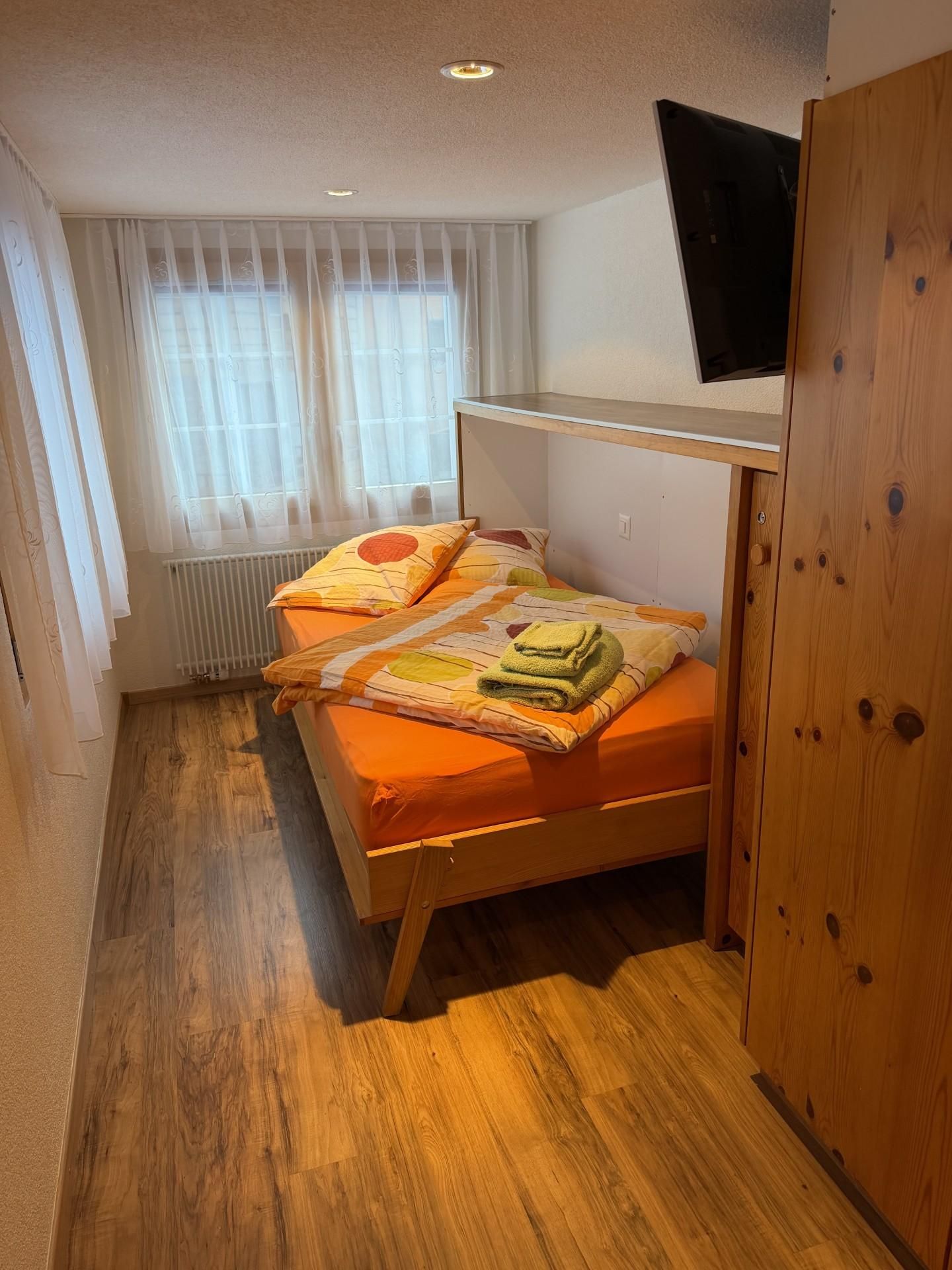 Heimelige 3 1/2 Zimmerwohnung, Parterre, 63 m2, 3 Schlafzimmer mit TV (2 Zimmer davon mit DVD), grosse Küche mit Geschirrspüler, Bad/WC mit Sprudelwanne, Wireless Internet.