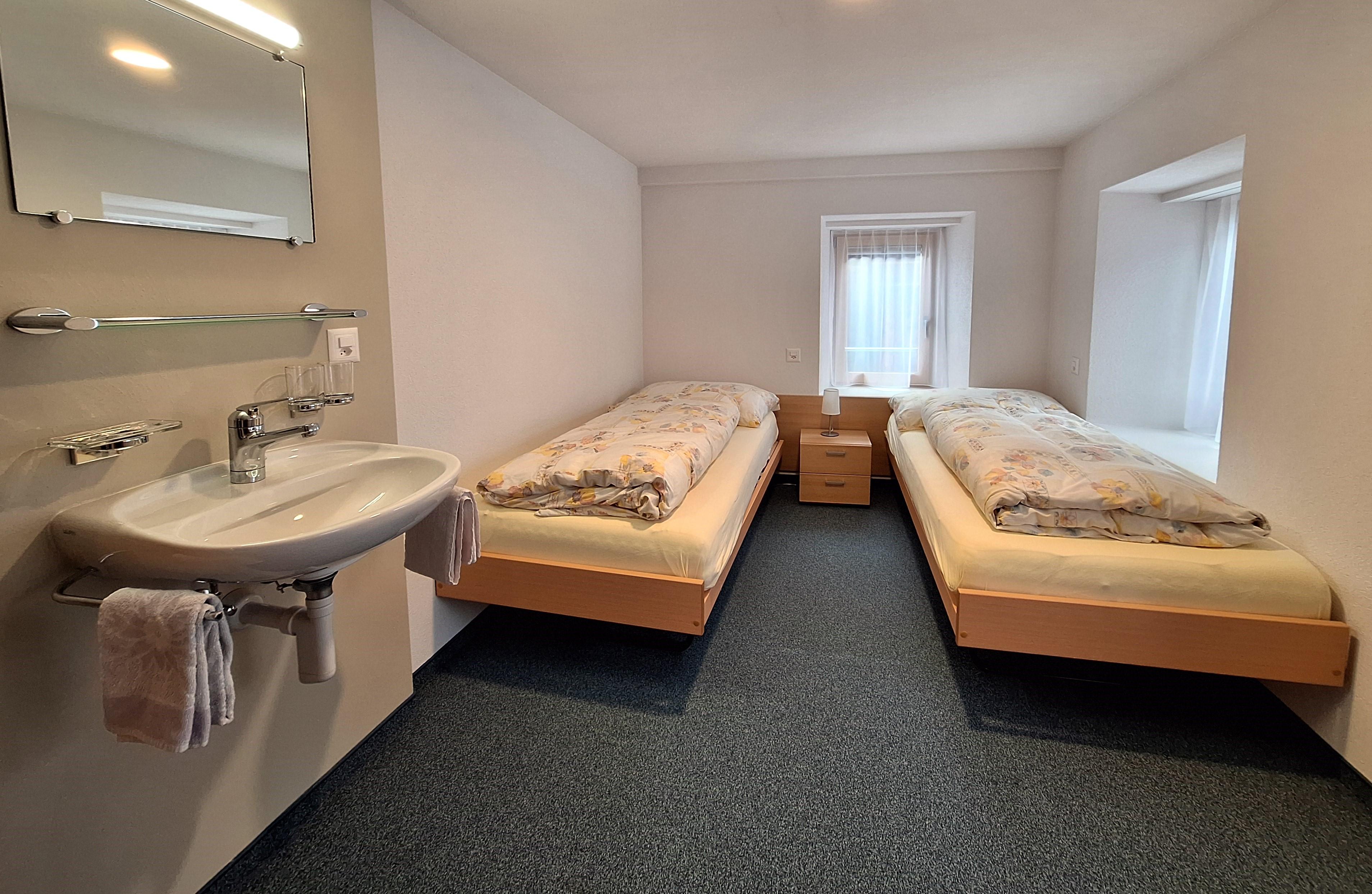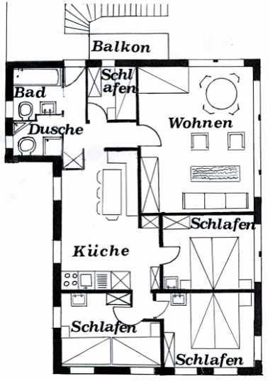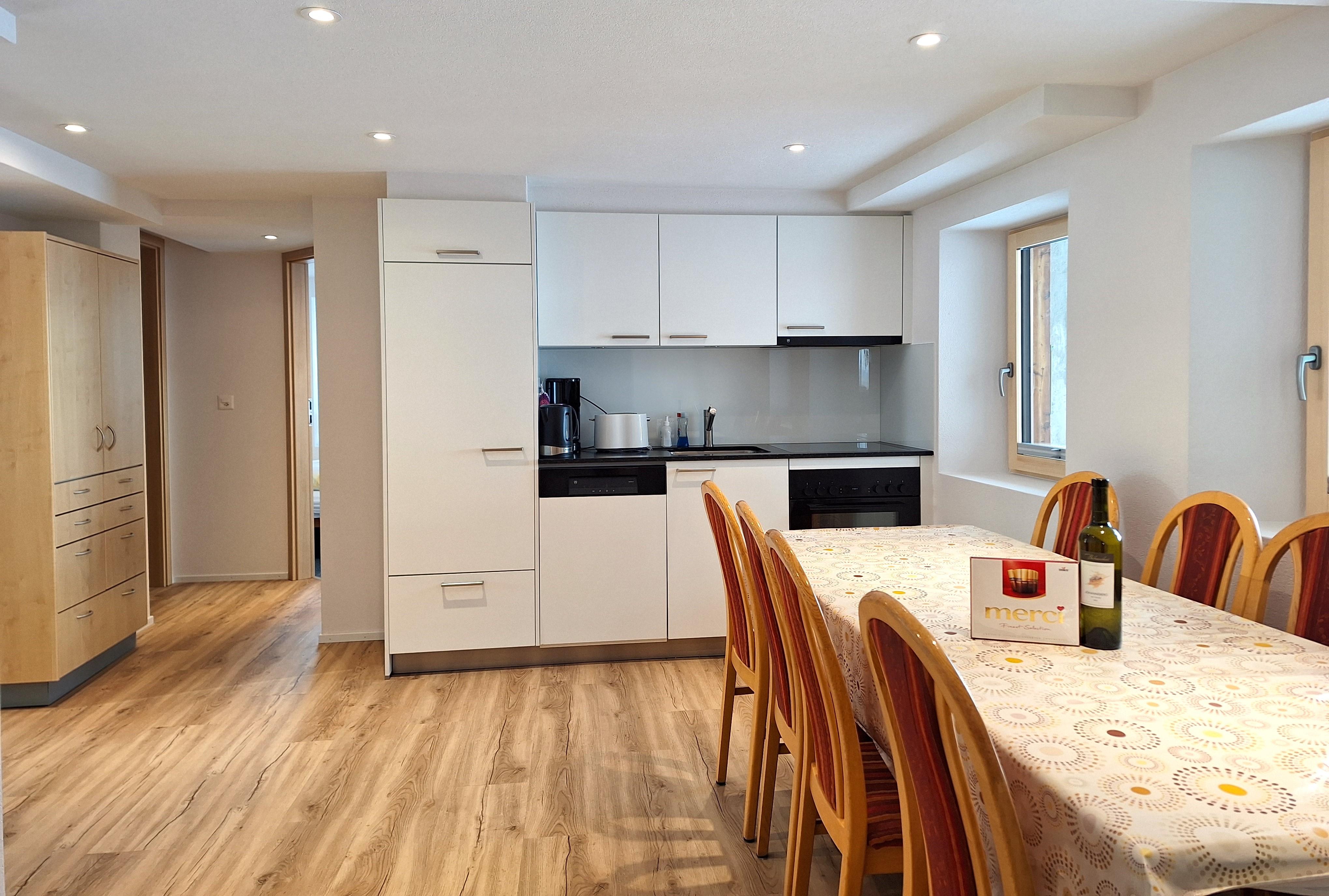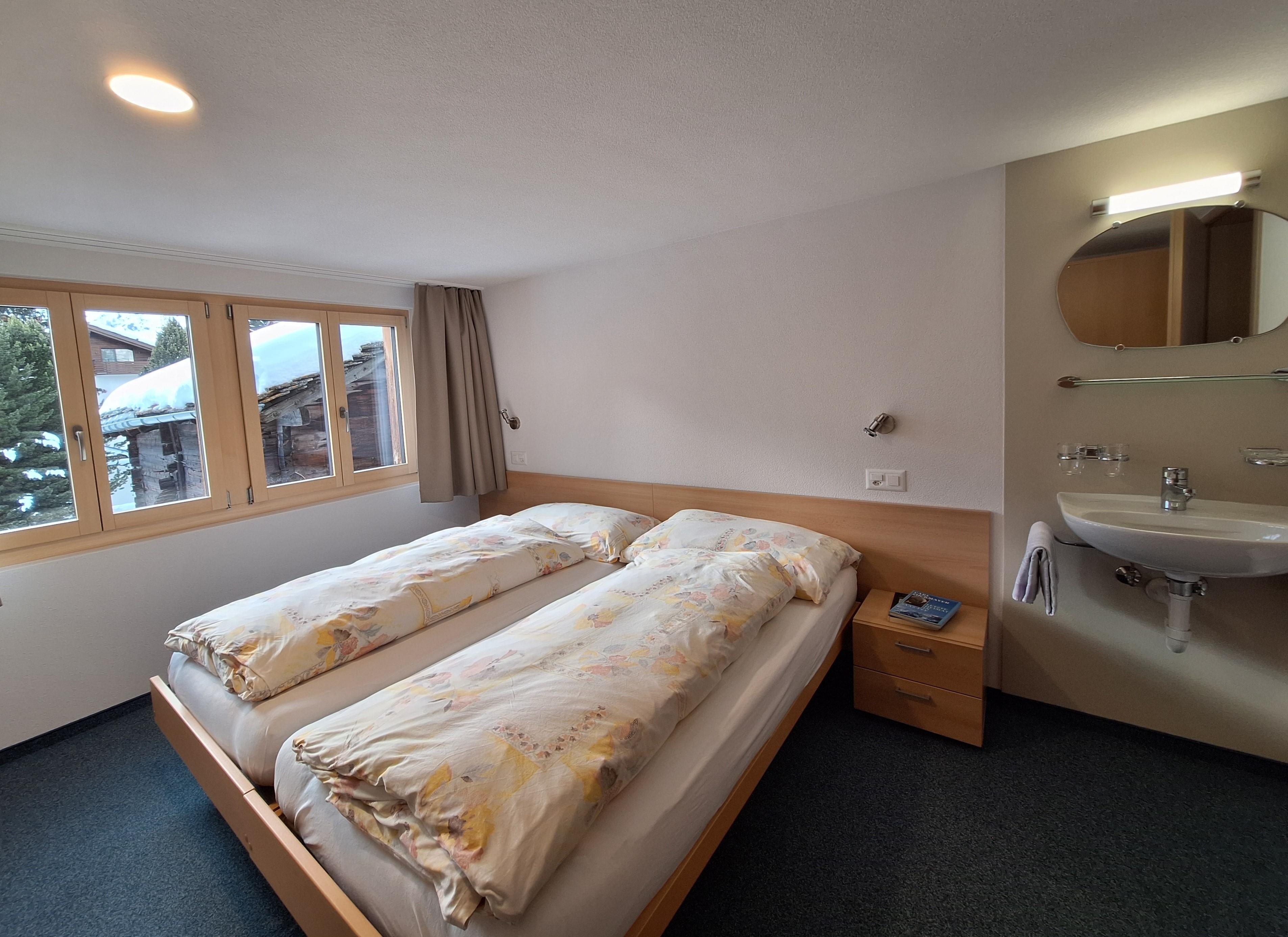 6-Zimmerwohnung (6-8 Betten, 100 m2), 1. Stock, 3 Doppelschlafzimmer mit Waschbecken, 1 Einzelzimmer, Wohnzimmer mit 1 Bett, Wohn-/Essküche mit Geschirrspülmaschine, 1 Bad/WC, 1 Dusche/WC, WiFi, TV, Radio.