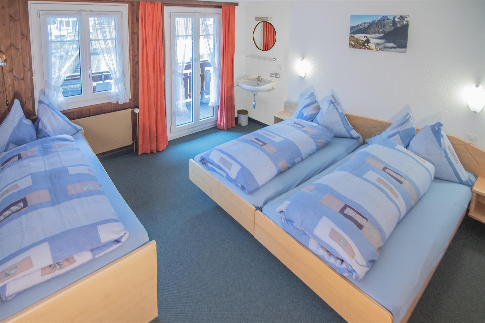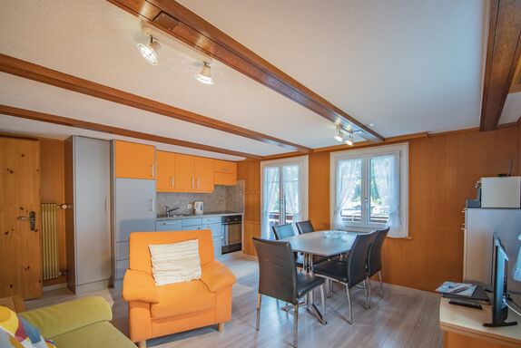 3-Zimmerwohnung (60 m2), 3.Stock, 1 Doppel und 1 Dreibettzimmer, Wohnzimmer mit neu renovierter Küche mit Geschirrspüler, Dusche, Südbalkon mit Ausblick auf die Berge, gratis W-Lan. Kabelfernsehen. Haus im Chaletstil erbaut, Wohnungsausstattung rustikal und komfortabel, zentrale und ruhige Lage, schöne Aussicht auf die Bergwelt. Kurtaxe wird separat einkassiert. Haustiere nicht gestattet.