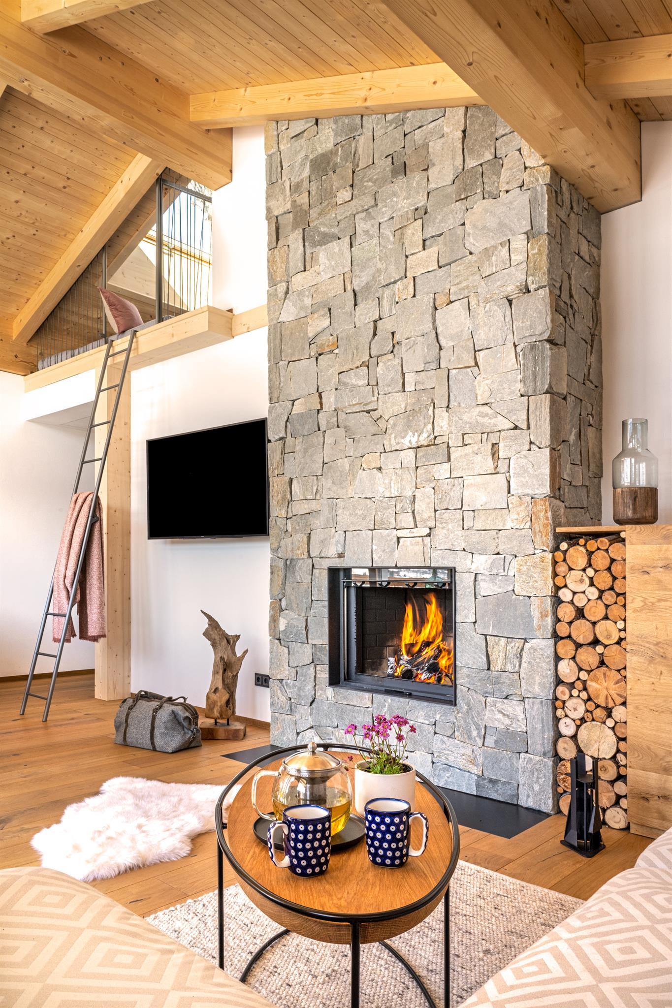 Die Suite verfügt über einen großzügigen Wohn-Essbereich mit voll ausgestatteter offener Küche mit Kücheninsel, ein getrenntes Schlafzimmer mit high-end Komfortbetten, eine französische Schlafcouch, ein Badezimmer mit WC und italienischen Badmöbeln, ein separates WC mit Waschtrockner sowie eine Smart-house Elektroinstallation, ein 4 m hohe Kamin aus handgeschlagenem Stein, der Adlerhorst und eine Klimaanlage.