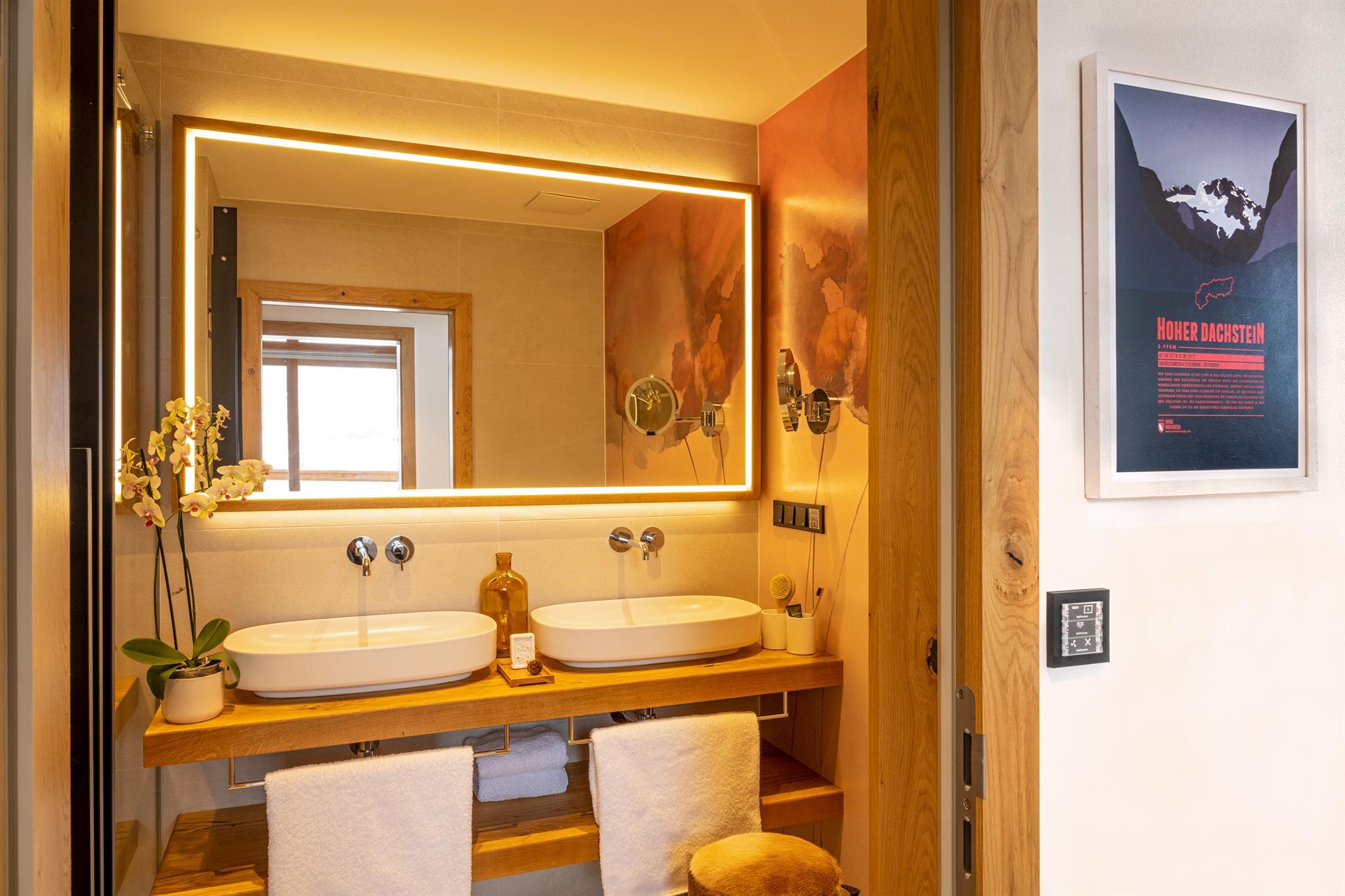 Hochwertigste Materialien treffen im Alpine-Cosmopolitan Design auf eine atemberaubende Aussicht auf das Dachsteinmassiv und die Niederen Tauern. Die West-Nord-Ausrichtung der Suite bietet Sonne ganzjährig ab der Mittagszeit, im Sommer auch zur frühen Morgenstunde.