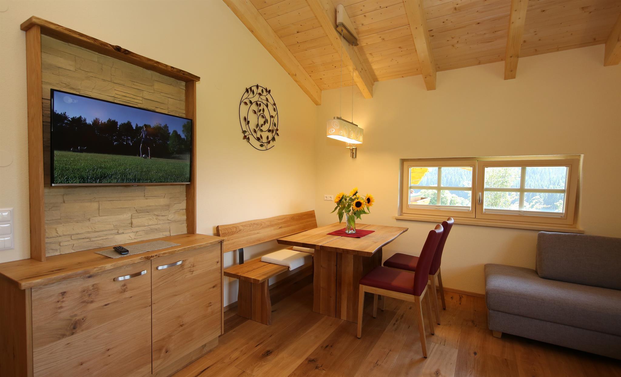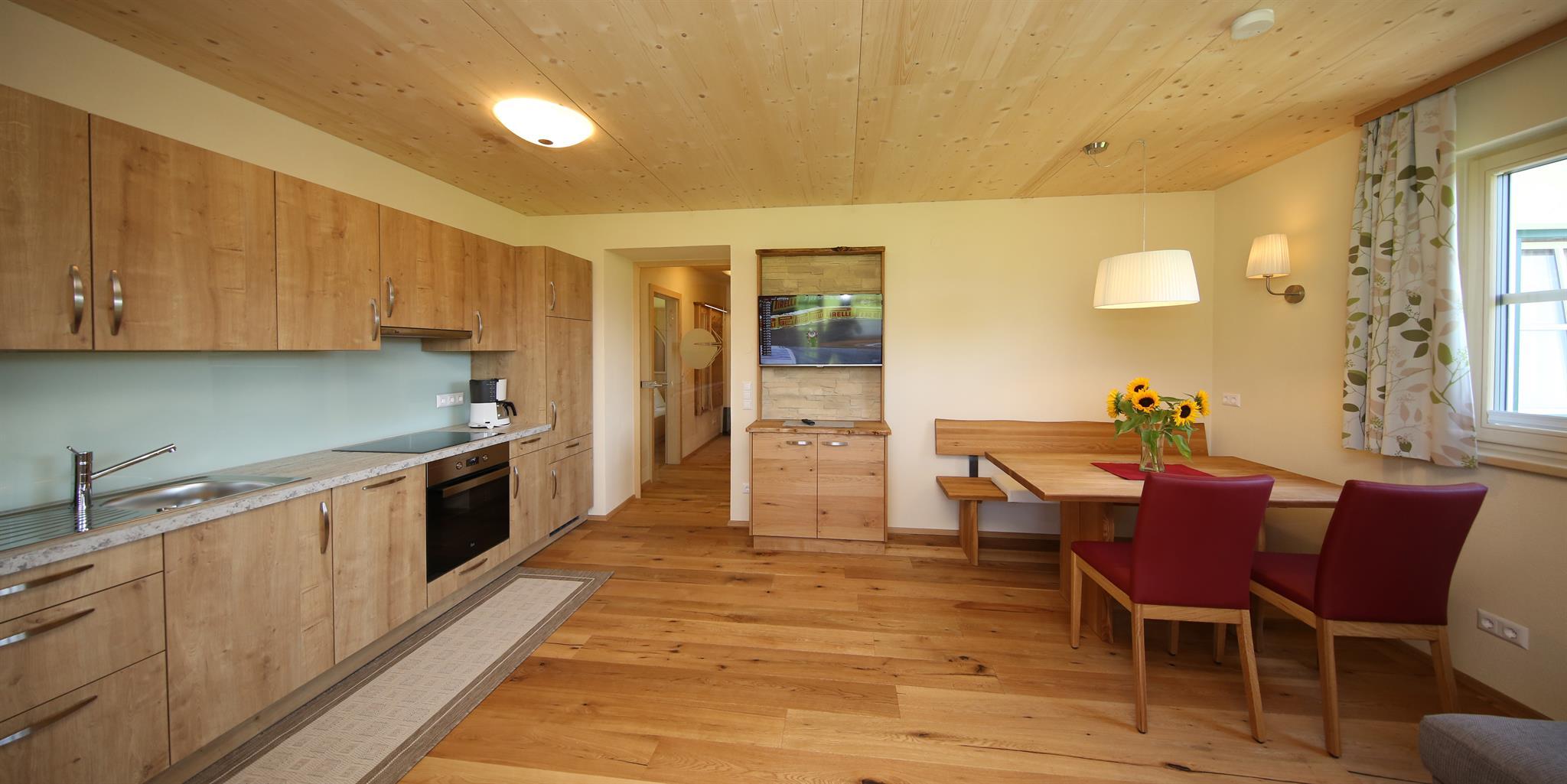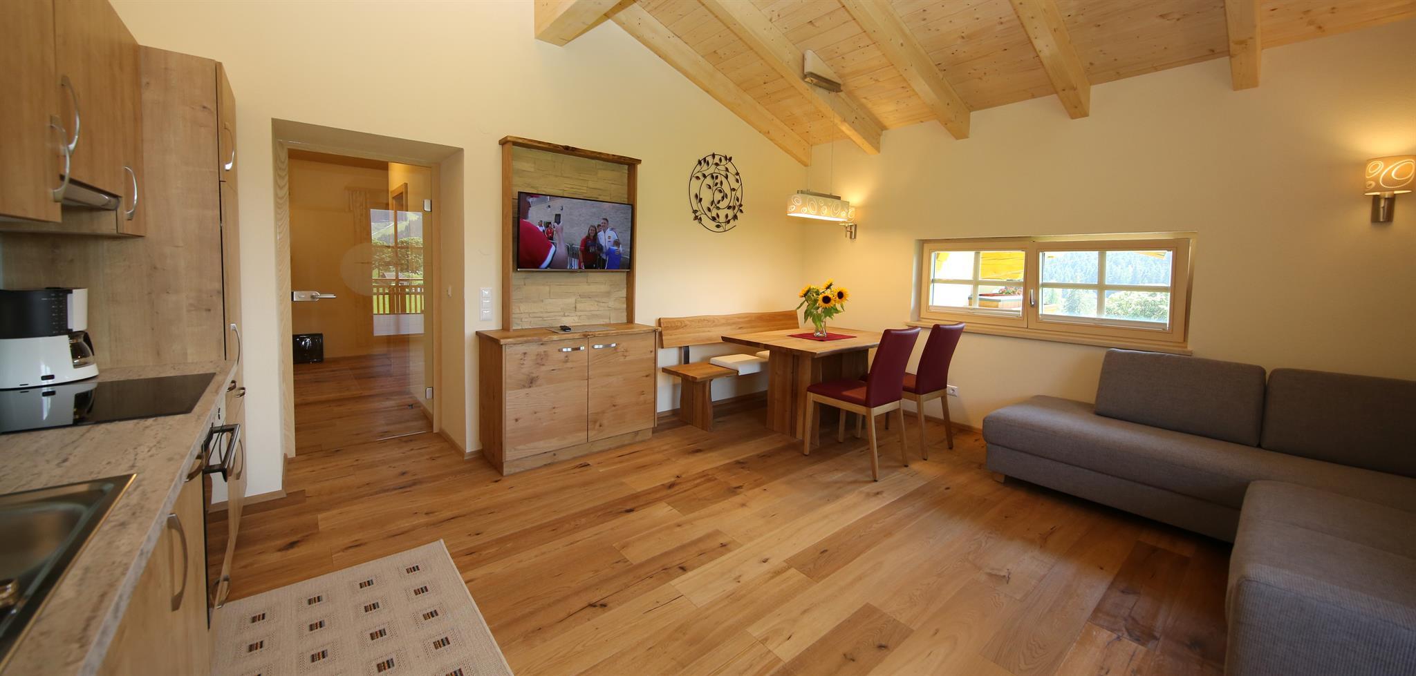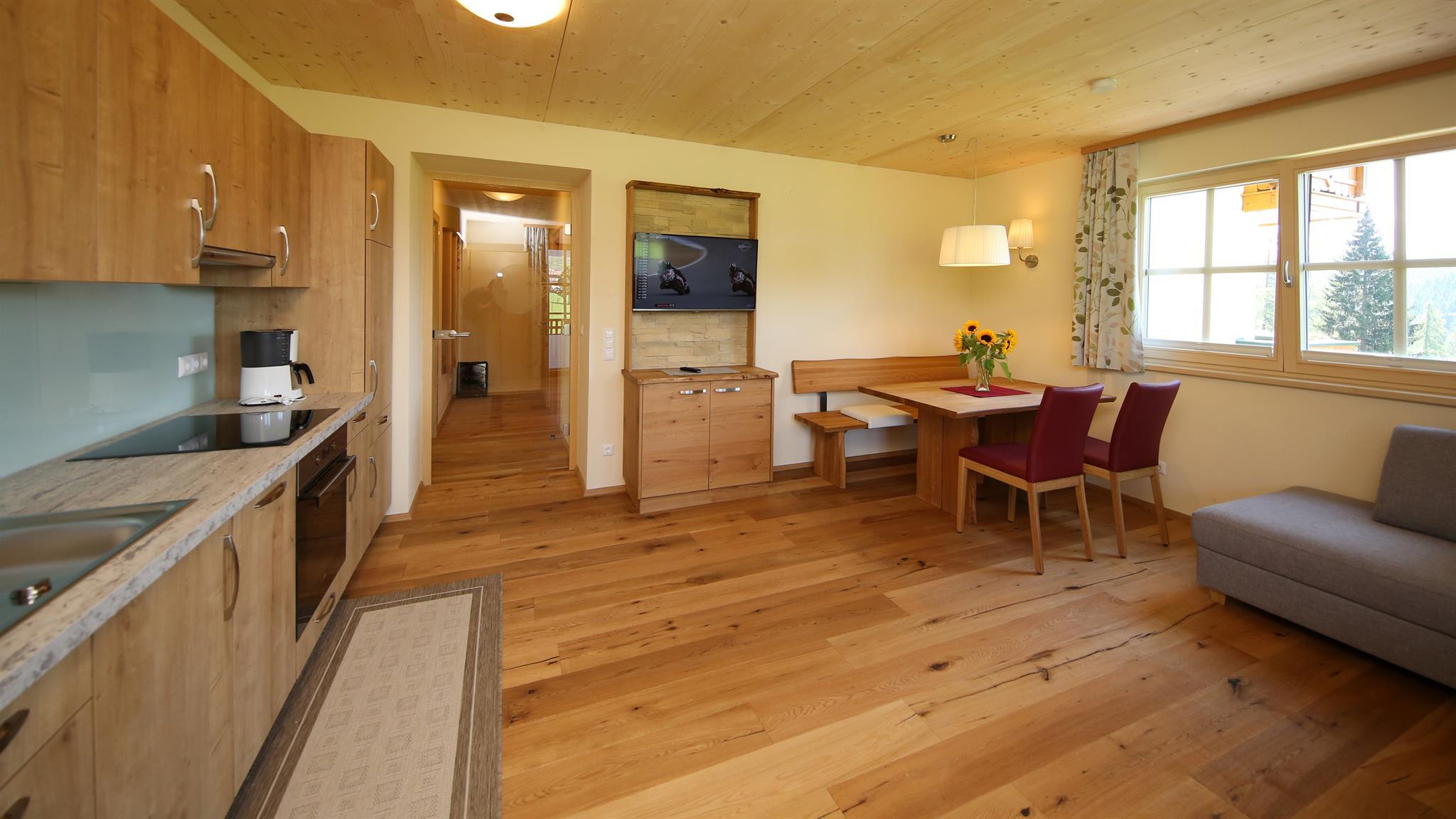 Wir bieten in unserem Haus Alpenperle auch die Möglichkeit, 2 großzügige Ferienwohnungen für 2-4 Personen und eine kleinere für 2-3 Personen zu mieten. Gut durchdacht, von heimischen Handwerksbetrieben mit viel Holz und natürlichen Materiallien ausgestattet, verfügen die beiden großen Wohnungen über je 2 Schlafzimmer, - die kleinere über 1 Schlafzimmer -, ein Bad, ein geräumiges Wohnzimmer mit einer voll ausgestatteten Küche (Geschirrspüler, Induktionsherd, Backrohr), eine Ess- und Couchecke, sowie einen schönen, bei den großen nach Westen und bei der kleinen nach Süden ausgerichteten Balkon, der neben einem herrlichen Ausblick in die Natur auch Sonne bis in die Abendstunden garantiert.