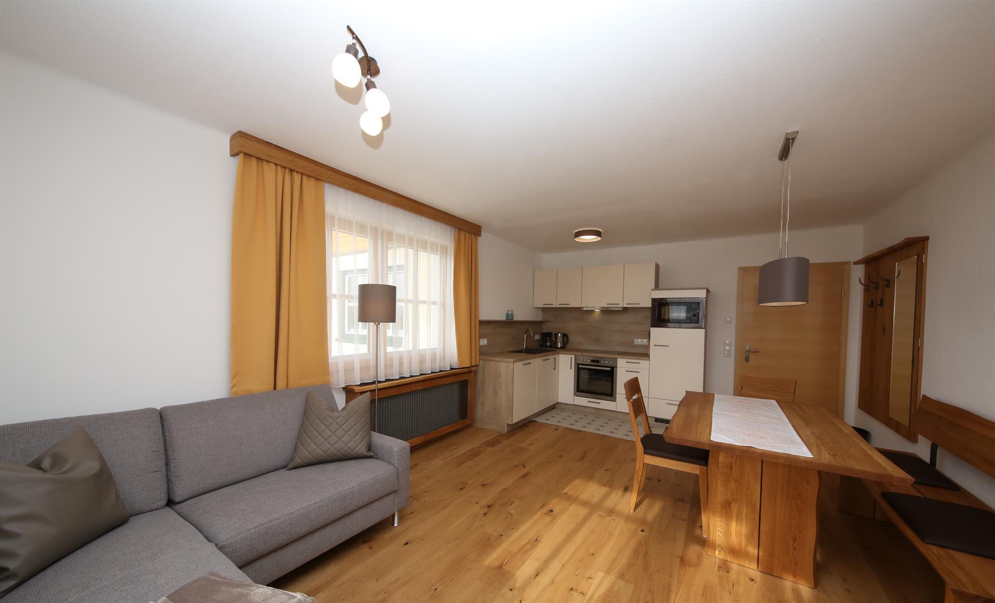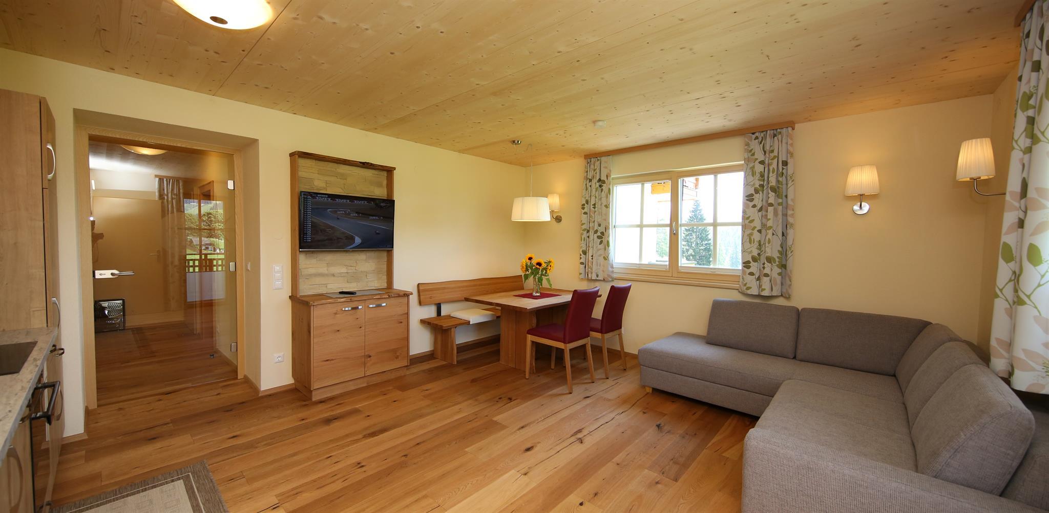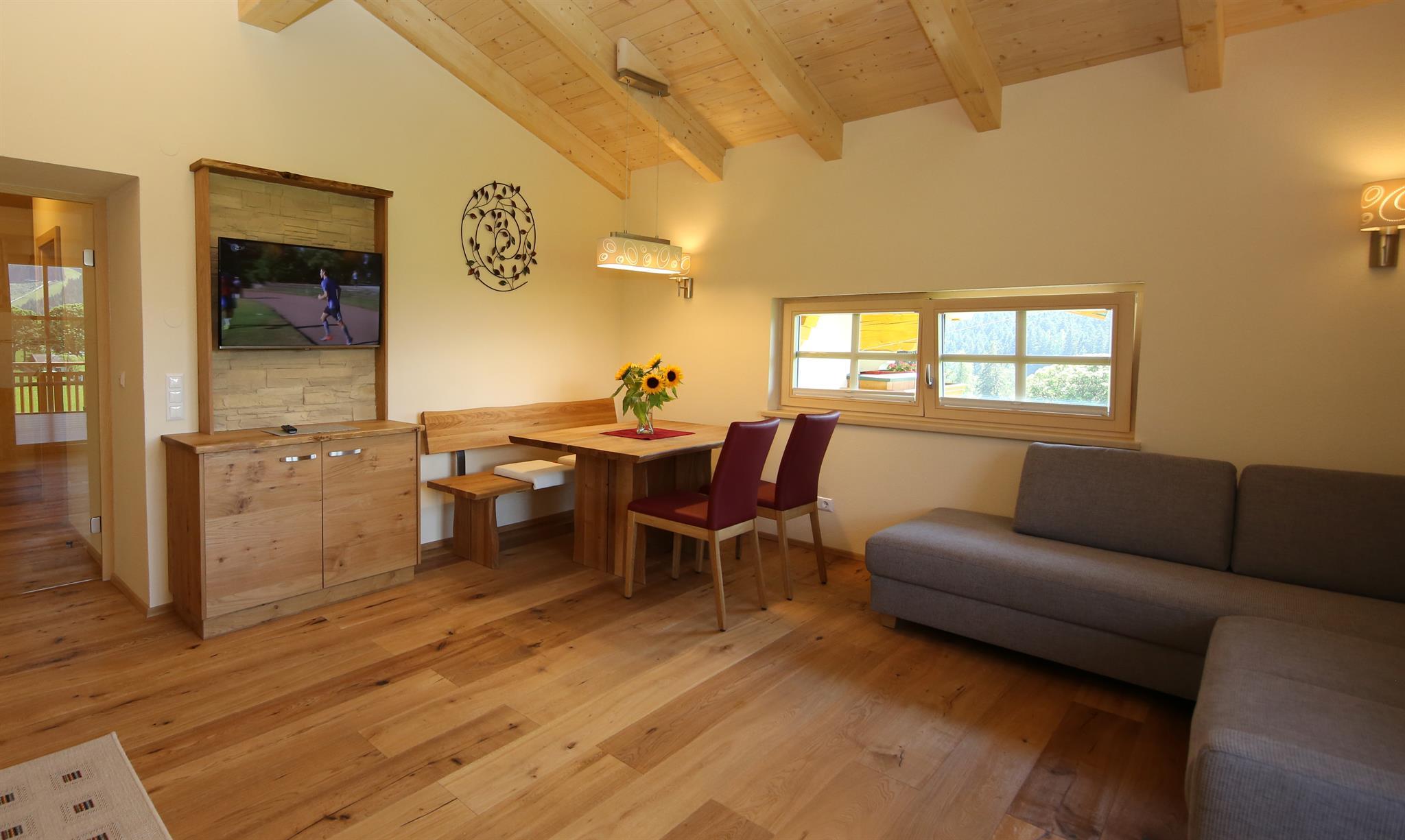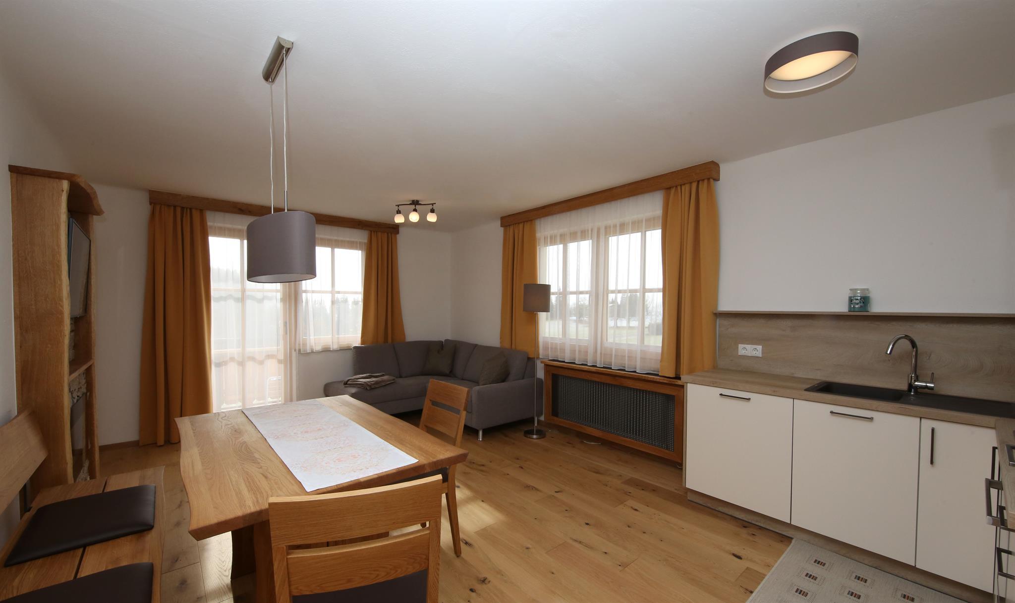 Wir bieten in unserem Haus Alpenperle auch die Möglichkeit, 2 großzügige Ferienwohnungen für 2-4 Personen und eine kleinere für 2-3 Personen zu mieten. Gut durchdacht, von heimischen Handwerksbetrieben mit viel Holz und natürlichen Materiallien ausgestattet, verfügen die beiden großen Wohnungen über je 2 Schlafzimmer, - die kleinere über 1 Schlafzimmer -, ein Bad, ein geräumiges Wohnzimmer mit einer voll ausgestatteten Küche (Geschirrspüler, Induktionsherd, Backrohr), eine Ess- und Couchecke, sowie einen schönen, bei den großen nach Westen und bei der kleinen nach Süden ausgerichteten Balkon, der neben einem herrlichen Ausblick in die Natur auch Sonne bis in die Abendstunden garantiert.
