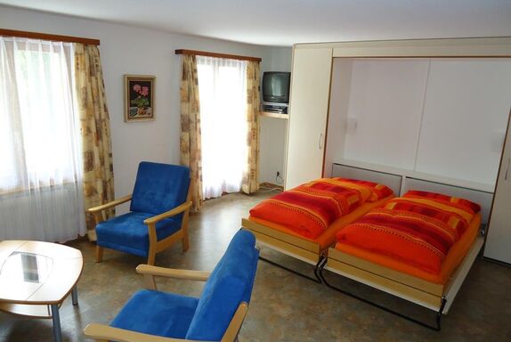 2-Zimmerwohnung (56 m2), 2.Stock, komfortabel eingerichtet, 1 Wohnschlafzimmer, 1 Doppelschlafzimmer, Küche, Bad/WC, TV, Süd-Balkon.