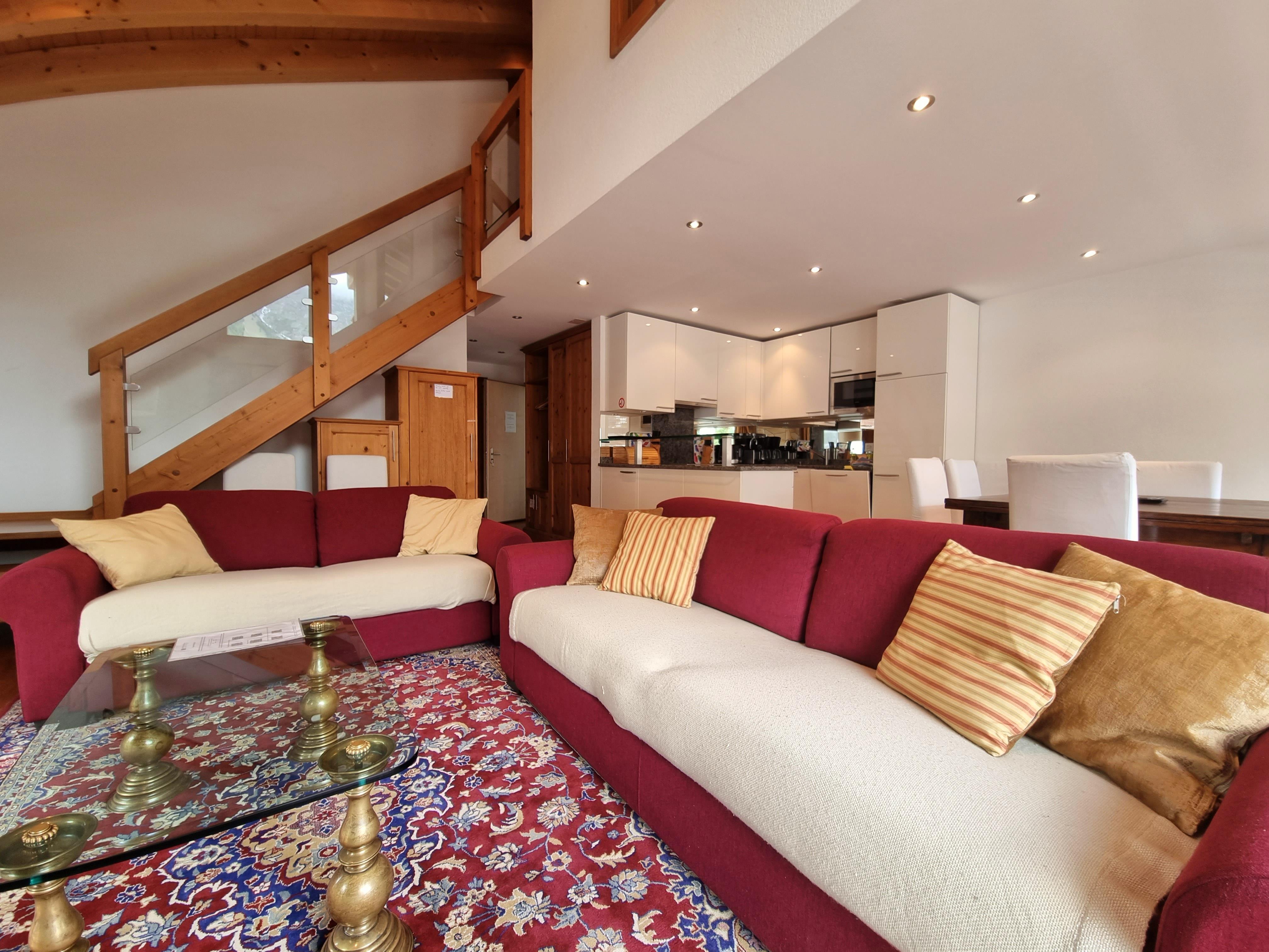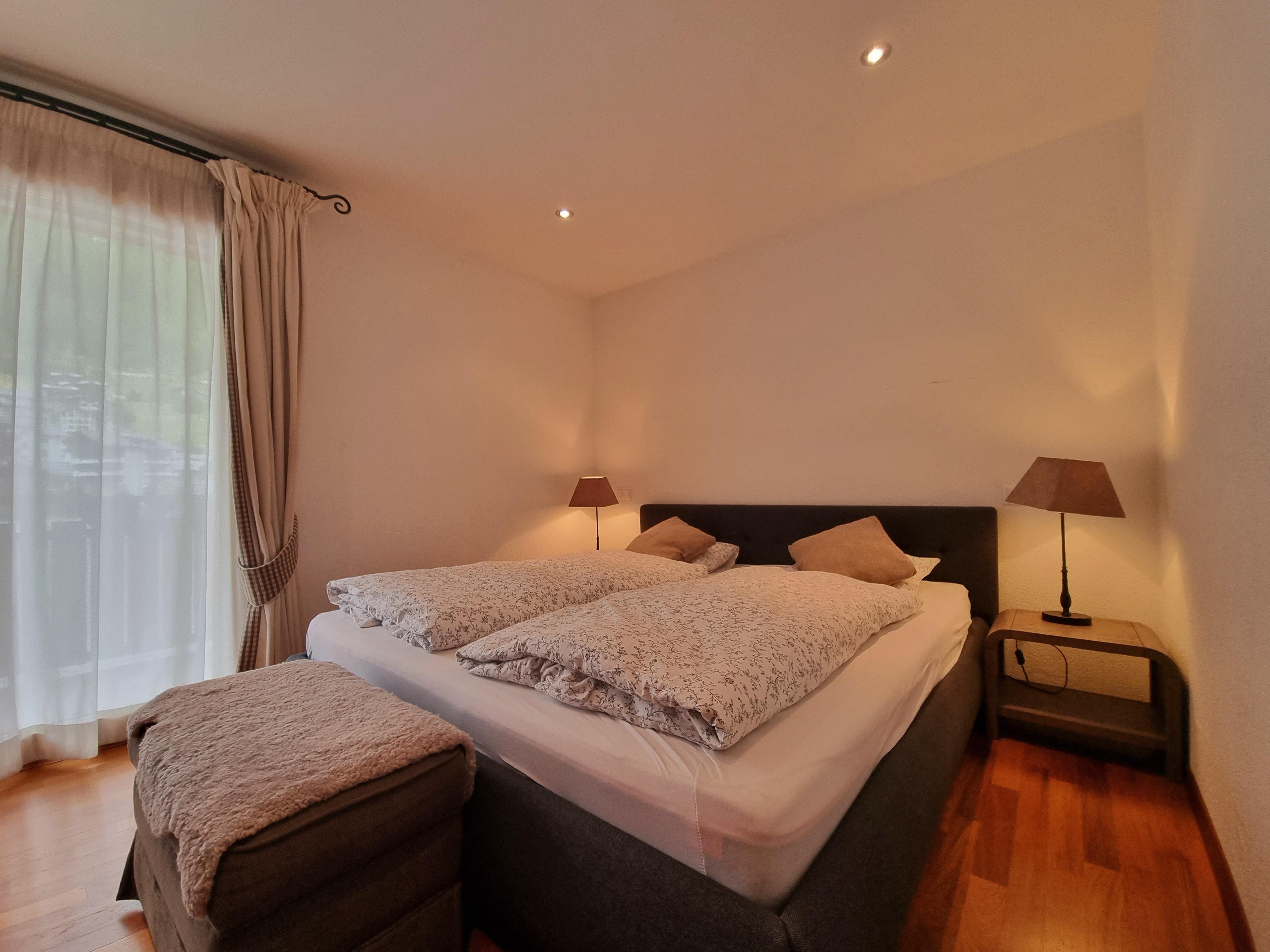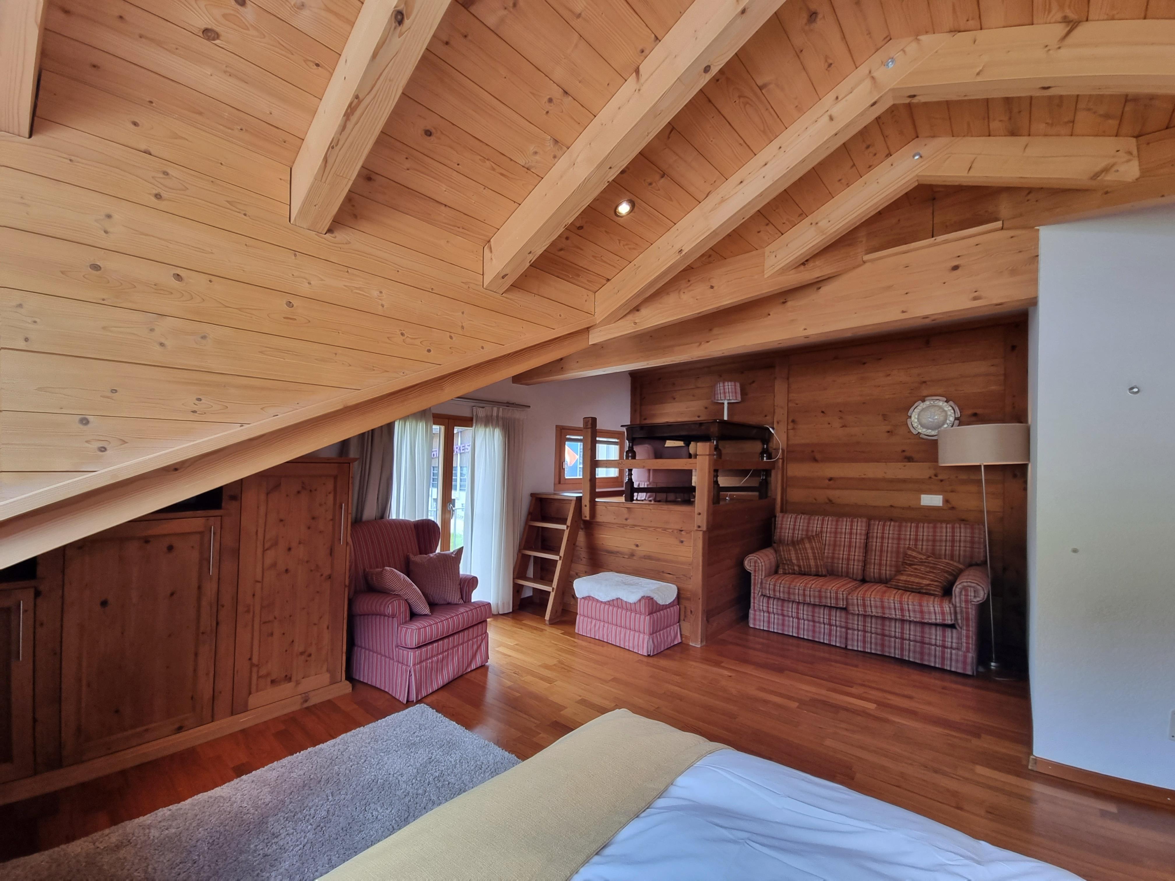 Perla 38, 4-Zimmer-Attikawohnung (140 m2) auf 2 Stockwerken, Südwestlage, geräumig und hell, geschmackvoll und mit viel Holz eingerichtet: offenes grosses Wohn-/Esszimmer mit offenem Kamin und Esstisch. 1 Doppelzimmer mit 1 Doppelbett (180 cm) und 1 Schlafsofa (120 cm). Ausgang zum Balkon. Offene Küche (Backofen, Geschirrspüler, Glaskeramikherd, Mikrowelle, elektrische Kaffeemaschine). Bad/WC. Obergeschoss: 1 Doppelzimmer mit 2 Betten. Ausgang zum Balkon, Richtung Süden. 1 abgeschrägtes grosses Doppelzimmer mit 1 Doppelbett (180 cm) und 1 Schlafsofa (120 cm). Bad/Dusche/WC, Sprudelbadewanne. Zur Verfügung: Internet (Wireless LAN).