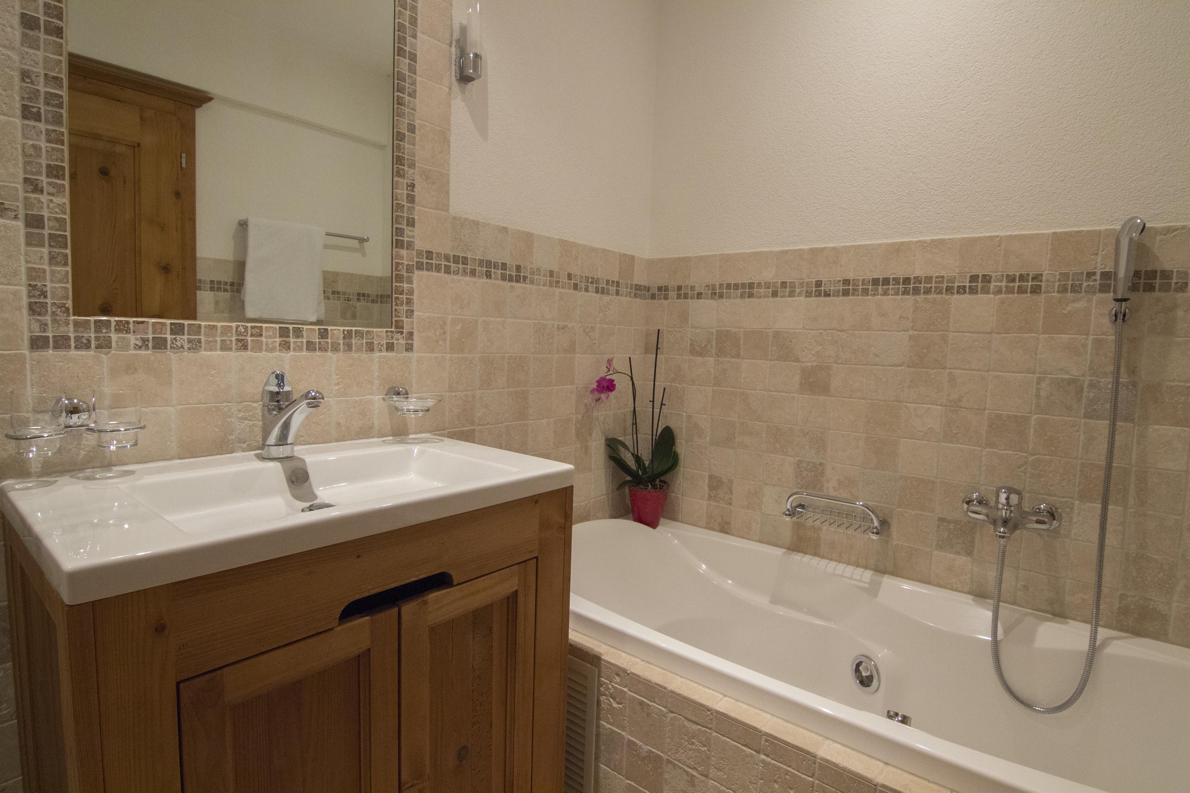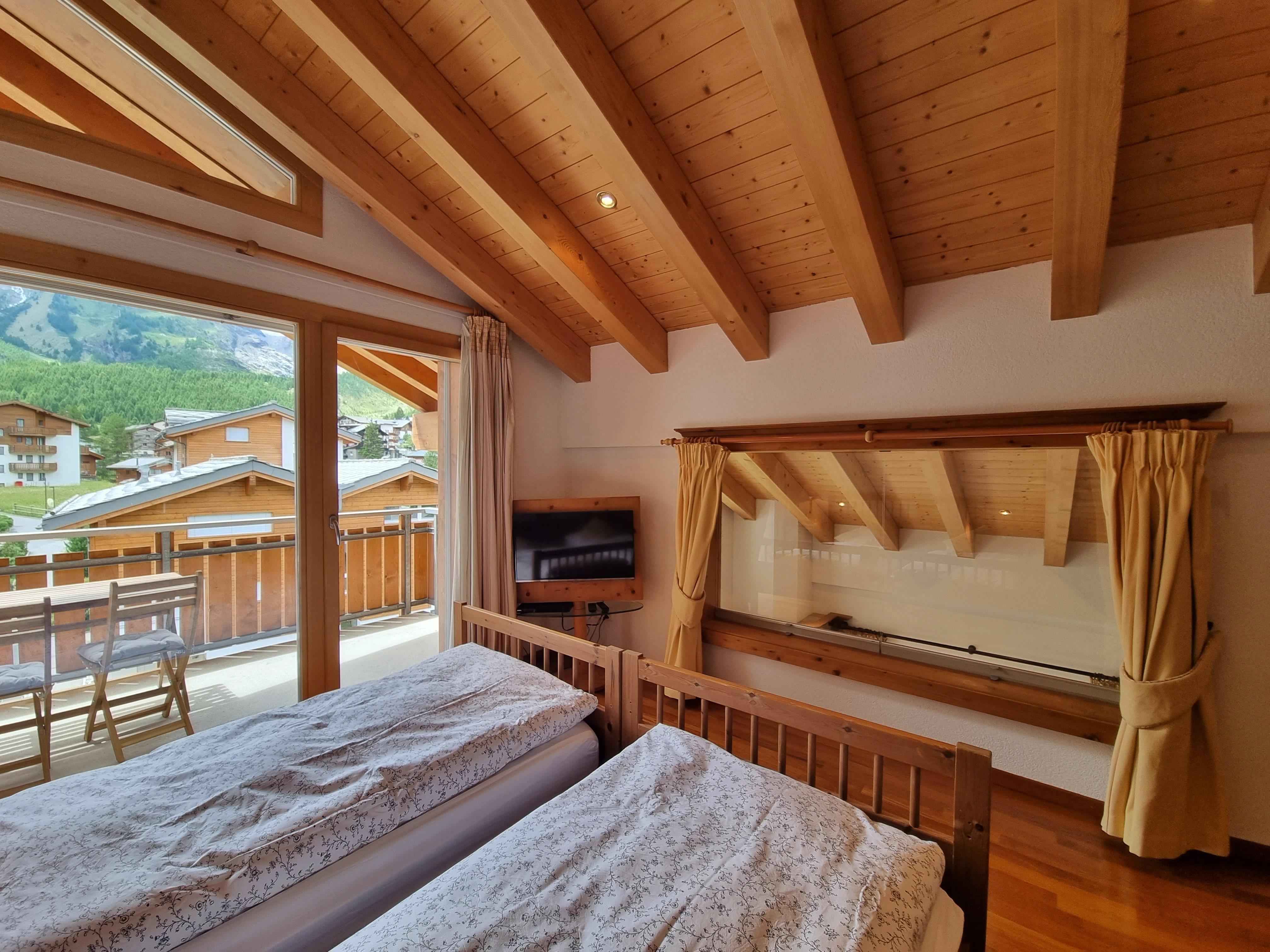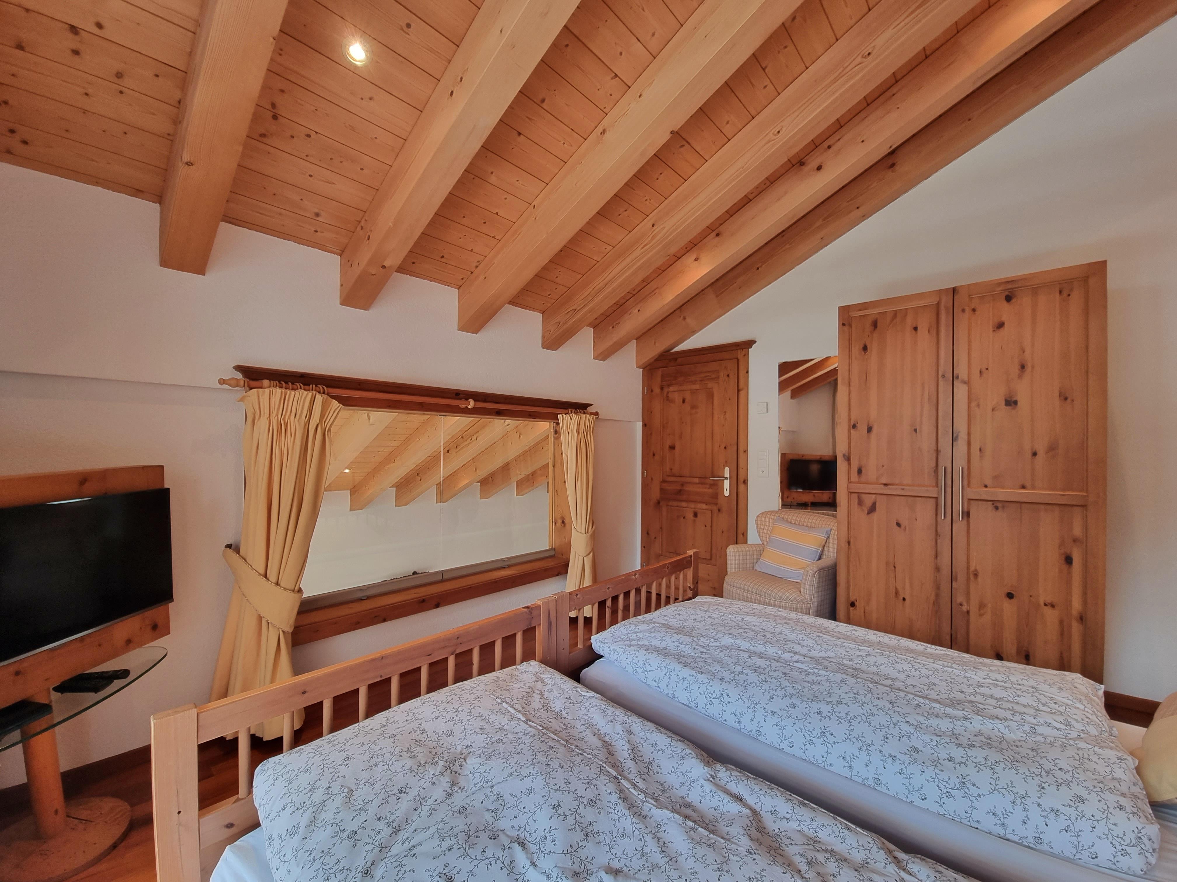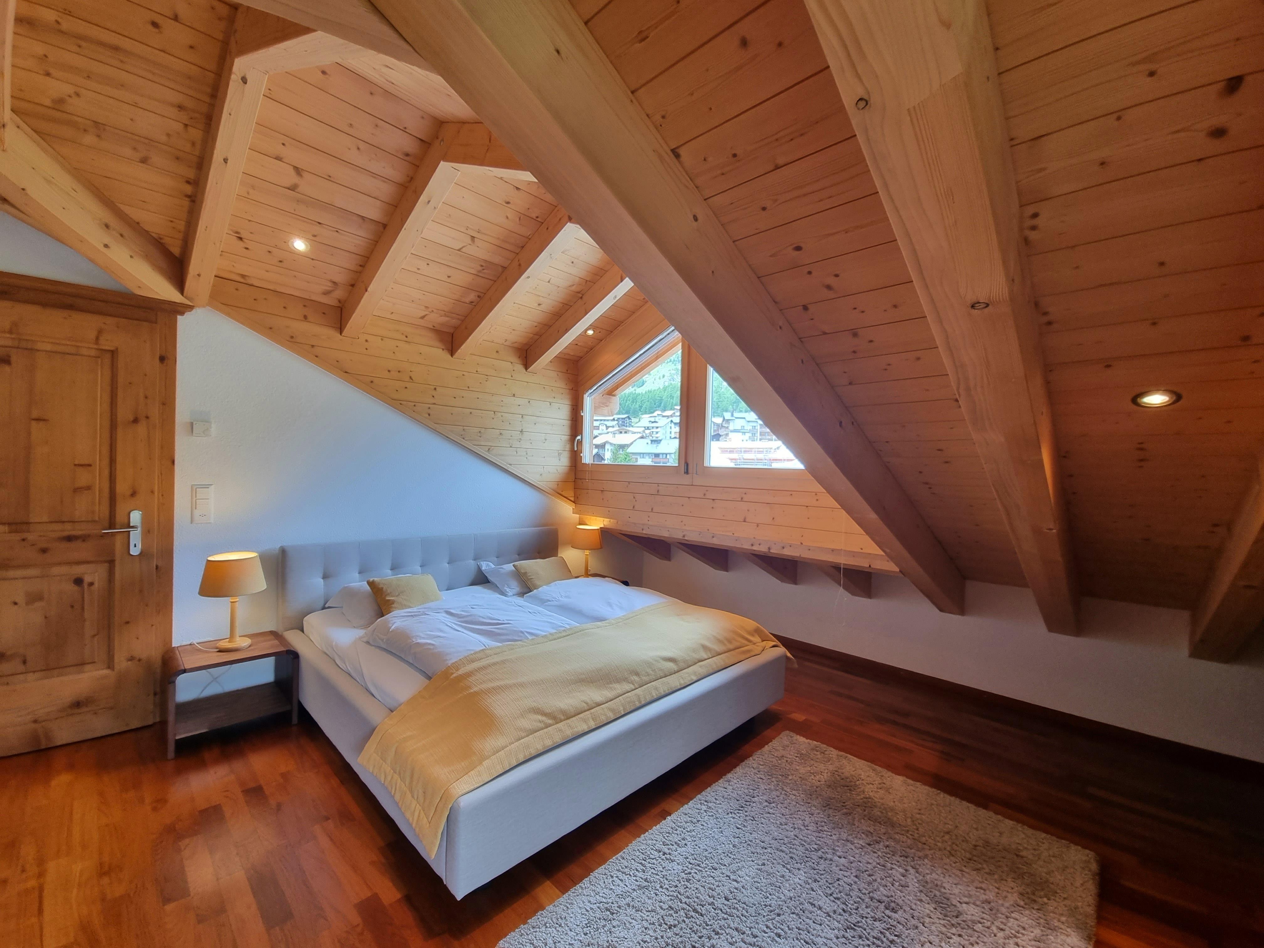 Perla 38, 4-Zimmer-Attikawohnung (140 m2) auf 2 Stockwerken, Südwestlage, geräumig und hell, geschmackvoll und mit viel Holz eingerichtet: offenes grosses Wohn-/Esszimmer mit offenem Kamin und Esstisch. 1 Doppelzimmer mit 1 Doppelbett (180 cm) und 1 Schlafsofa (120 cm). Ausgang zum Balkon. Offene Küche (Backofen, Geschirrspüler, Glaskeramikherd, Mikrowelle, elektrische Kaffeemaschine). Bad/WC. Obergeschoss: 1 Doppelzimmer mit 2 Betten. Ausgang zum Balkon, Richtung Süden. 1 abgeschrägtes grosses Doppelzimmer mit 1 Doppelbett (180 cm) und 1 Schlafsofa (120 cm). Bad/Dusche/WC, Sprudelbadewanne. Zur Verfügung: Internet (Wireless LAN).