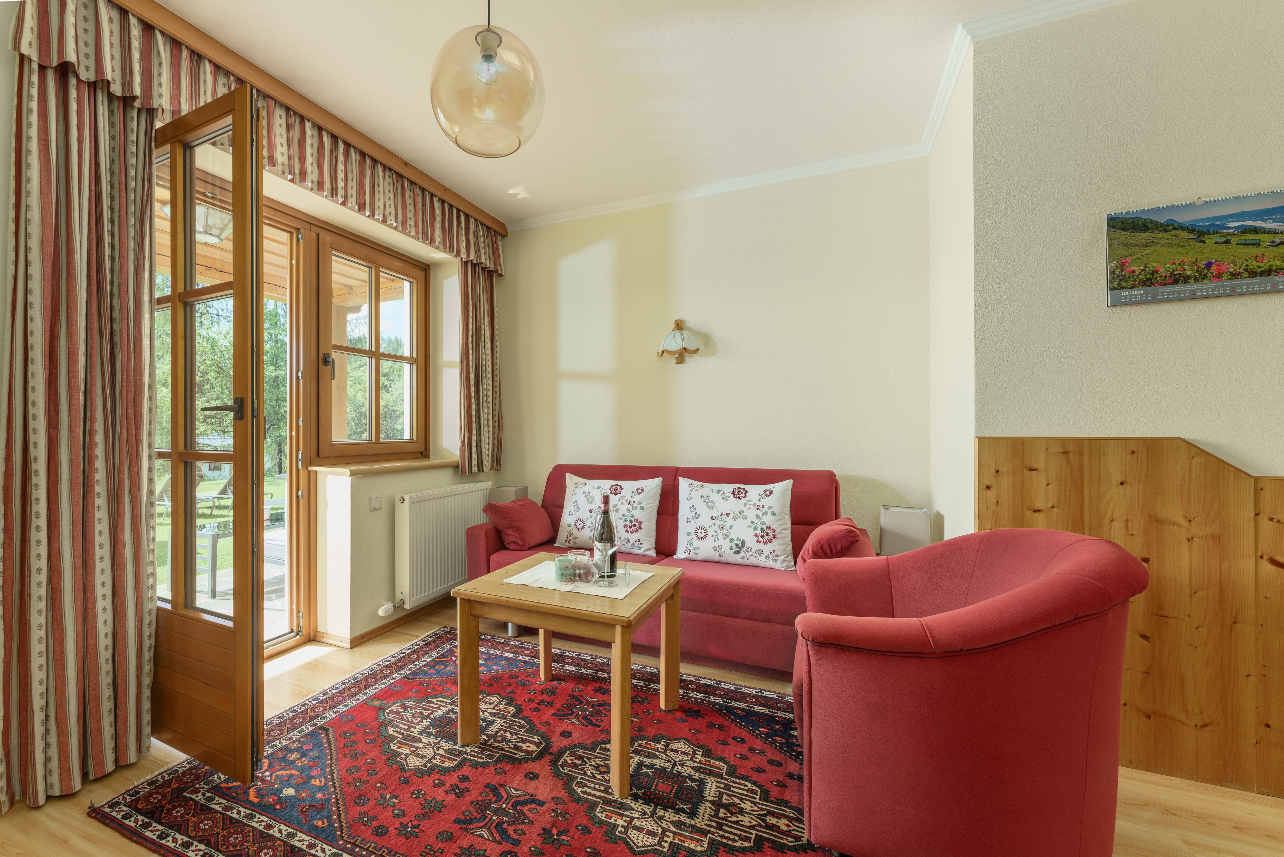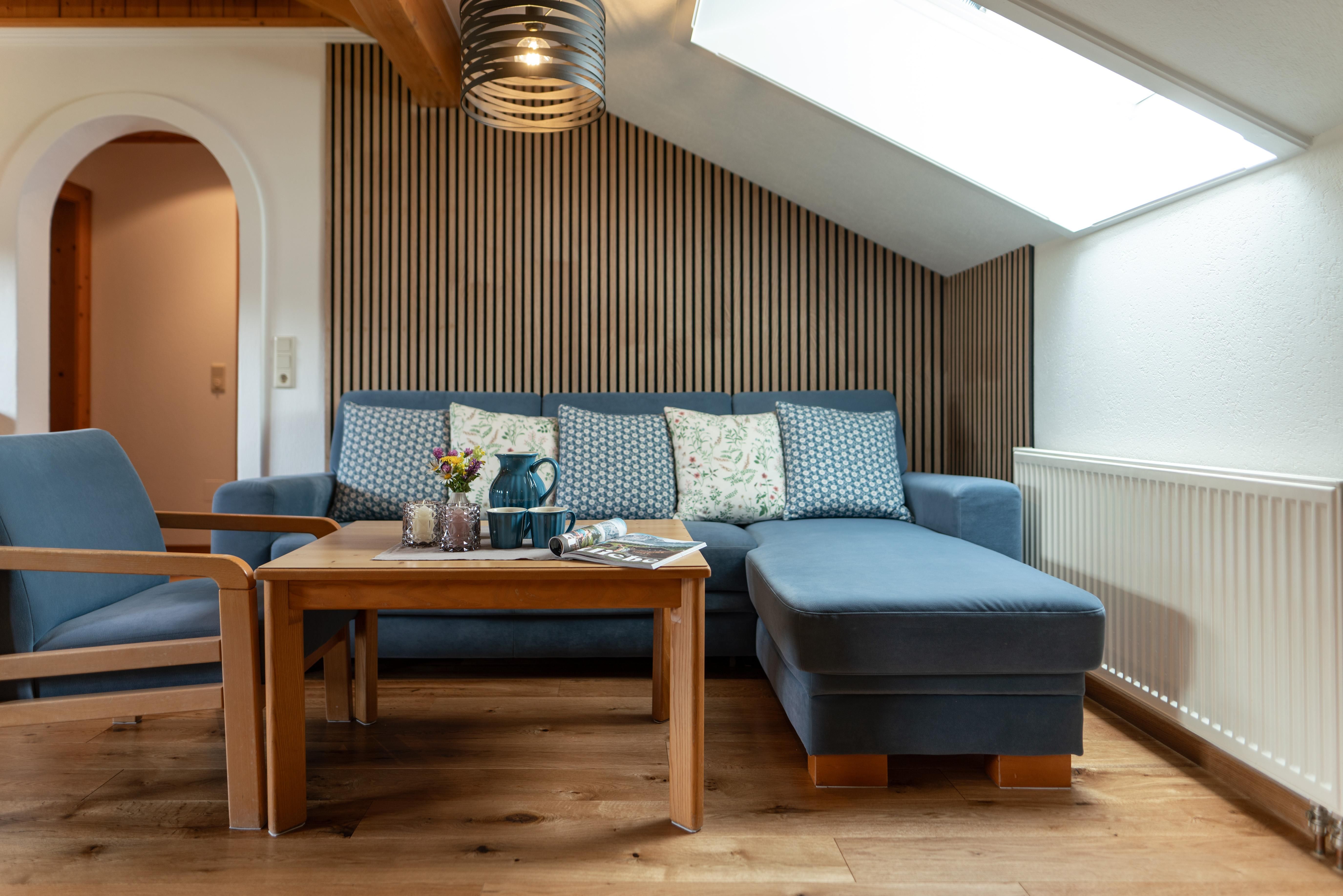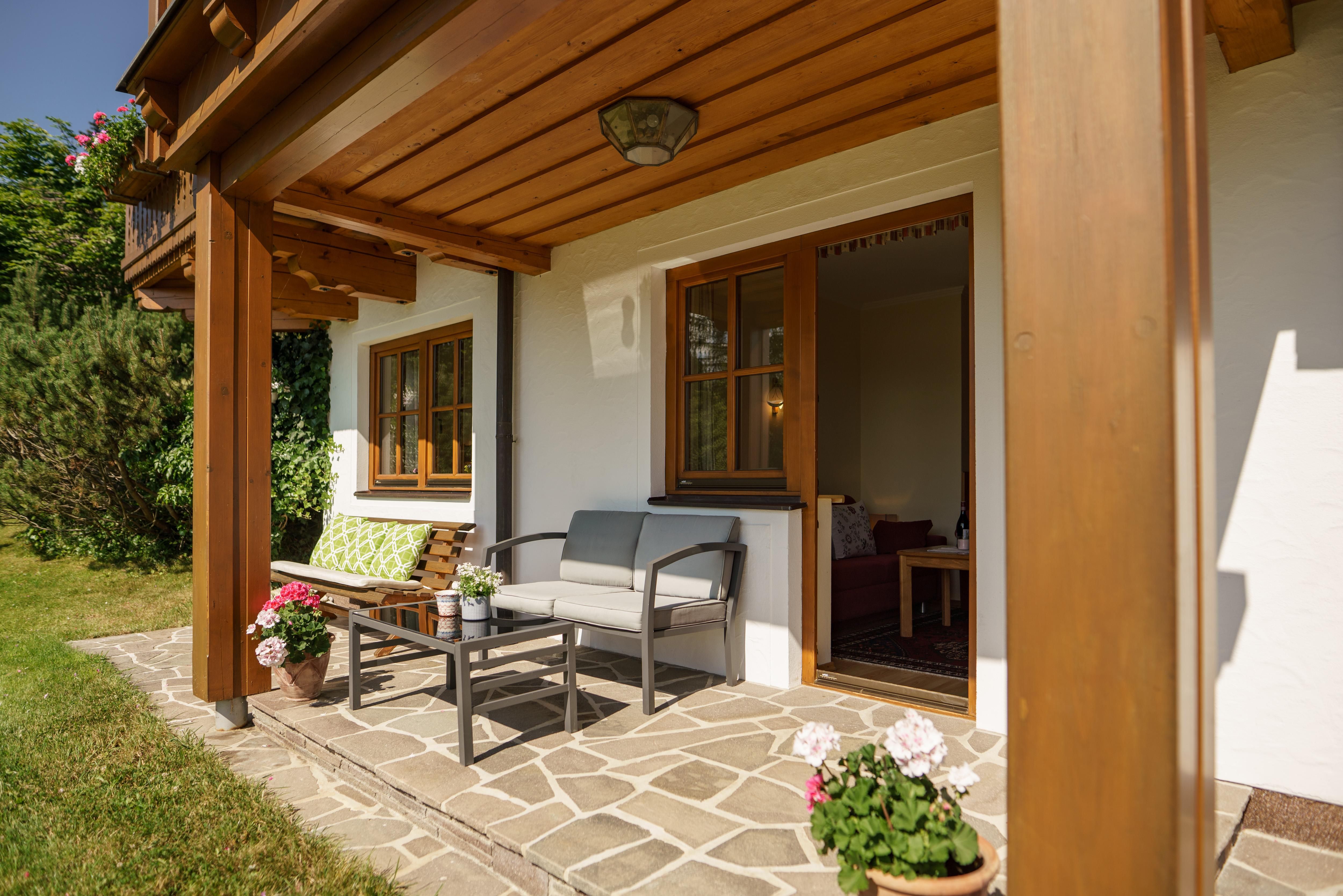 Im Garten ist eine große Liegewiese mit schönen Gartenmöbeln. Hier können unsere Gäste nach der Wanderung so richtig schön entspannen!