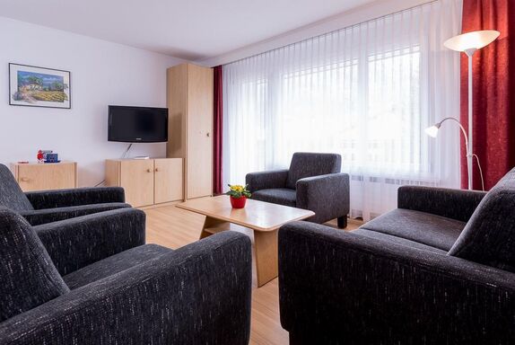 4 Zimmerwohnung (77m2) 1. OG / Nichtraucherwohnung, für Familien und ruhige Personen. Haustiere nicht erlaubt. 3 Schlafzimmer mit 2 Betten, geräumiges Wohnzimmer mit Polstergruppe, separater Küche mit 4 Kochplatten, Backofen, Geschirrspüler, Kühlschrank, Mikrowelle, Kapselkaffeemaschine und Wasserkocher. 1 Bad/WC,