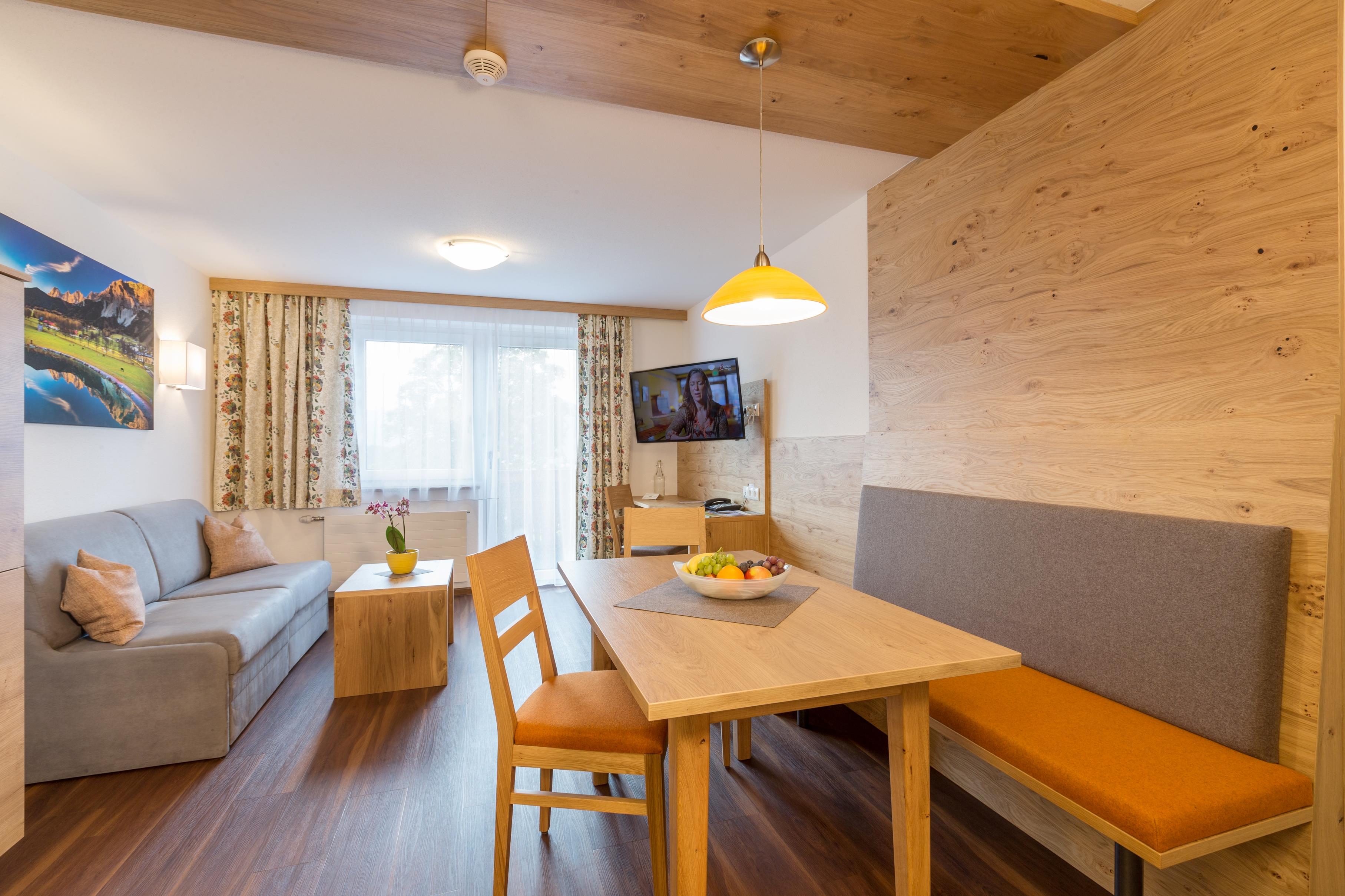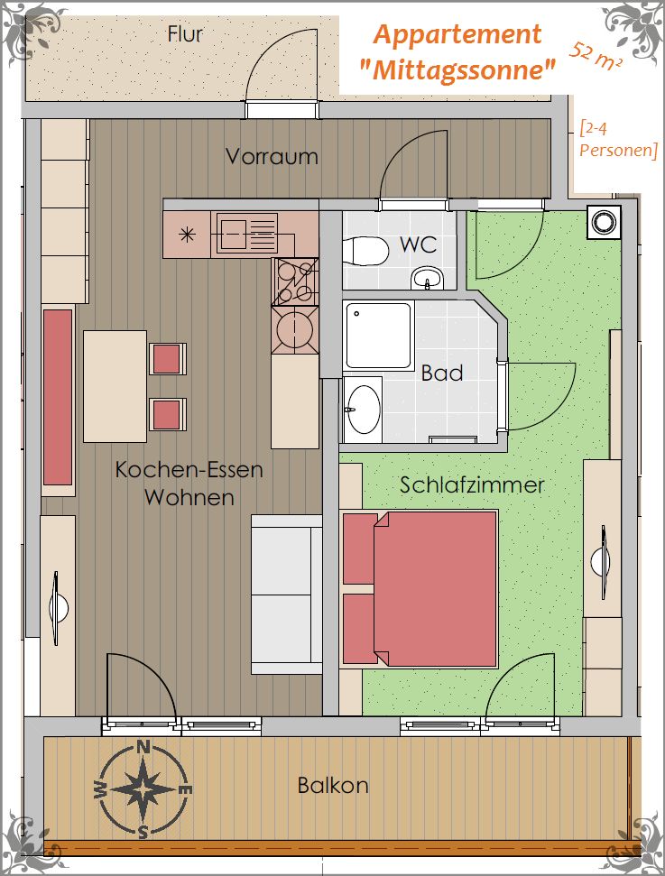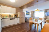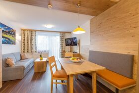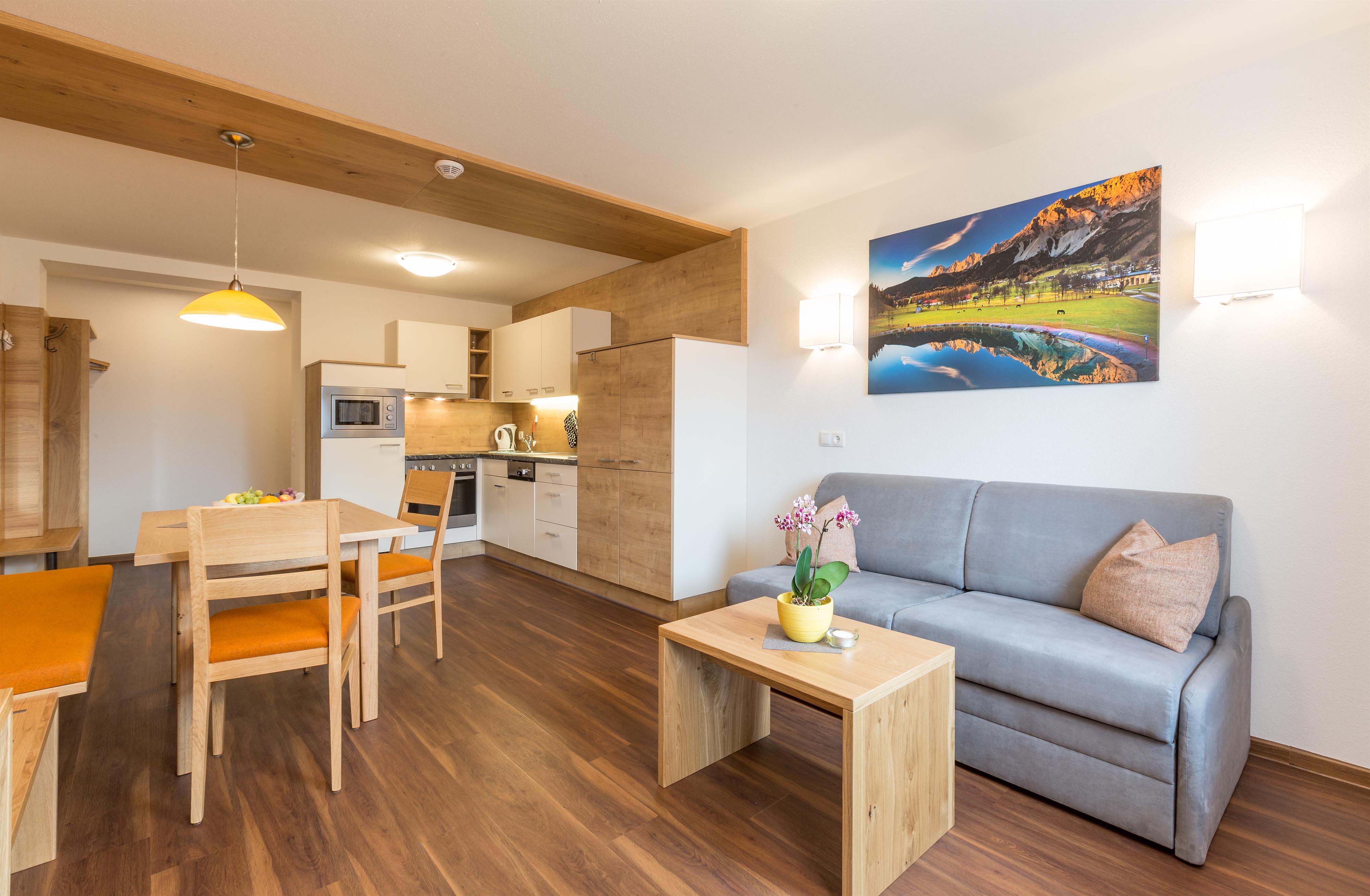 Unser Appartement MITTAGSSONNE bietet 52 m² Wohnfläche. Es erwartet Sie ein helles, gemütliches Schlafzimmer in Topausstattung. Ein modernes Badezimmer mit Dusche, zudem ist ein separates WC vorhanden. Herzstück ist die voll ausgestattete Küche mit geschmackvollem Wohnraum, welcher zum Entspannen einlädt. Großer Balkon nach Süden, mit Sonne den ganzen Tag und grandiosem Blick auf die Schladminger Tauern. Standardbelegung: 2 Personen, maximal 4 Personen (Couchbett)