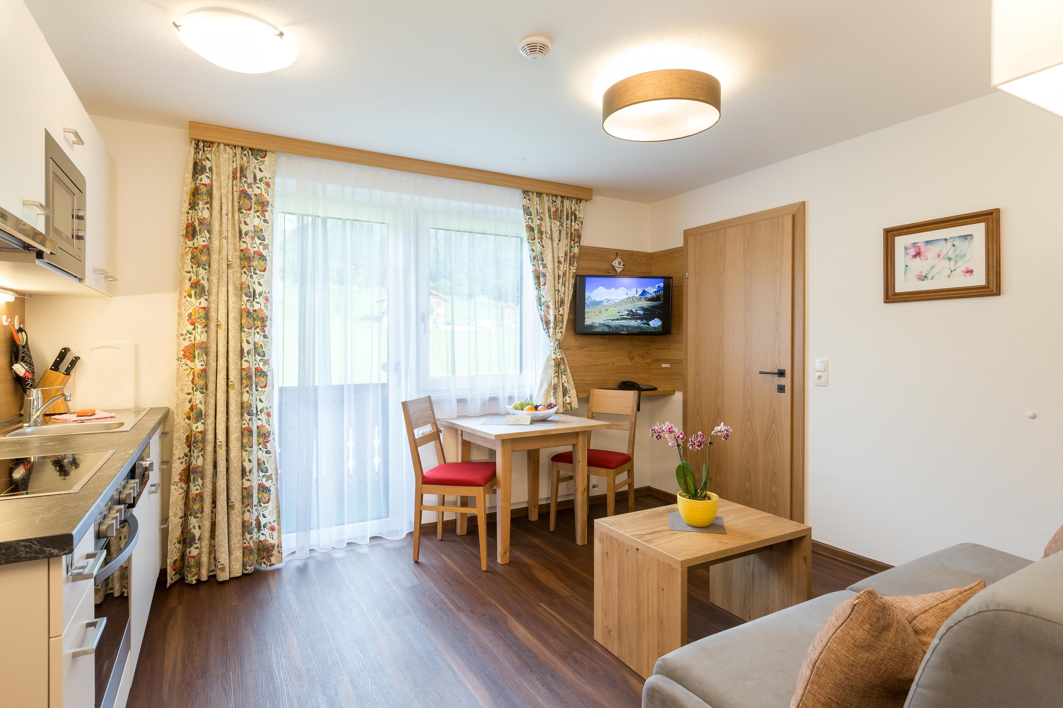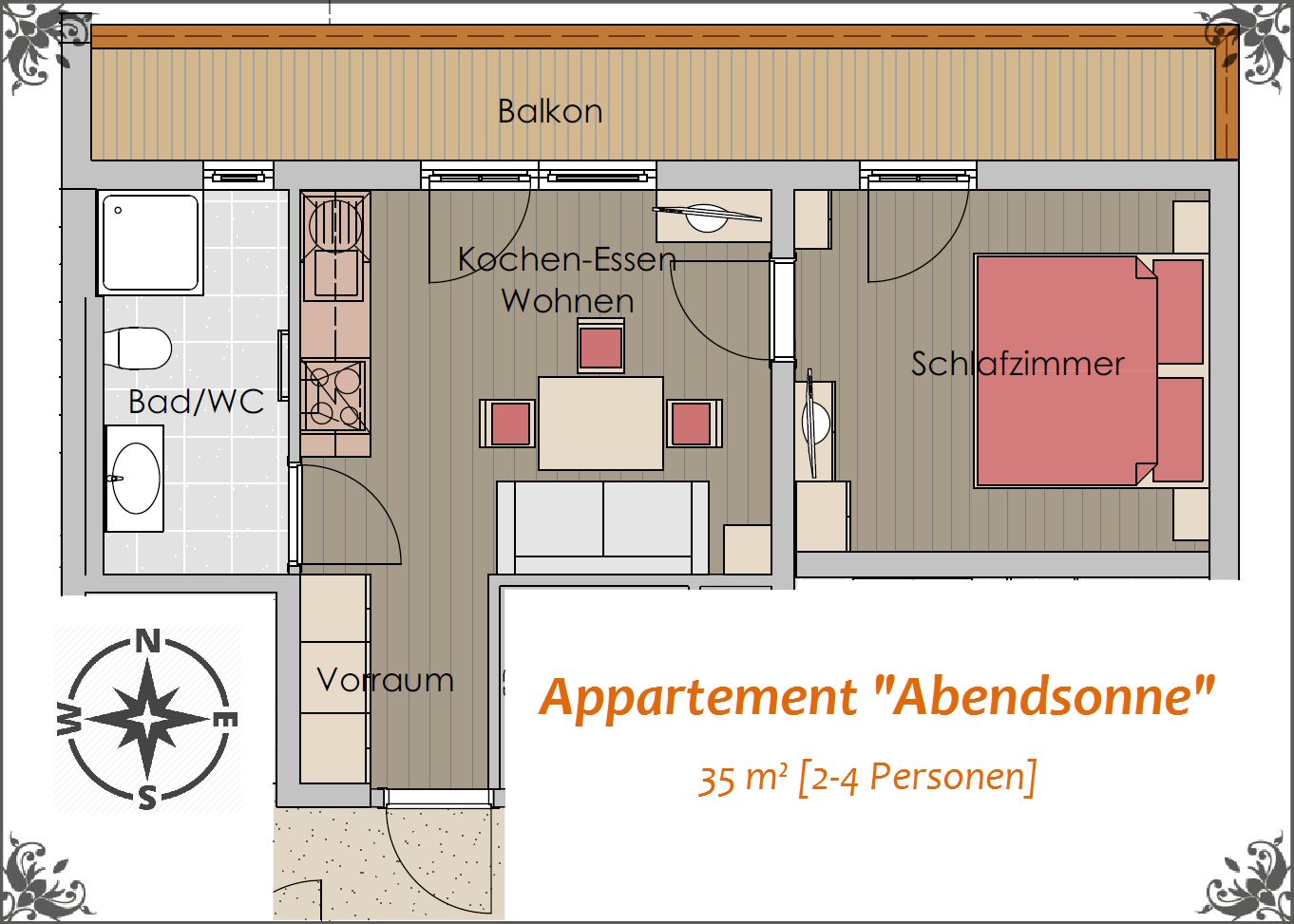 Unser Appartement ABENDSONNE beschert unseren Gästen mit 35 m² Wohnfläche einen komfortablen Urlaub in den Bergen.