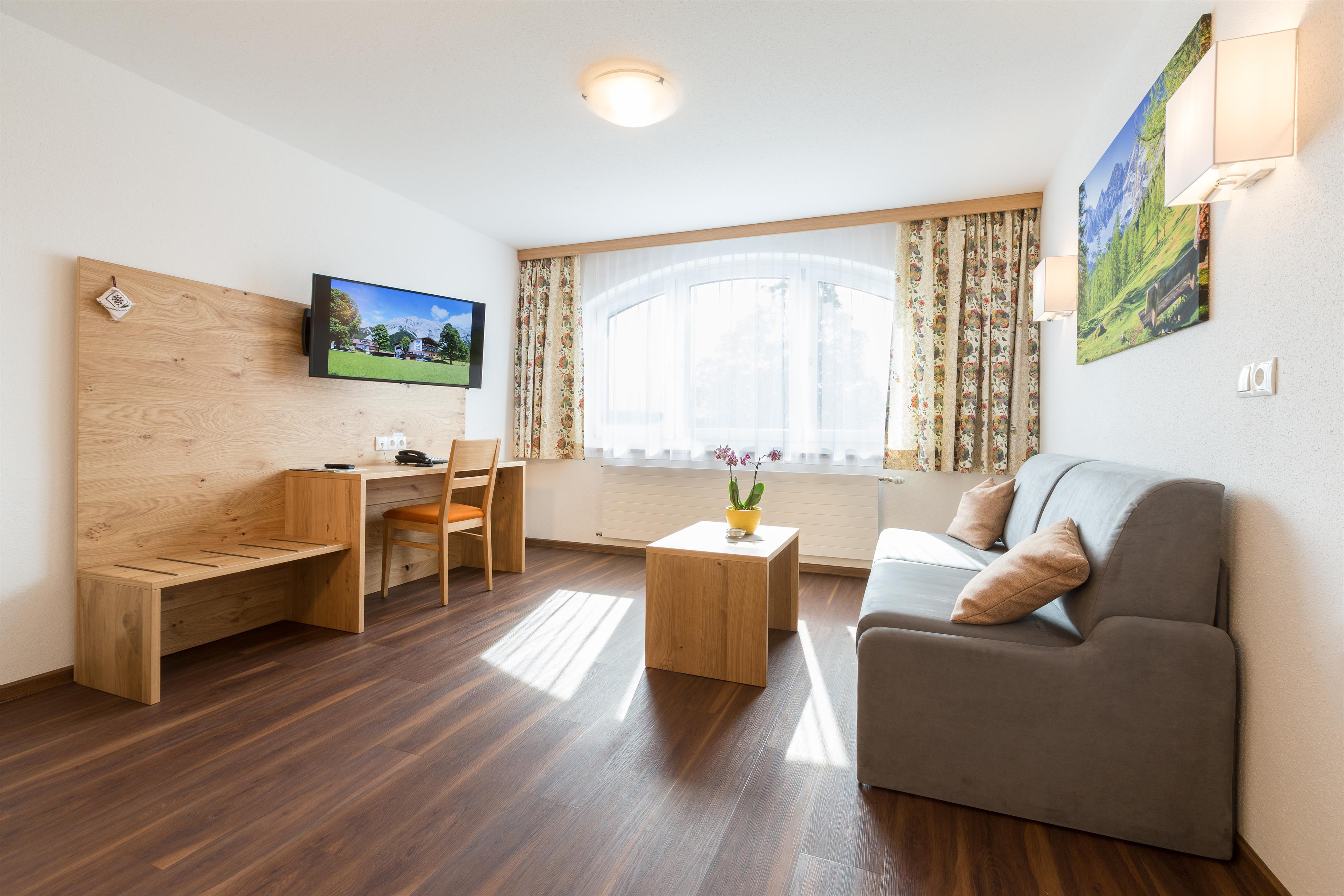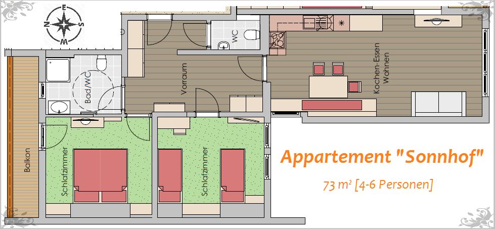 Unser Appartement SONNHOF bietet mit 73 m² für 4 - 6 Personen Erholung pur. Hier sorgen 2 charmante Schlafzimmer für erholsame Nächte (eines davon mit verschiebbarem Bett). Großzügiges, auch rollstuhlgerechtes Badezimmer mit begehbarer Dusche und WC. Zusätzlich steht Ihnen ein 2. WC im Vorraum zur Verfügung. Genussreiche Stunden erwarten Sie im gemütlichen Wohn-Esszimmer mit vollausgestatteter Küche – perfekt für gemeinsames Kochvergnügen. Balkon mit herrlichem Blick auf das Dachsteinmassiv. Standardbelegung: 4 Personen, maximal 6 Personen (Couchbett)