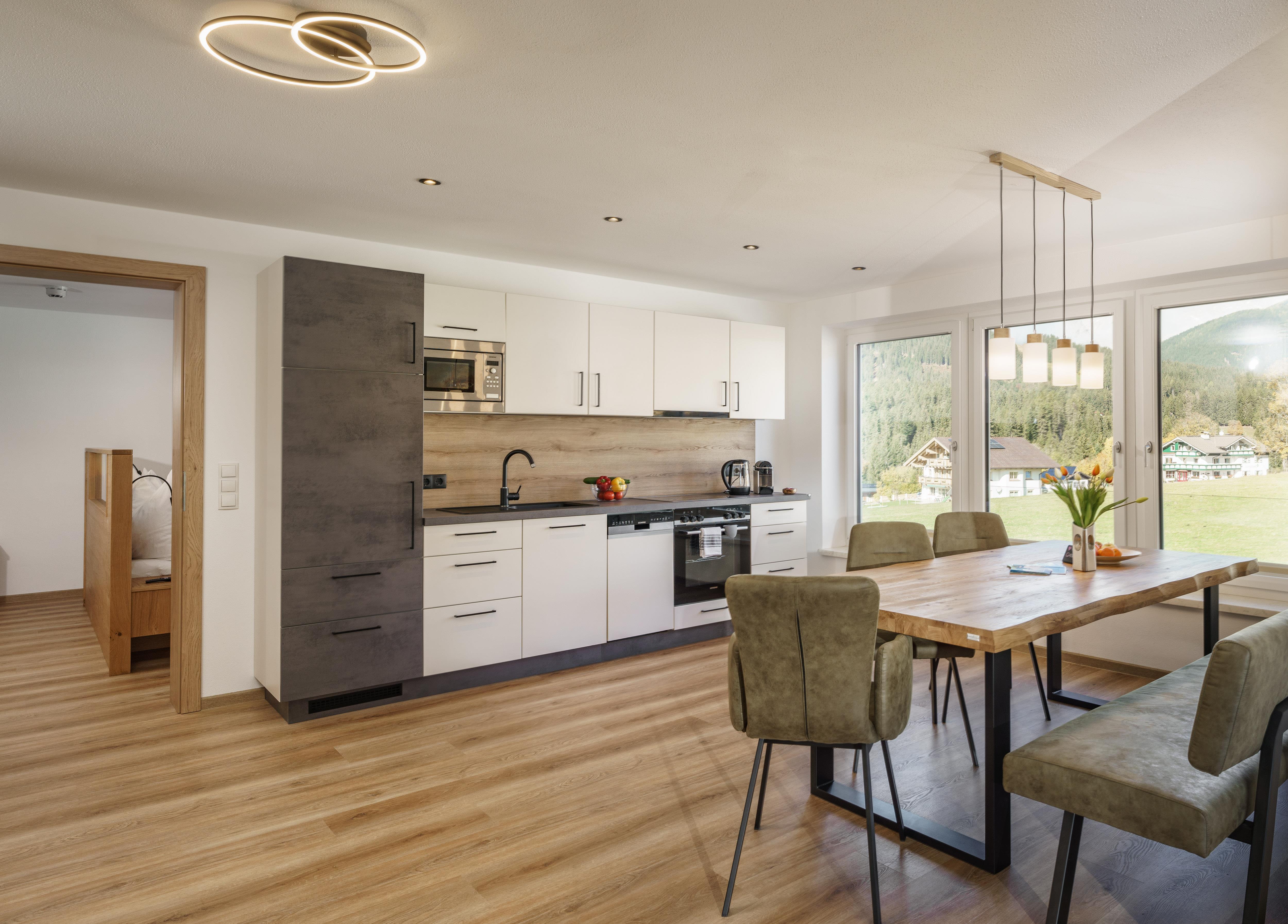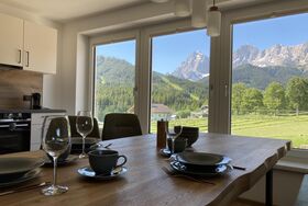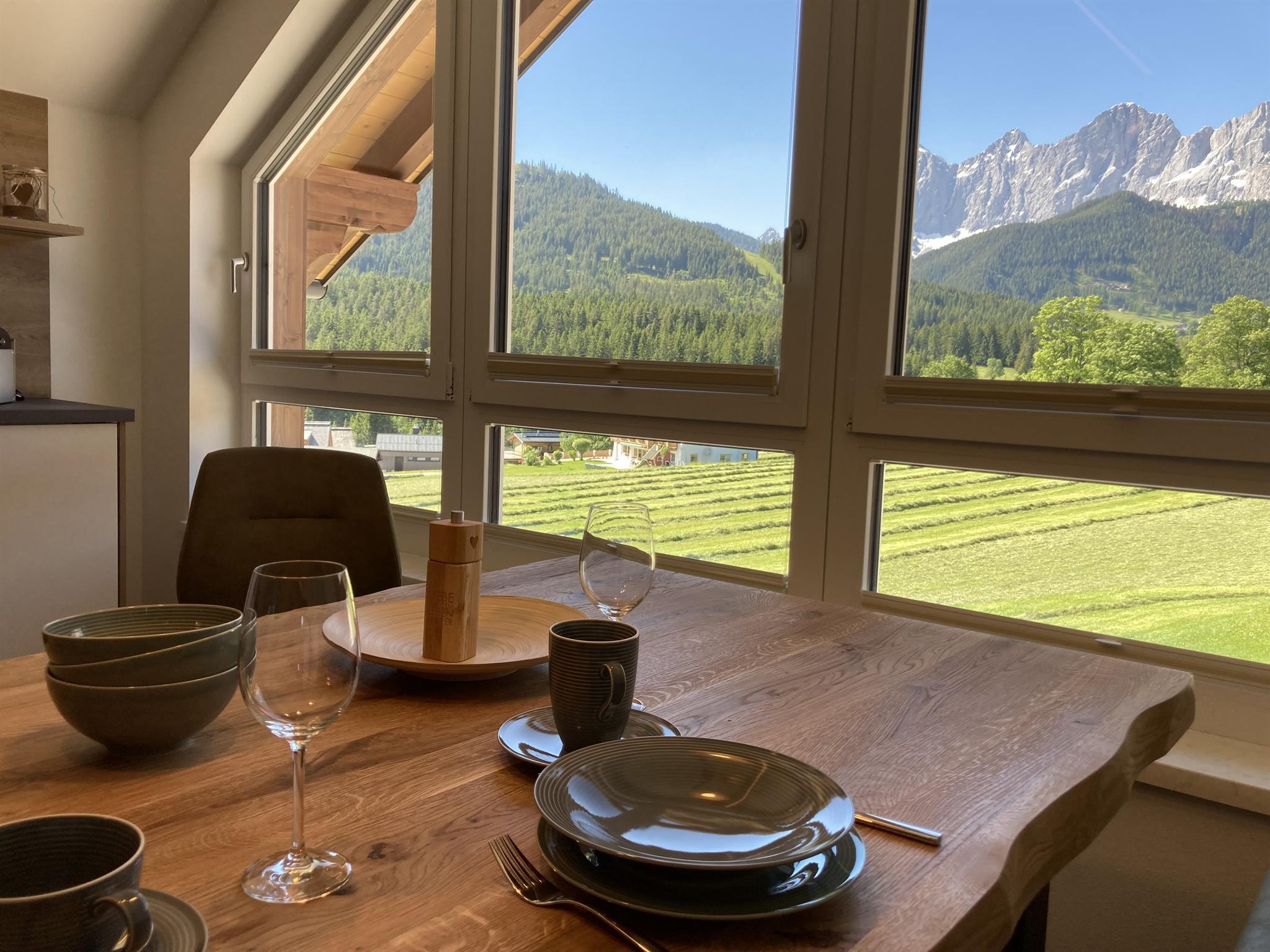 • voll ausgestattete Küche mit großem Esstisch und Blick auf den Dachstein