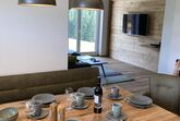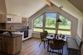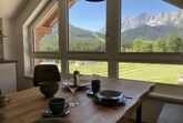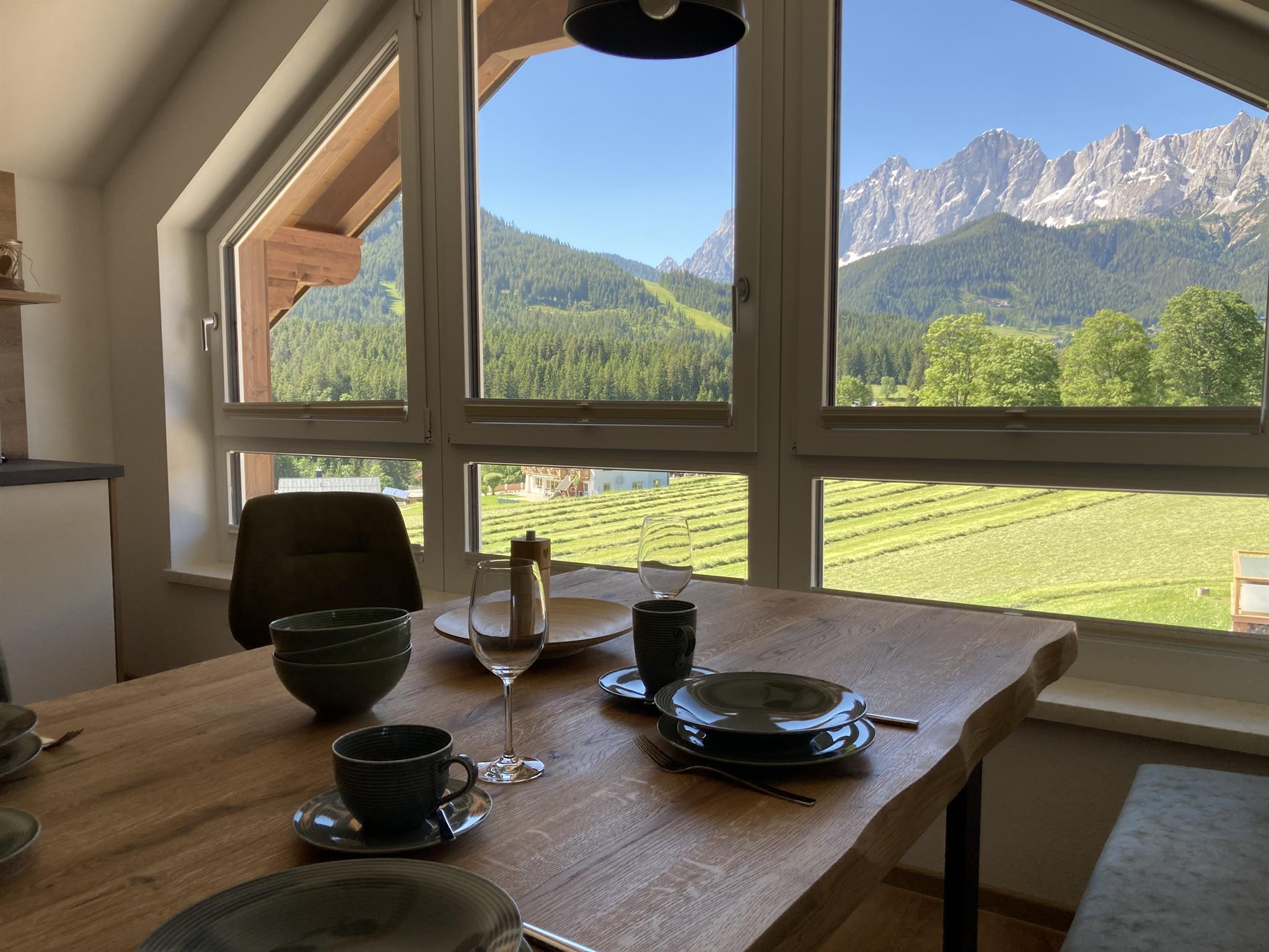 • voll ausgestattete Küche mit großem Esstisch und Blick auf den Dachstein