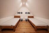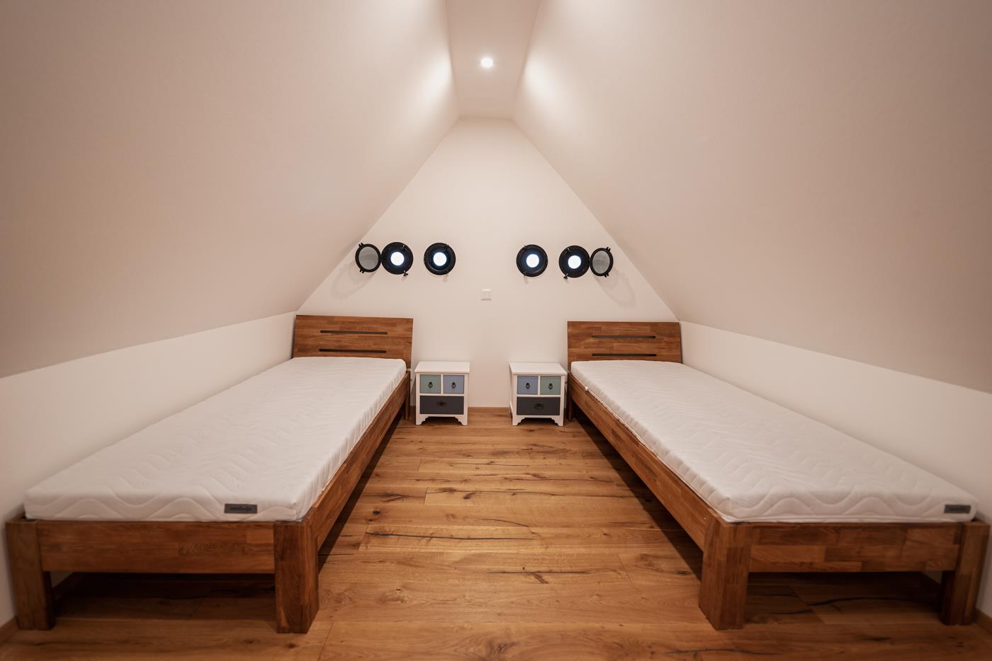 Im Untergeschoß steht Ihnen außerdem ein Dreibettzimmer, ein Badezimmer mit Dusche und ein WC zur Verfügung. Im Obergeschoß befindet sich ein weiteres Dreibettzimmer mit offener Galerie mit zwei Einzelbetten sowie ein zweites Badezimmer.