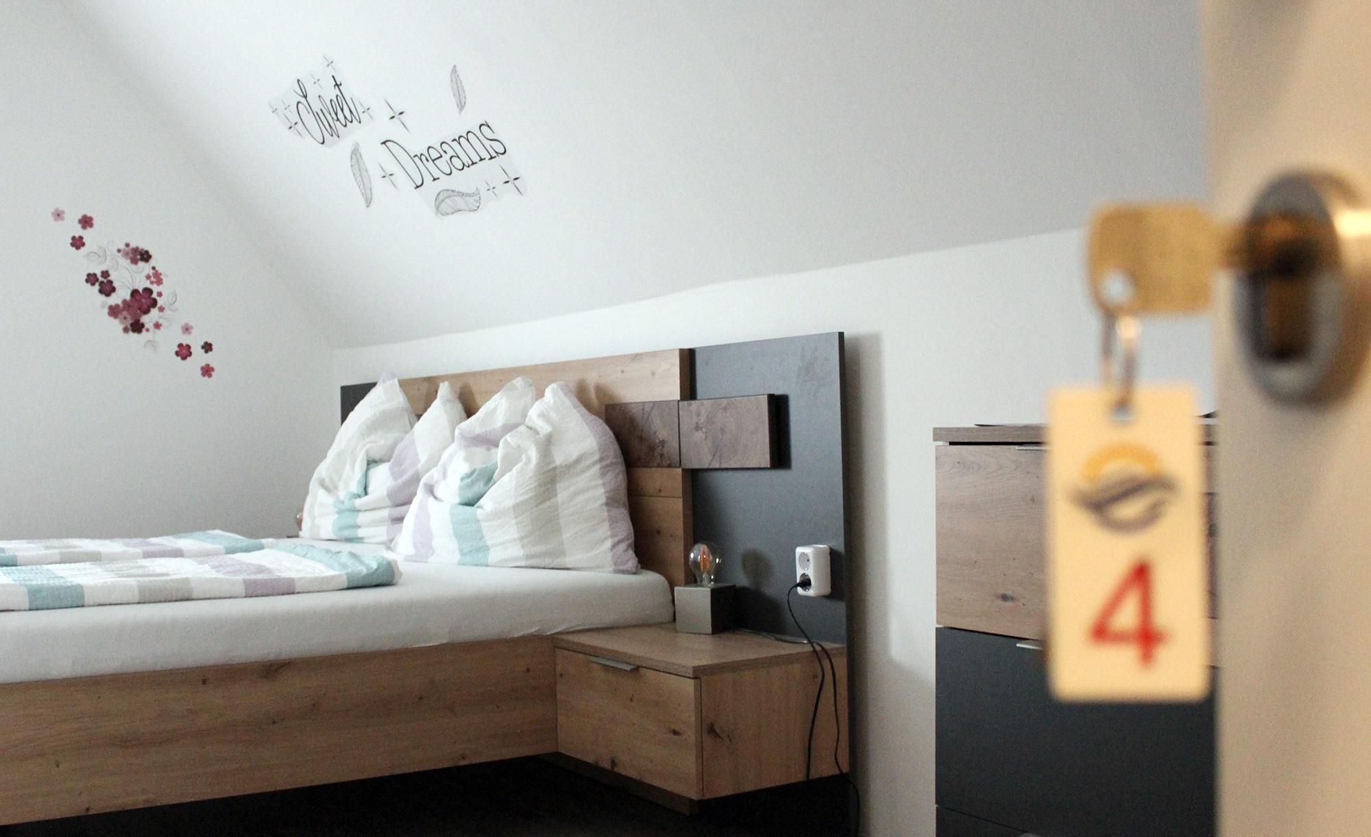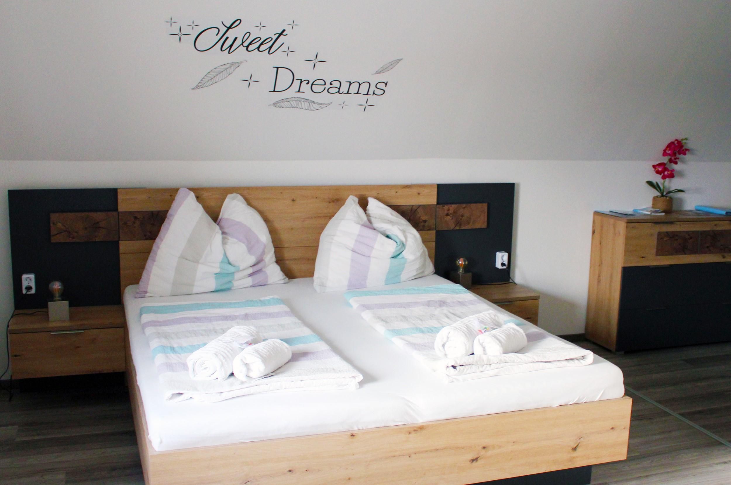 Unsere Doppelzimmer sind mit Doppelbett, TV, Bad mit Dusche und WC und einem Balkon ausgestattet & Wlan inklusive.
