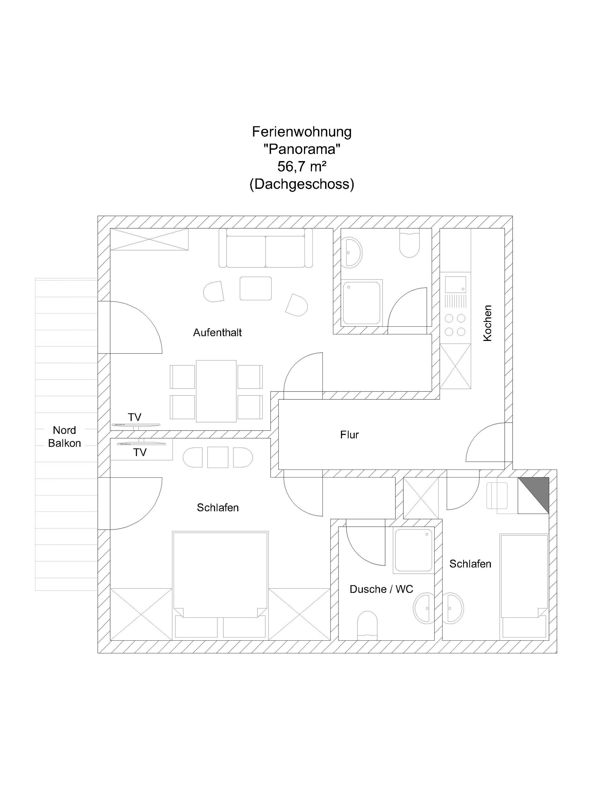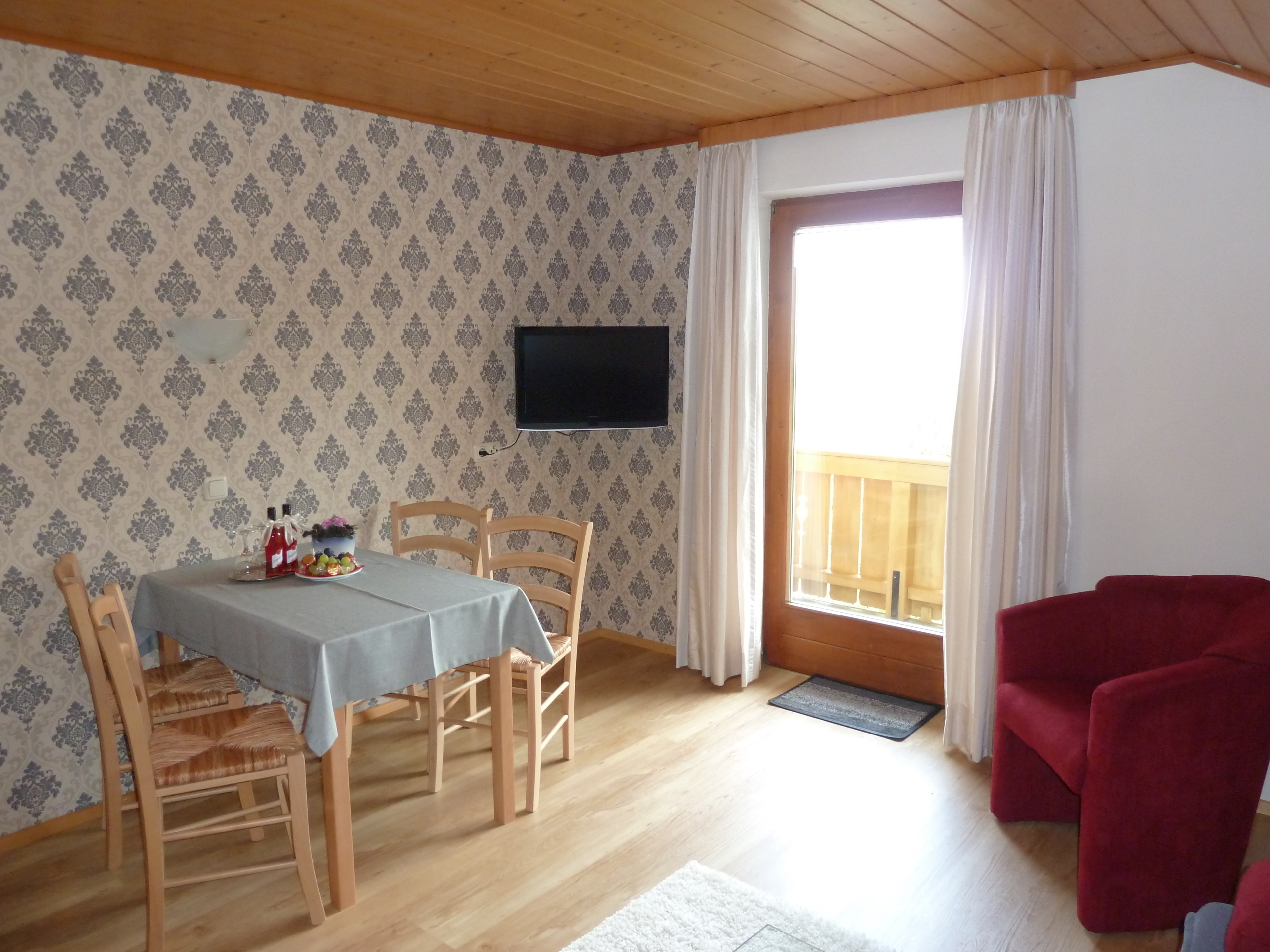 Wohnzimmer mit Essecke, Ausziehcouch mit Lattenrost für 4. Person, LCD-SAT-TV sowie ein DU/WC mit Fön, Kosmetikspiegel, Toilettenartikel und Bademäntel. Vom Balkon aus genießen Sie die Abendsonne mit herrlichen Ausblick.