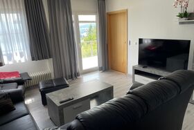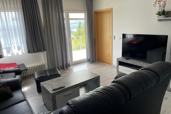 Wohn-/Esszimmer: große Polstersitzgruppe mit Schlafcouch, Essgruppe, TV, WLAN-Internetanschluss