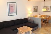 Das hell und freundlich eingerichtete Wohnzimmer lädt ein, sich wohl zu fühlen. Die Sitzgruppe bietet Platz für alle Gäste und verfügt über eine Schlafcouch. Fernseher und Radio gehören ebenfalls zur Ausstattung dieses Hauses. Vom Wohnzimmer aus gelangen Sie direkt auf Ihre Terrasse. Grillen mit Ihrem eigenen Grill ist gestattet. Der direkt angrenzende Essbereich bietet Platz für Ihre gemeinsamen Mahlzeiten und gemütliche Abende.